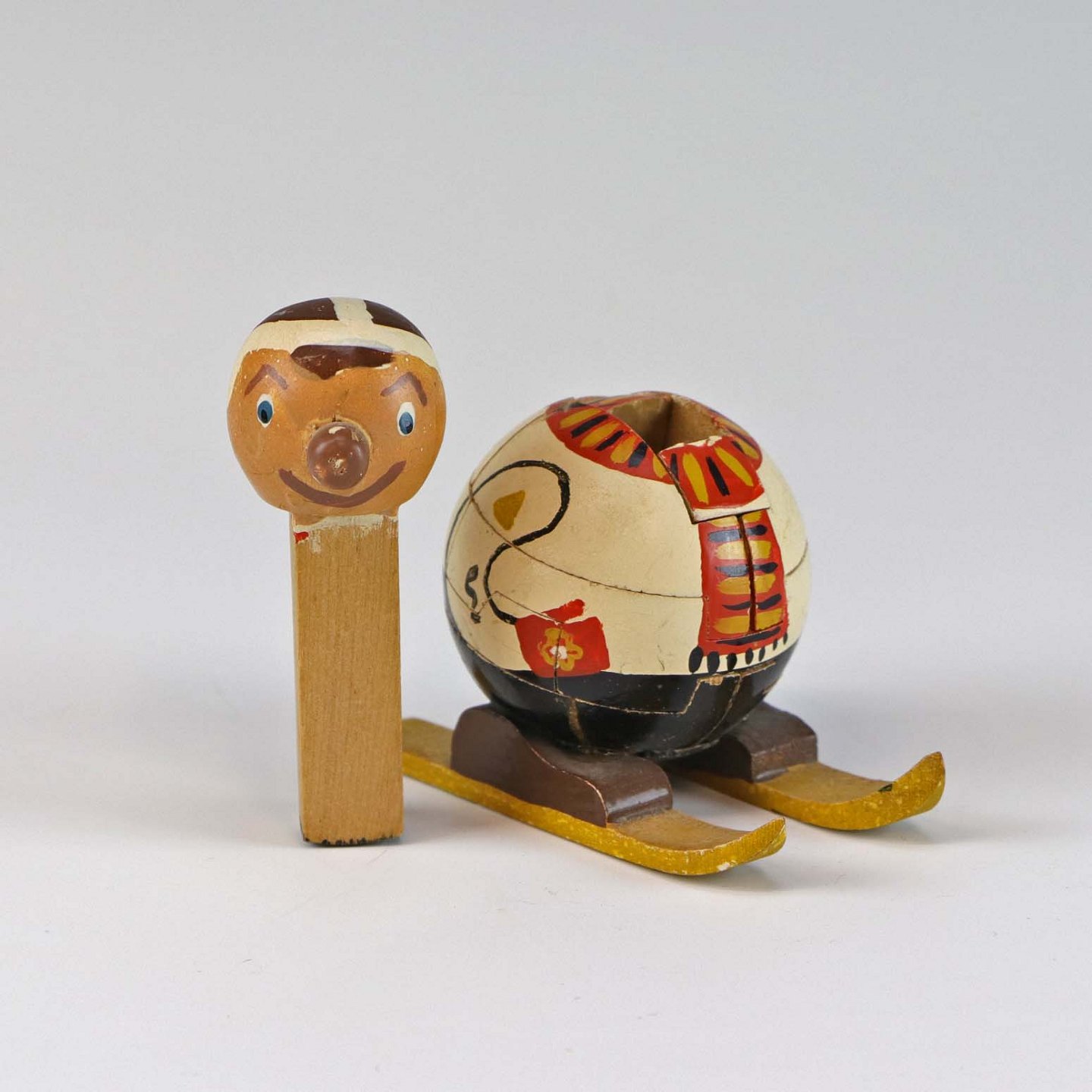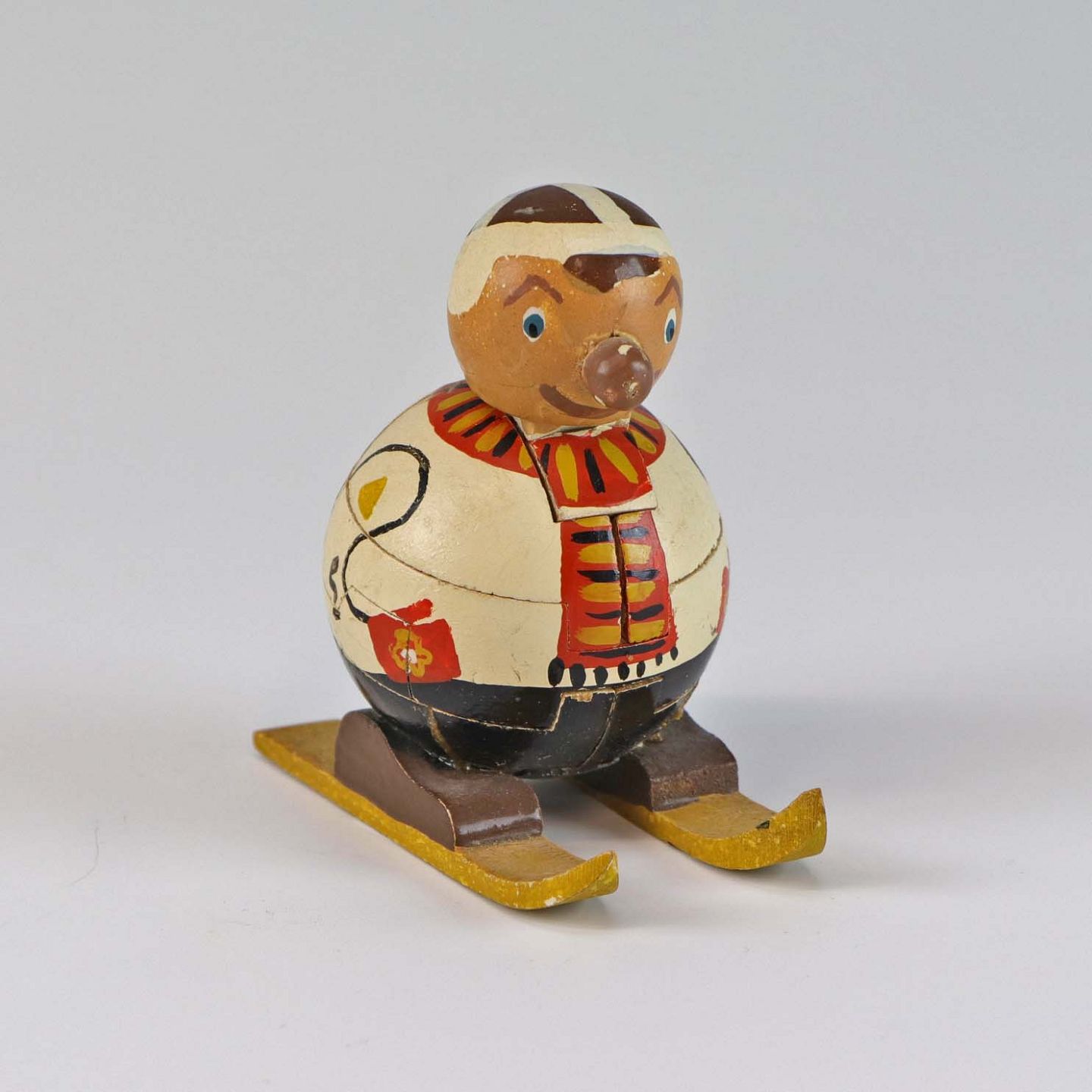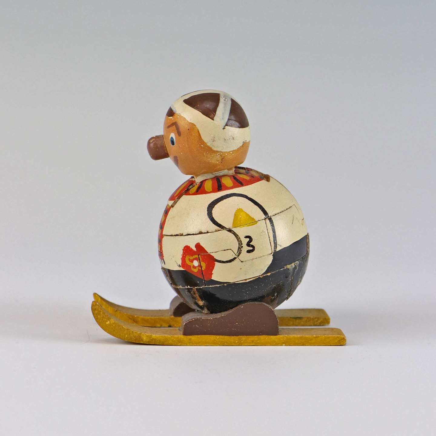 Puslespilsfigur af malet træ. Forestiller en mand på ski