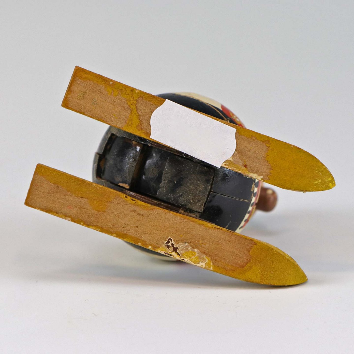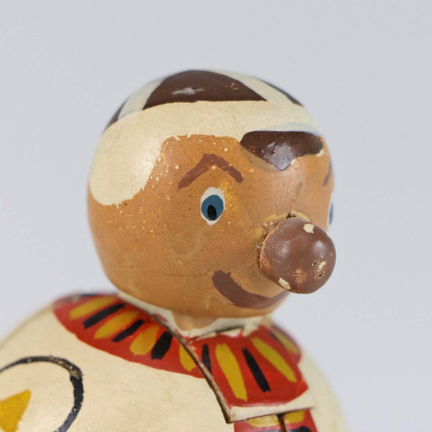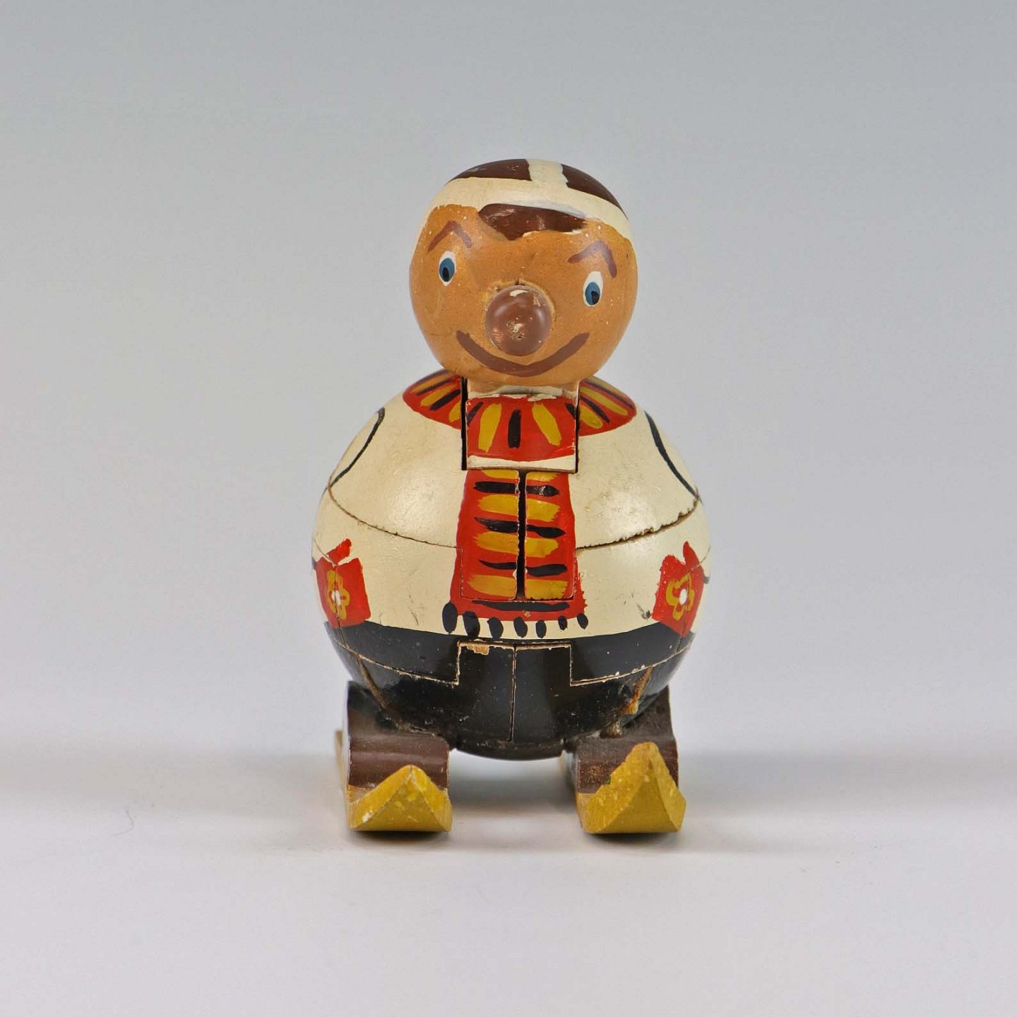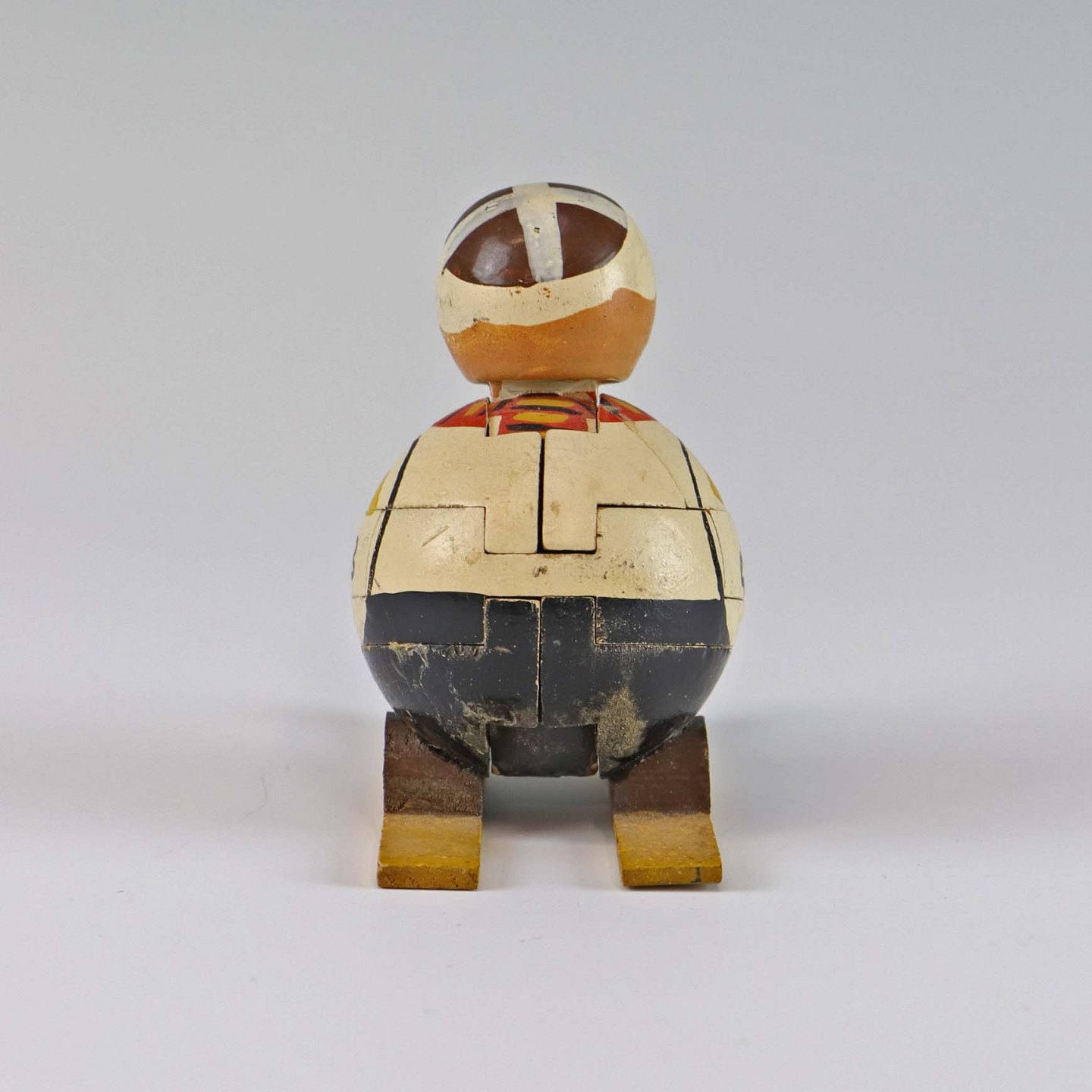 Puslespilsfigur af malet træ. Forestiller en mand på ski