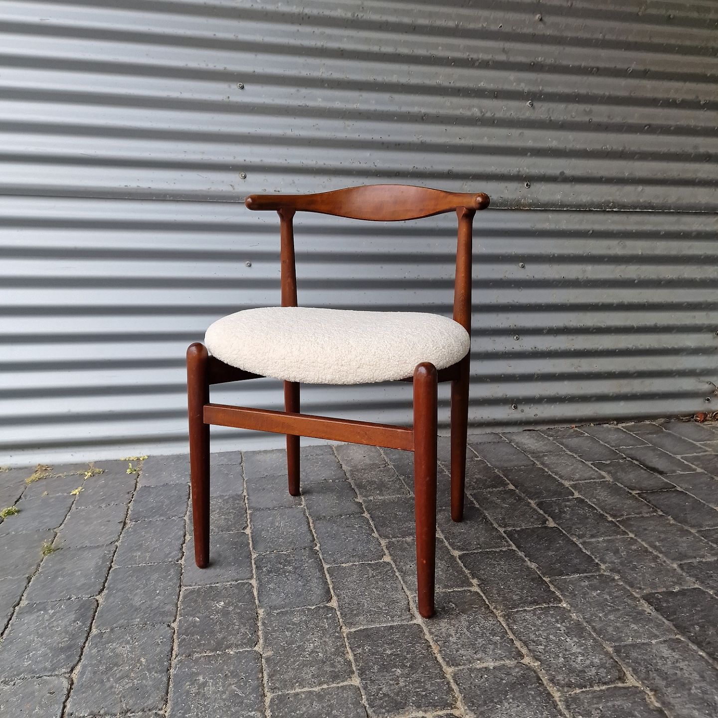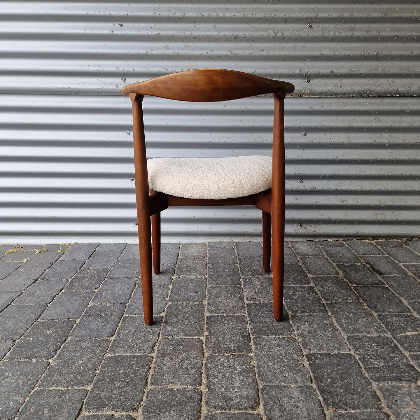 Stol af teaktræ med imiteret lammeskind på sædet. Forgivet i 1949
