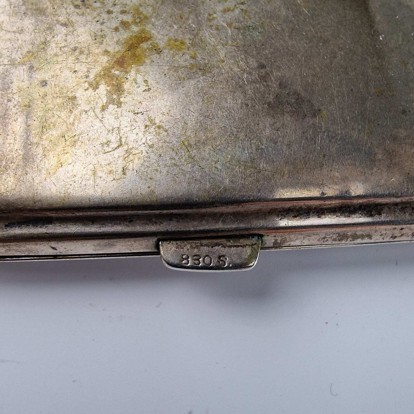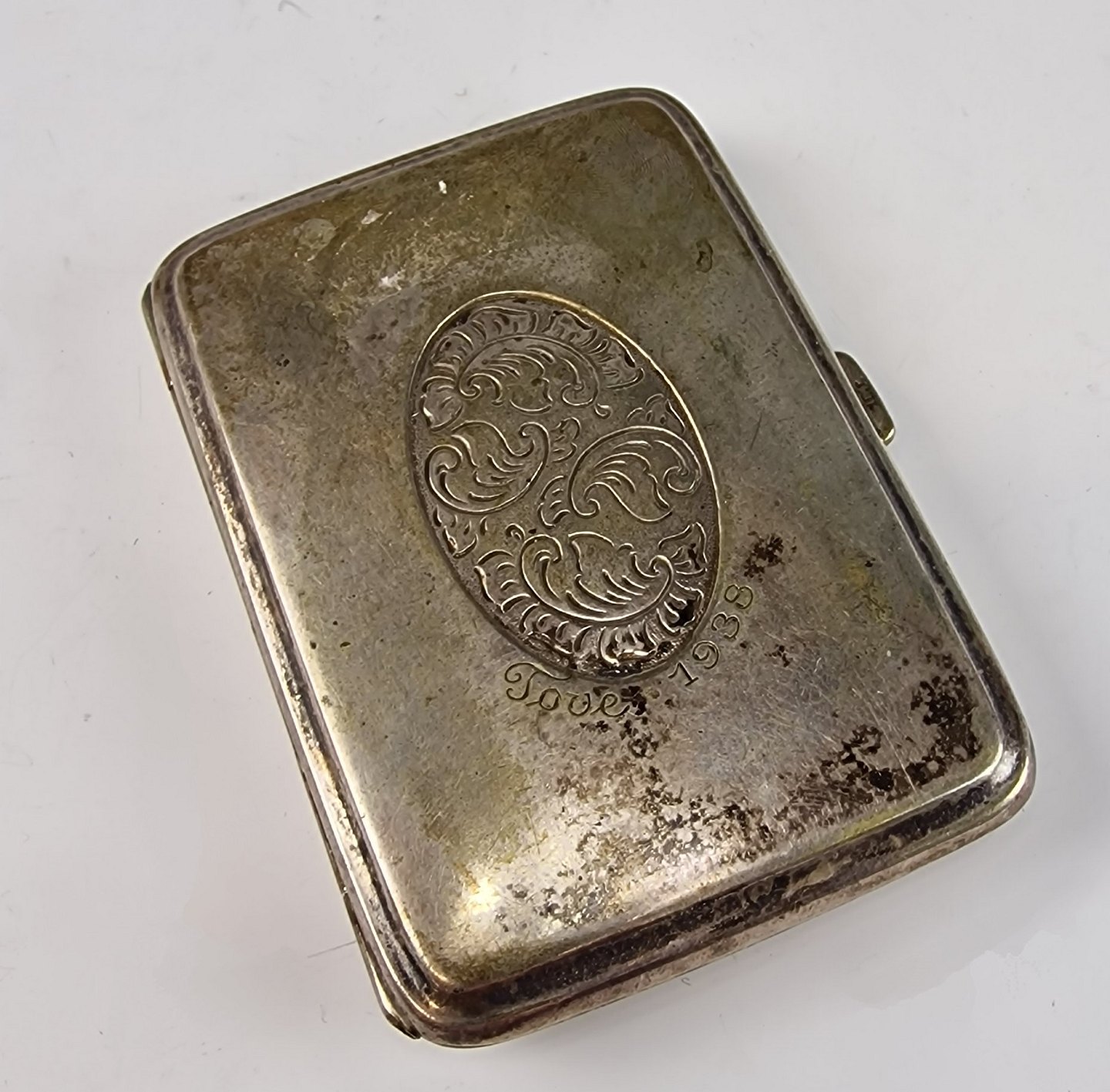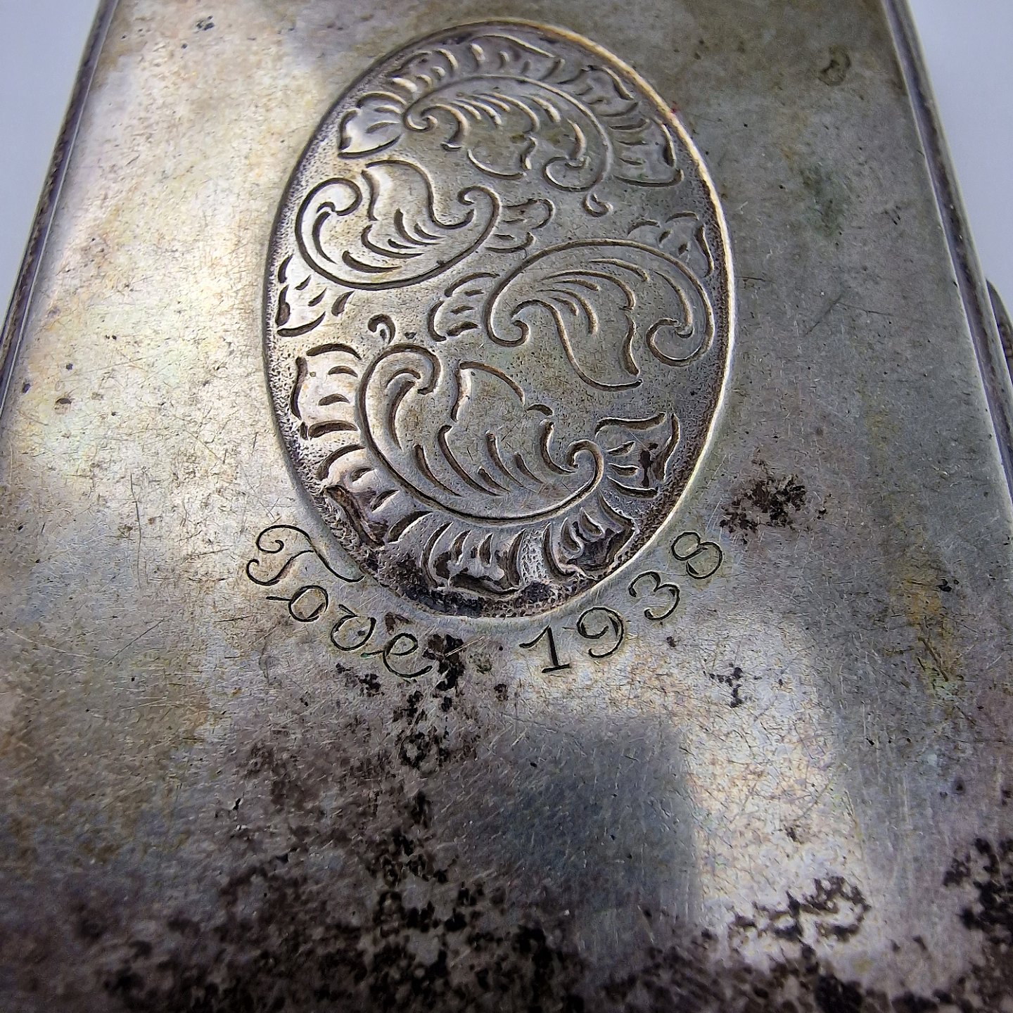 Cigaretetui med klik lås i sølv. Indgravet mønster og Tove 1938