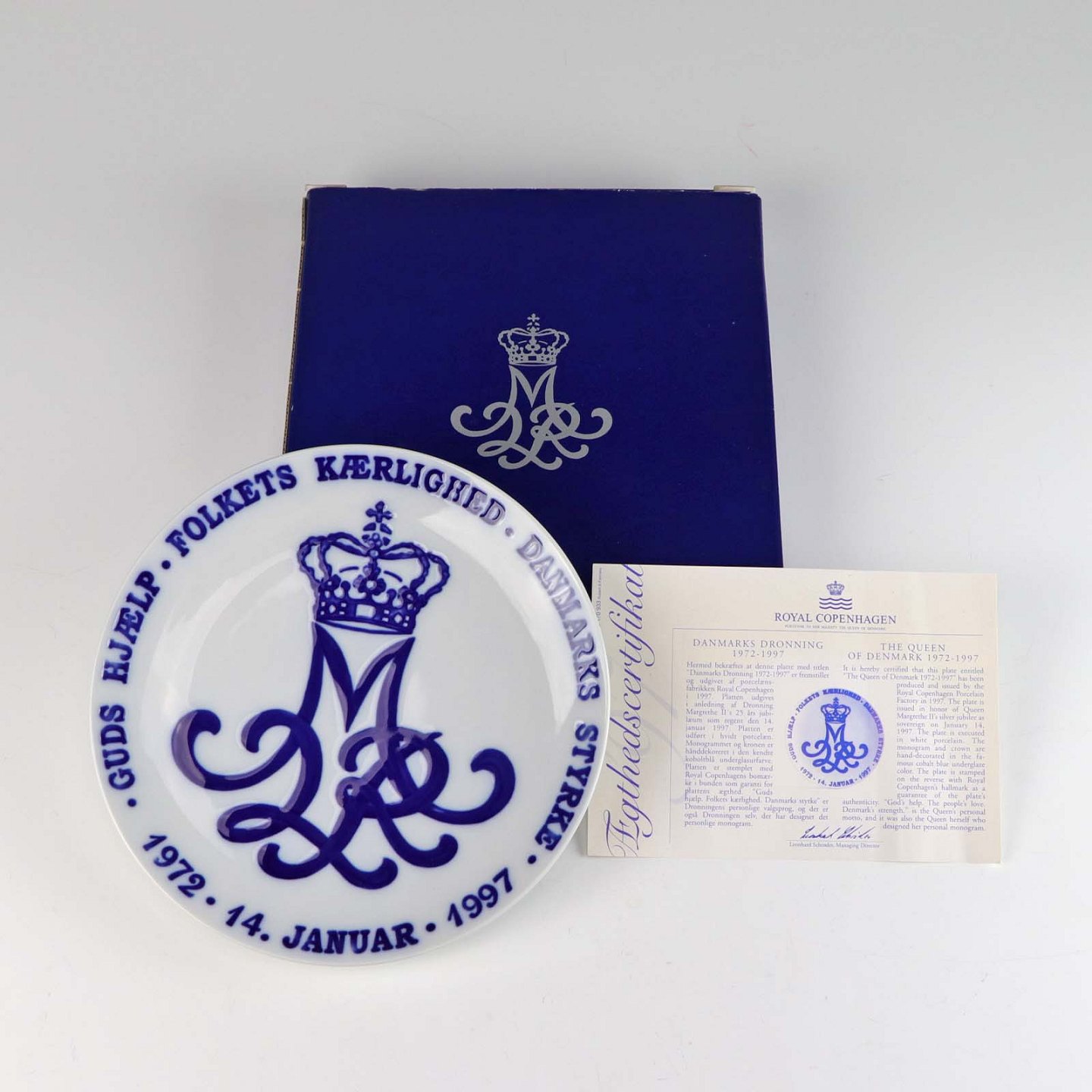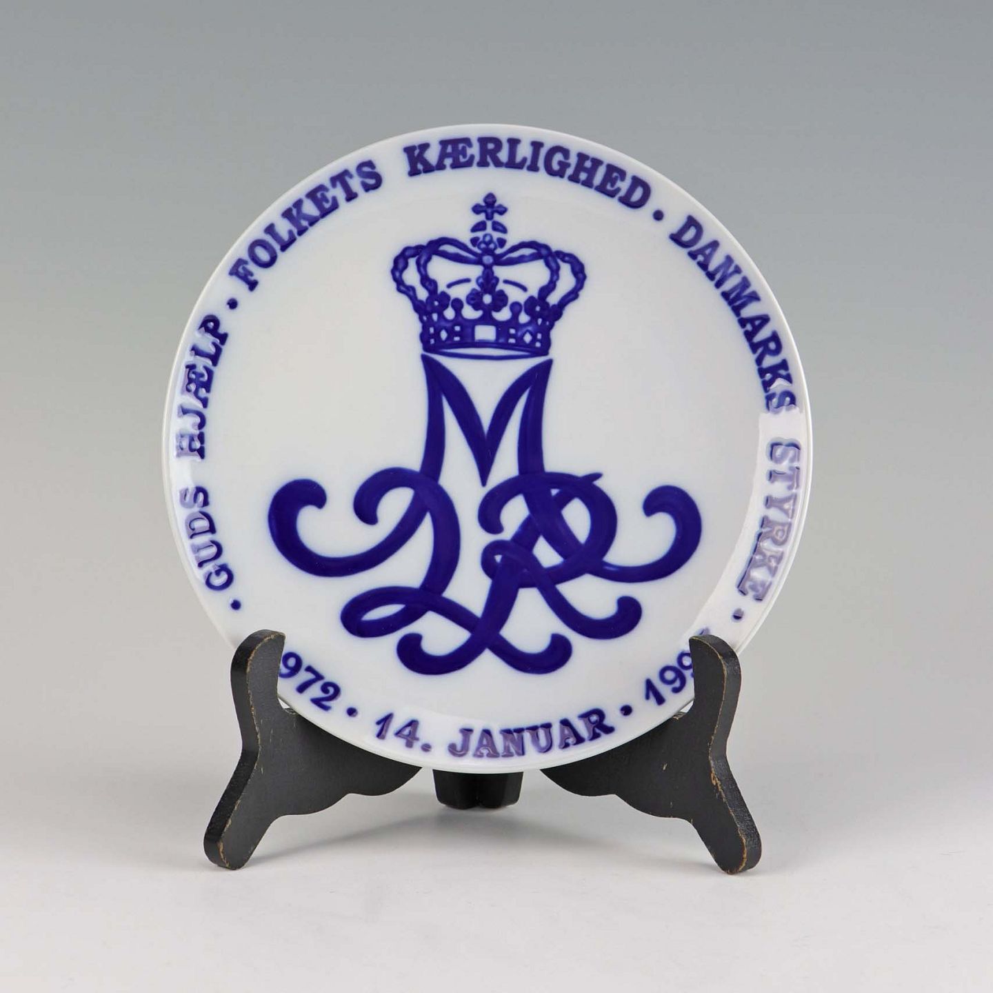 Jubilæumsplatte af porcelæn, lavet i anledningen af Dronning Margrethe´s 25 års jubilæum som regent år 1972 - 1997