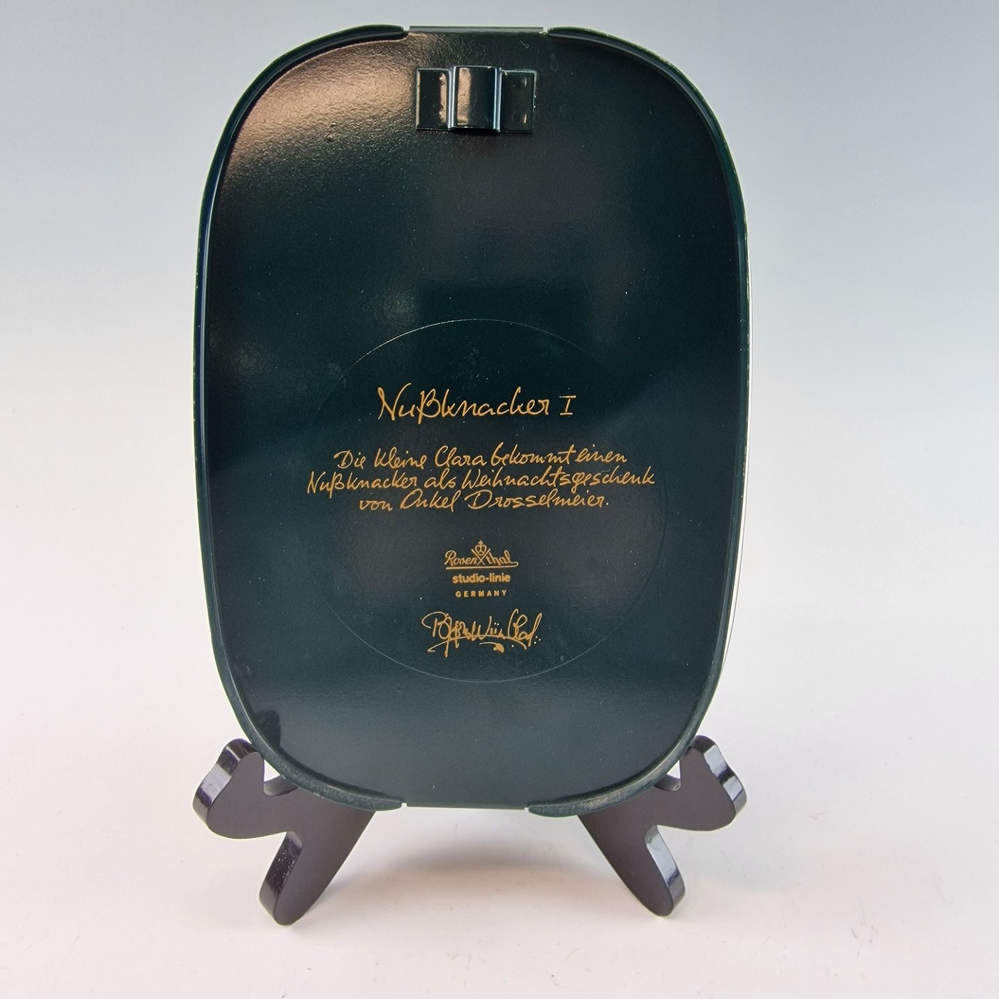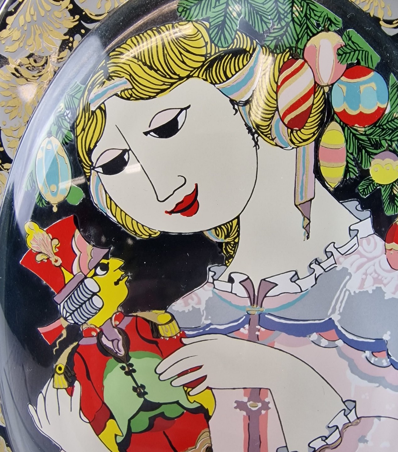 Sjælden glasplatte-serie lagt i farver under beskyttende metalbaggrund. Forestiller eventyret "Nøddeknækkeren" hvor Clara sidder med nøddeknækkeren