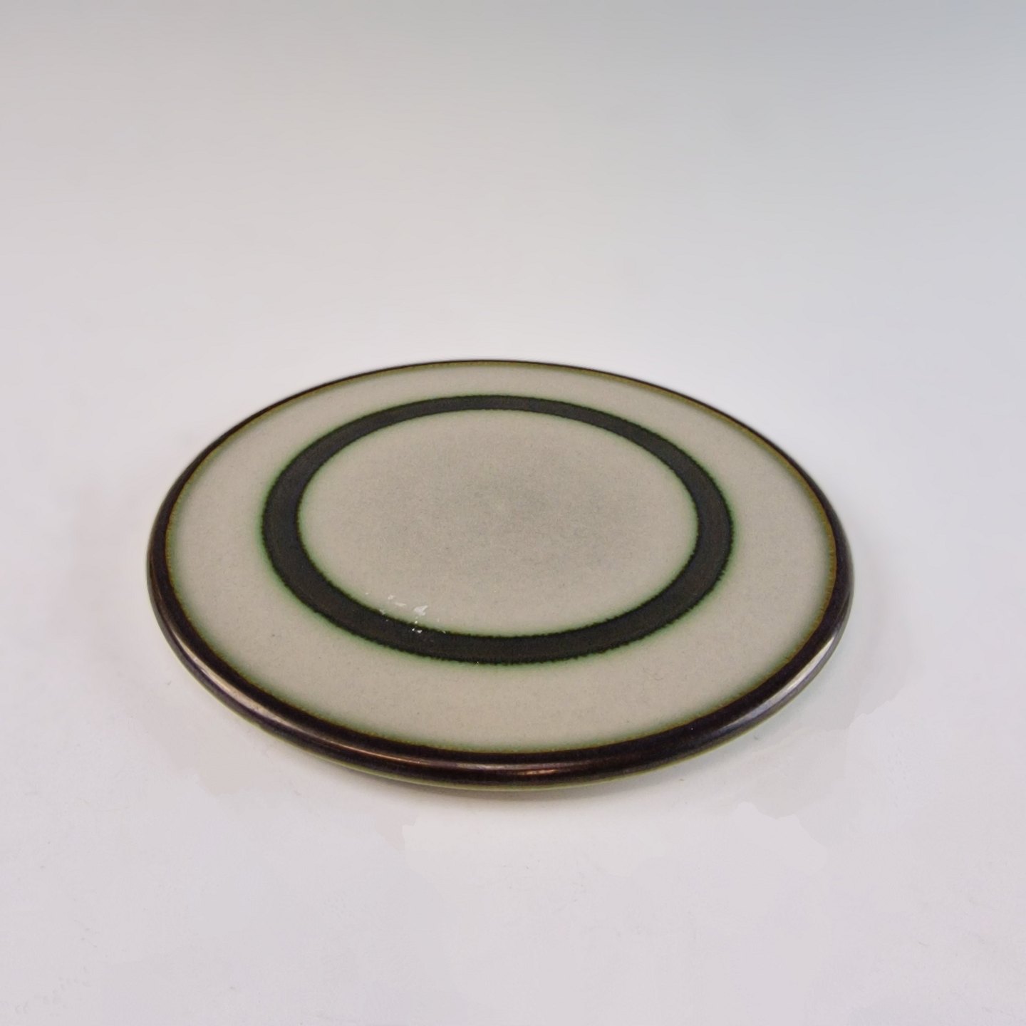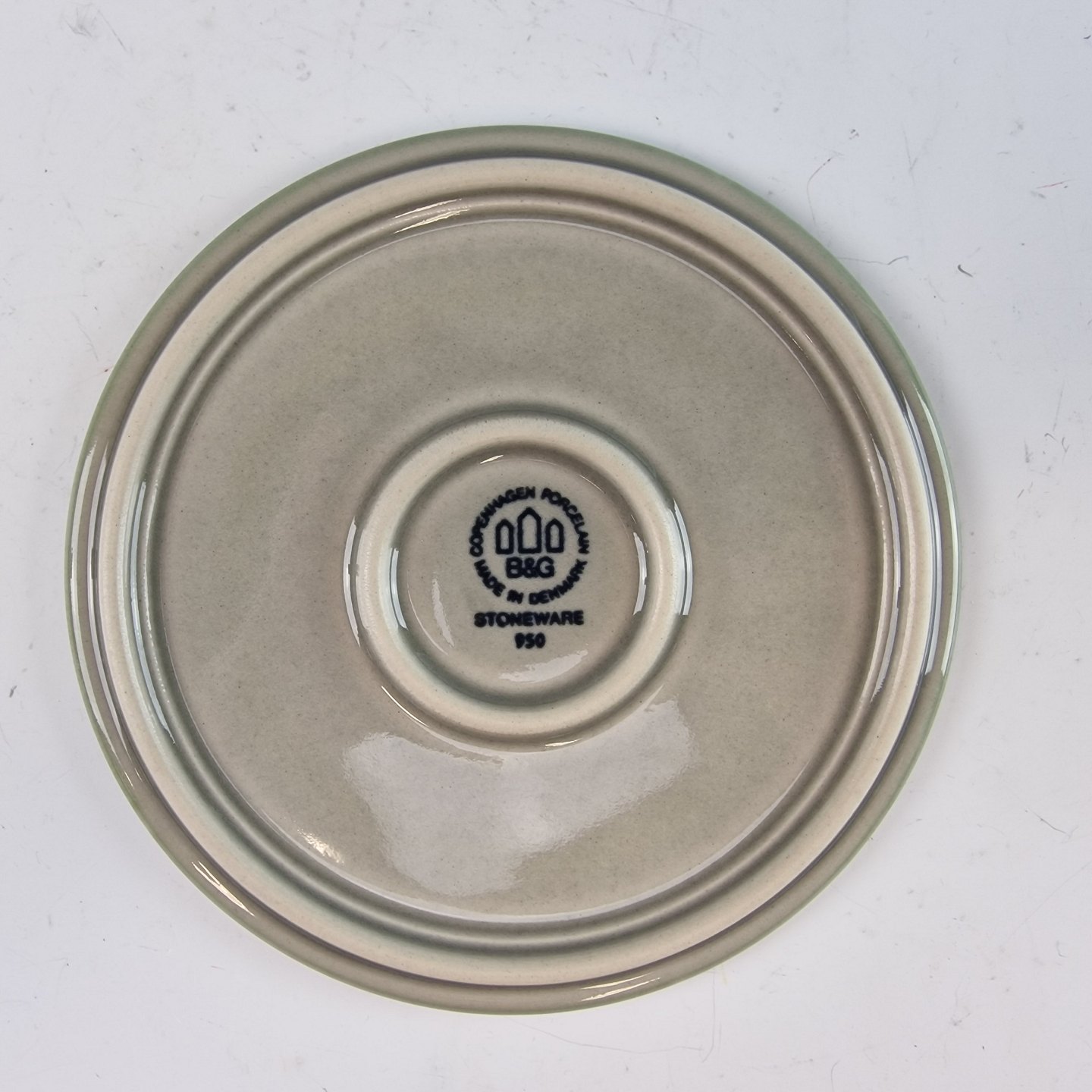 Stellet Tema er af stentøj, glaseret med lys grå og dekoreret med kanter af grønne og brune farver