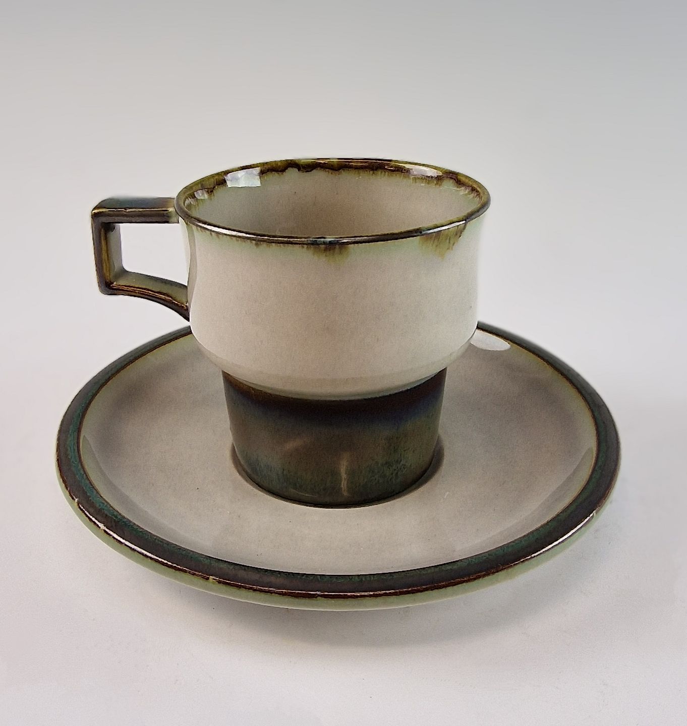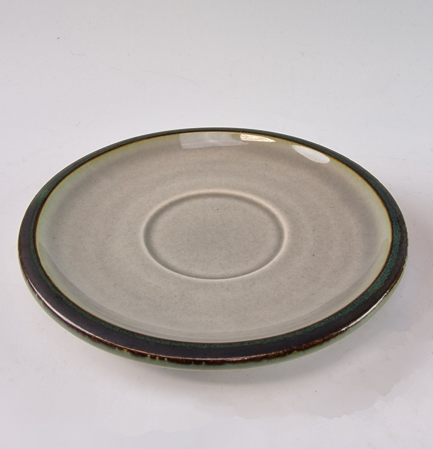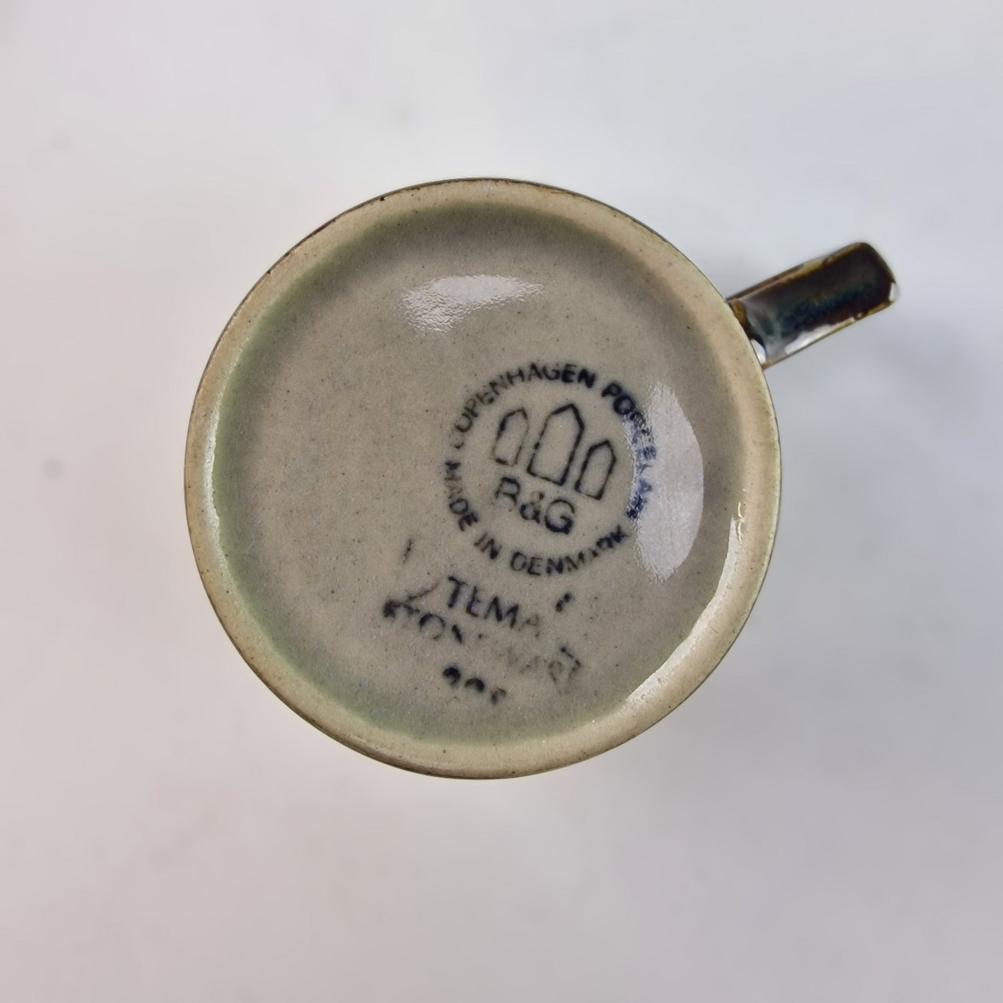 Stellet Tema er af stentøj, glaseret med lys grå og dekoreret med kanter af grønne og brune farver