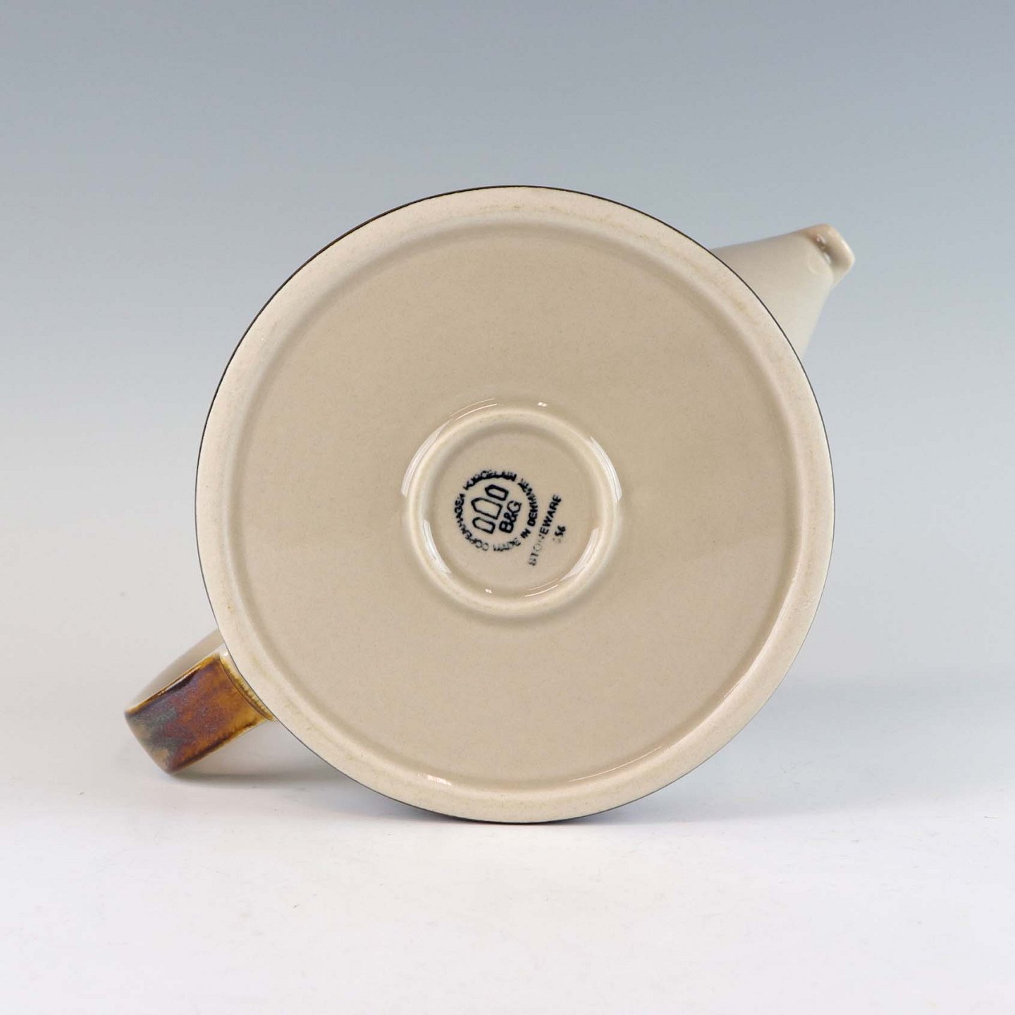 Stellet Peru er af stentøj, glaseret med lys grå farve og dekoreret med bånd af grøn/brunlige farve