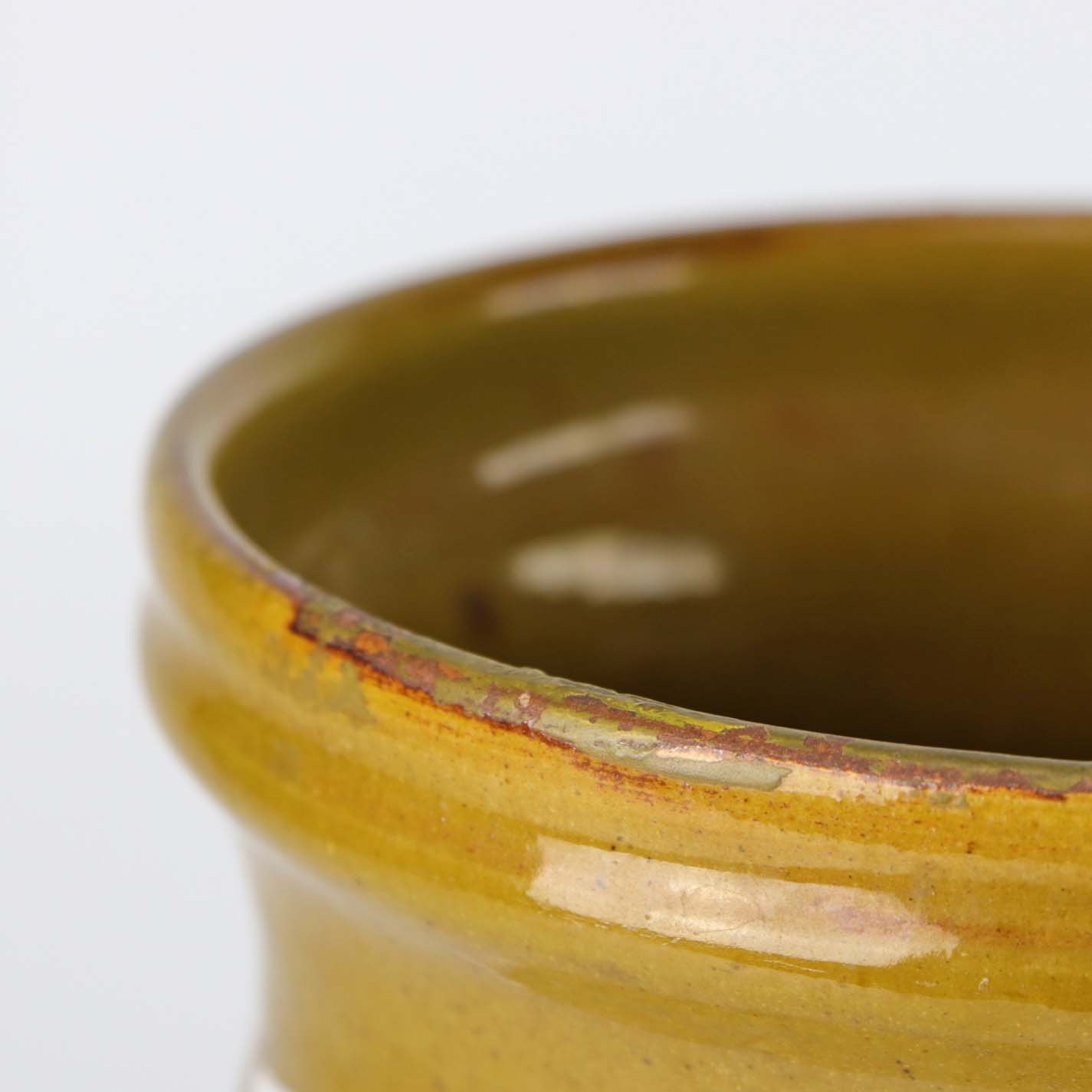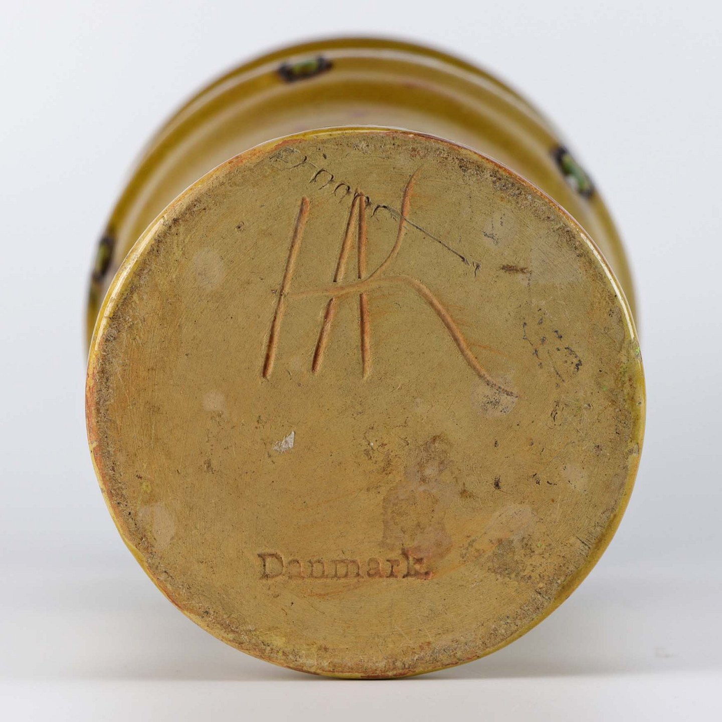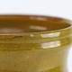 Vase af keramik i gulbrun farve med mønster i blå og grøn