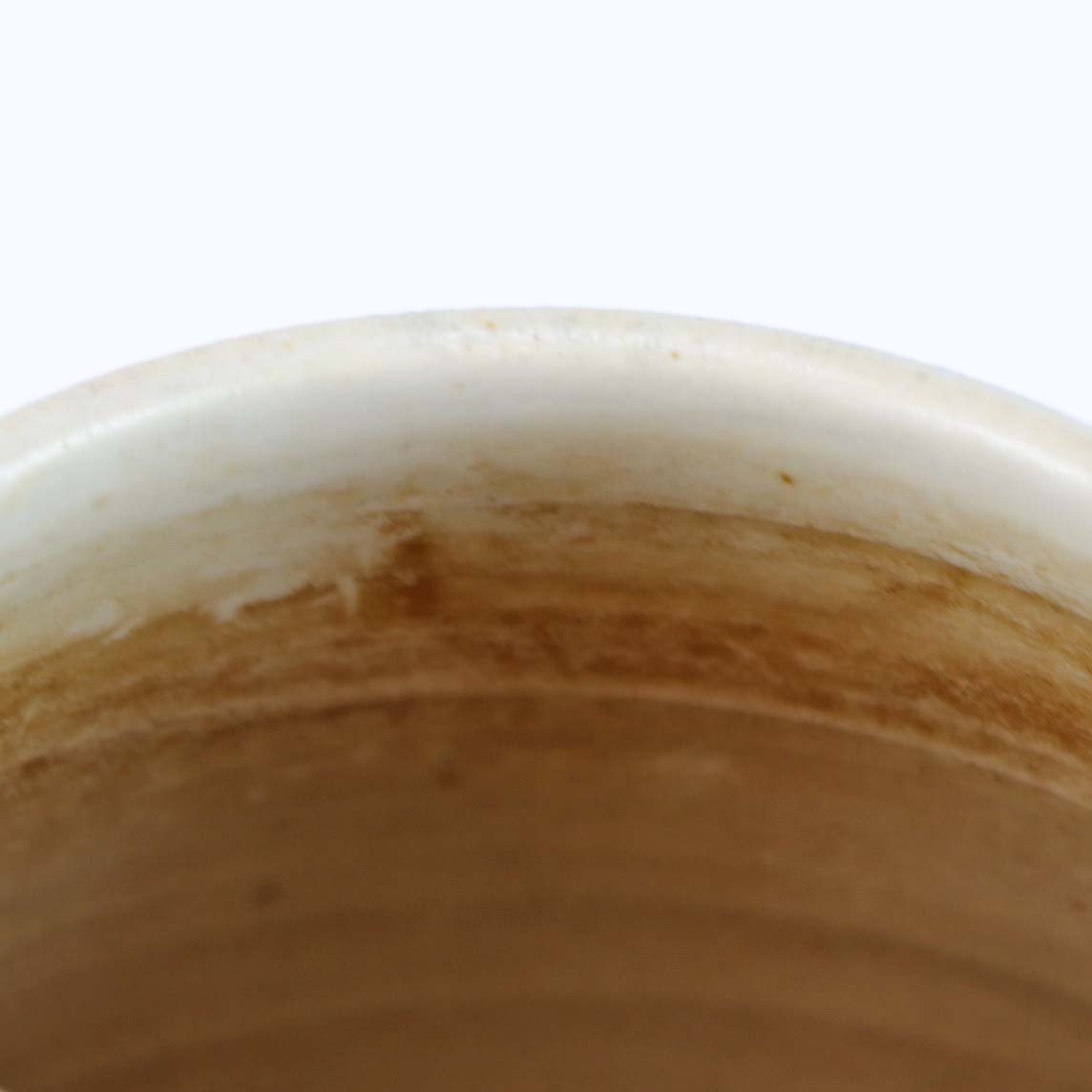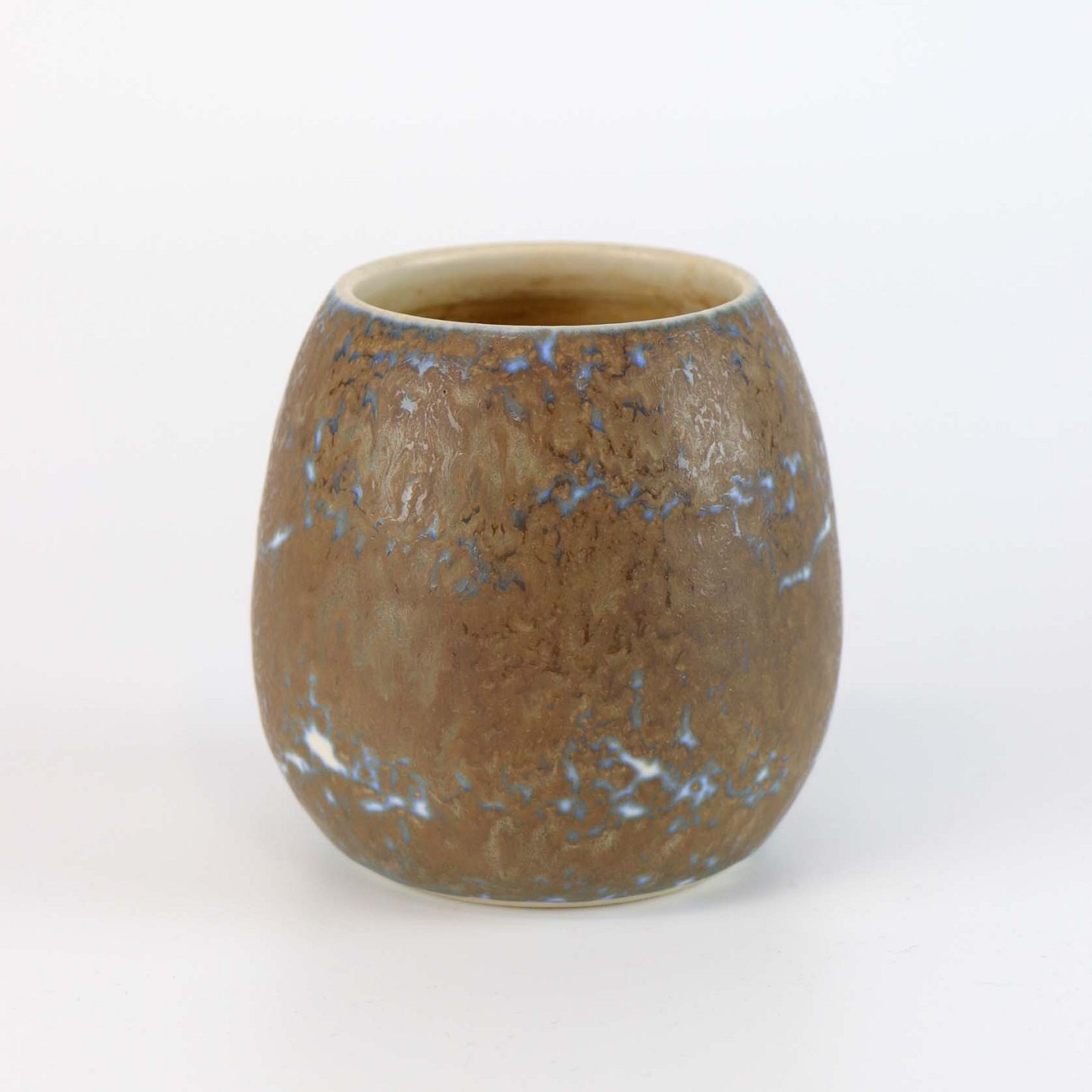 Vase, stentøj, hvid og blå underlag og brun overlag