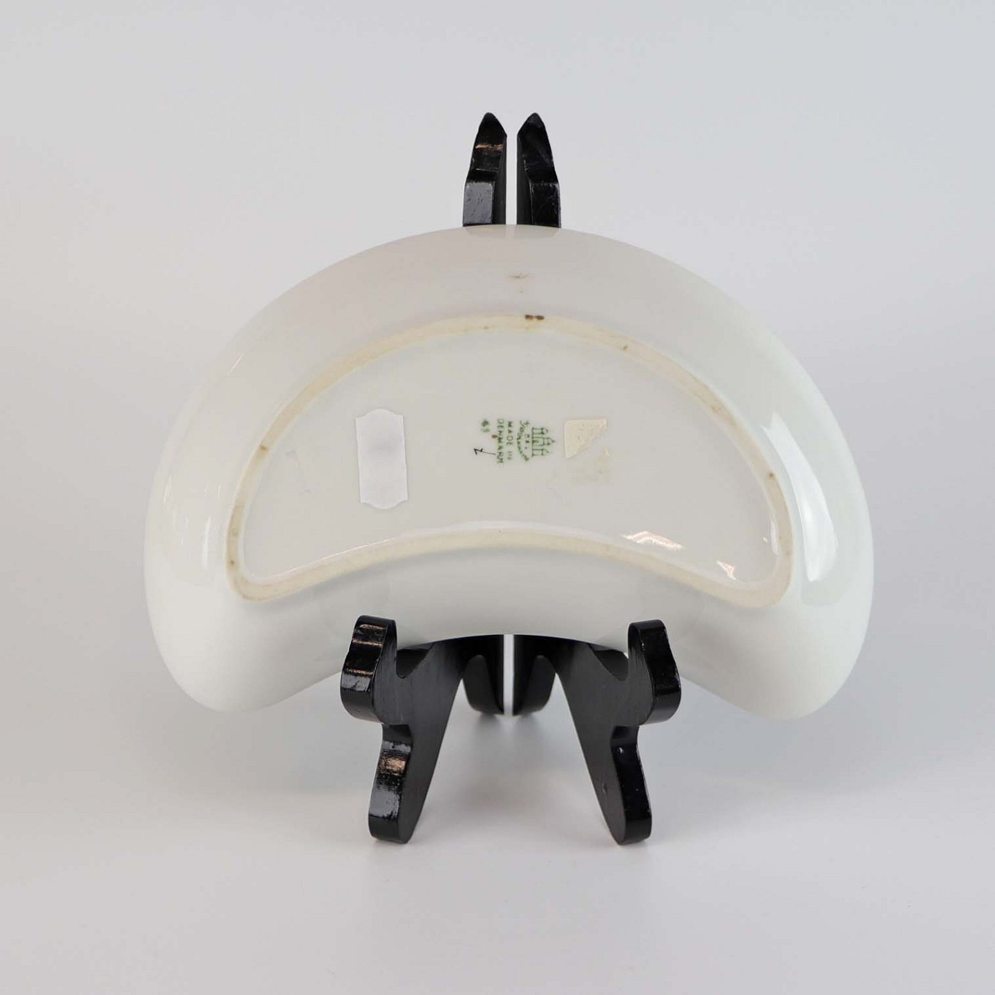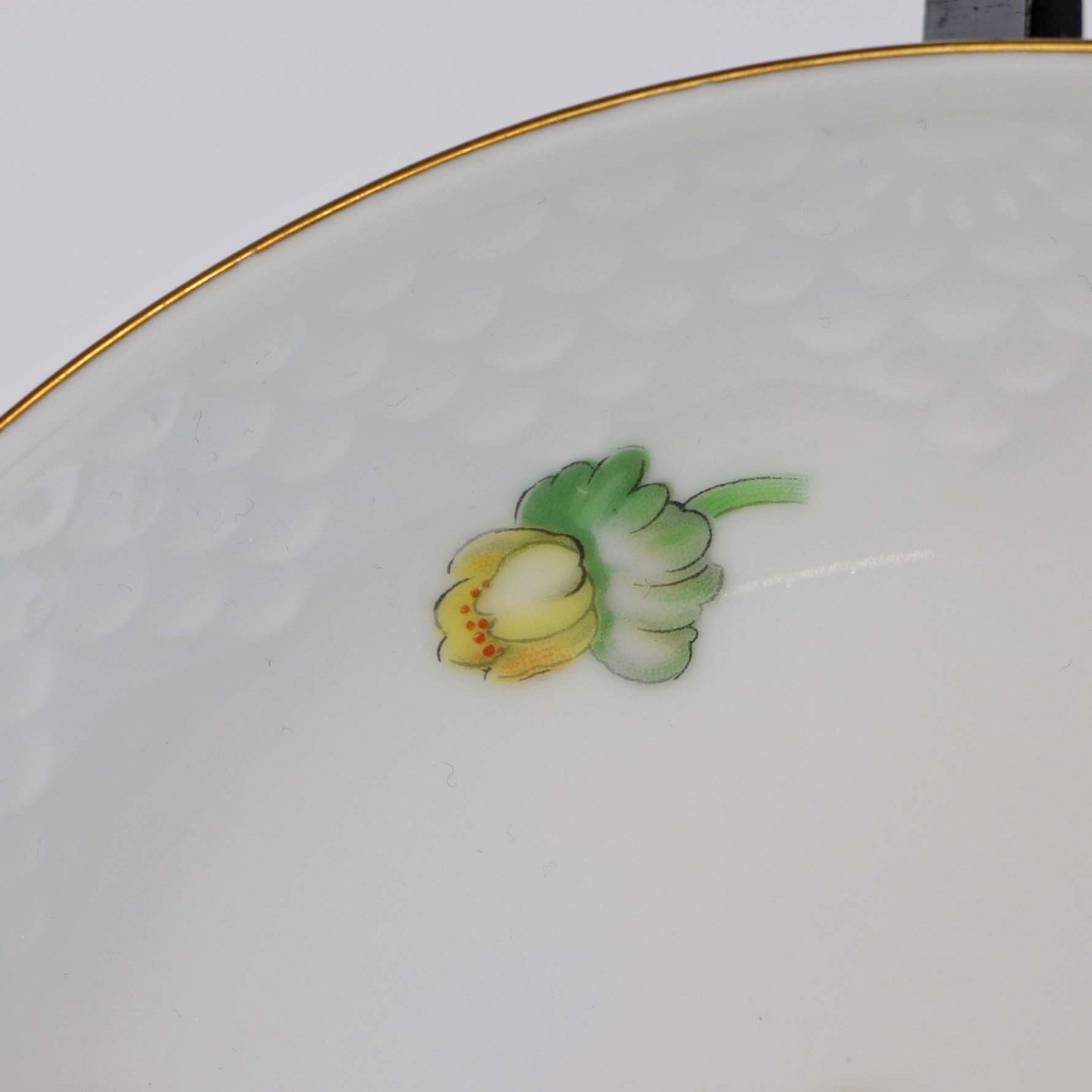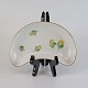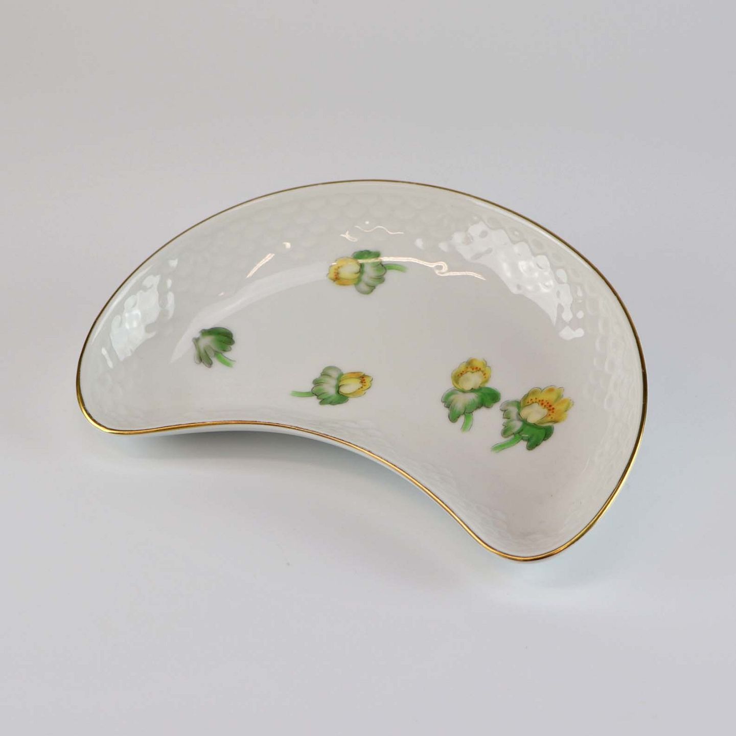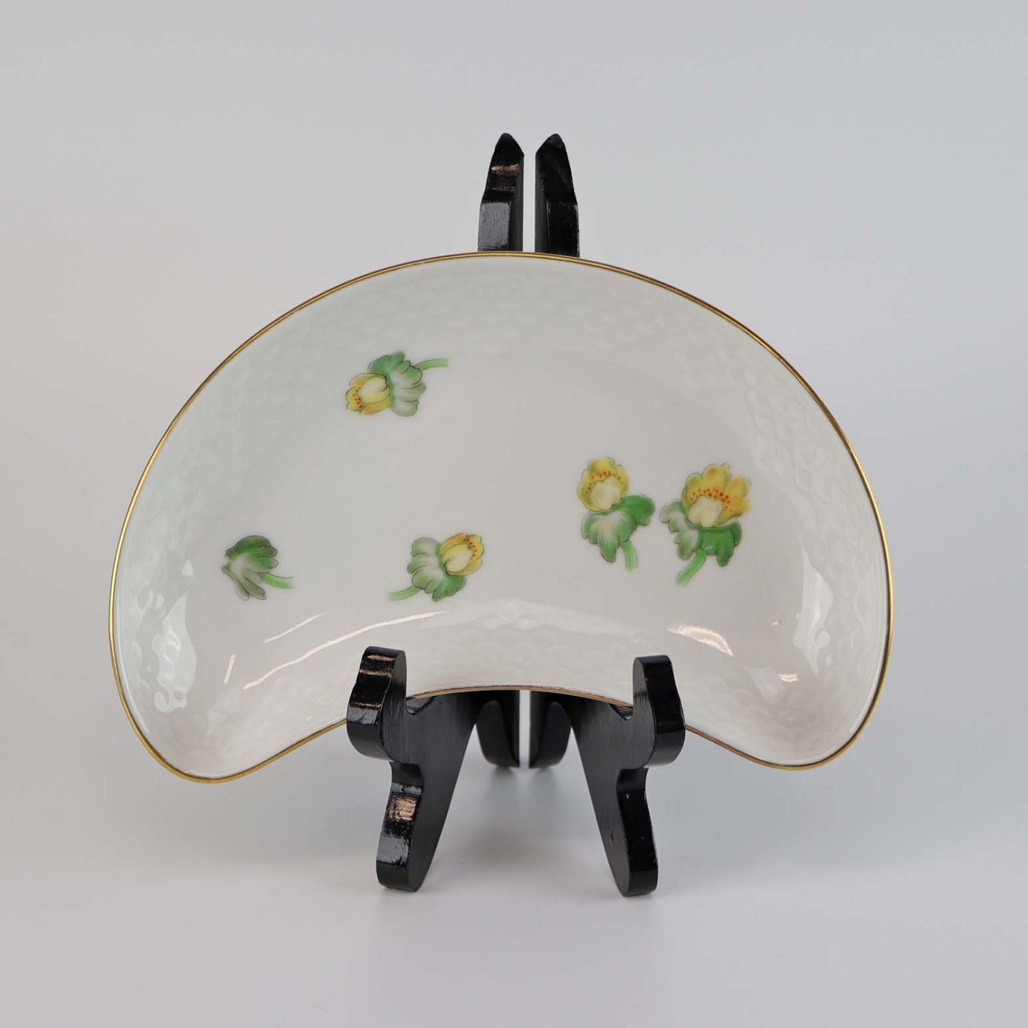 Hvidt porcelæn i skælform med dekoration af gule blomster og guldkant