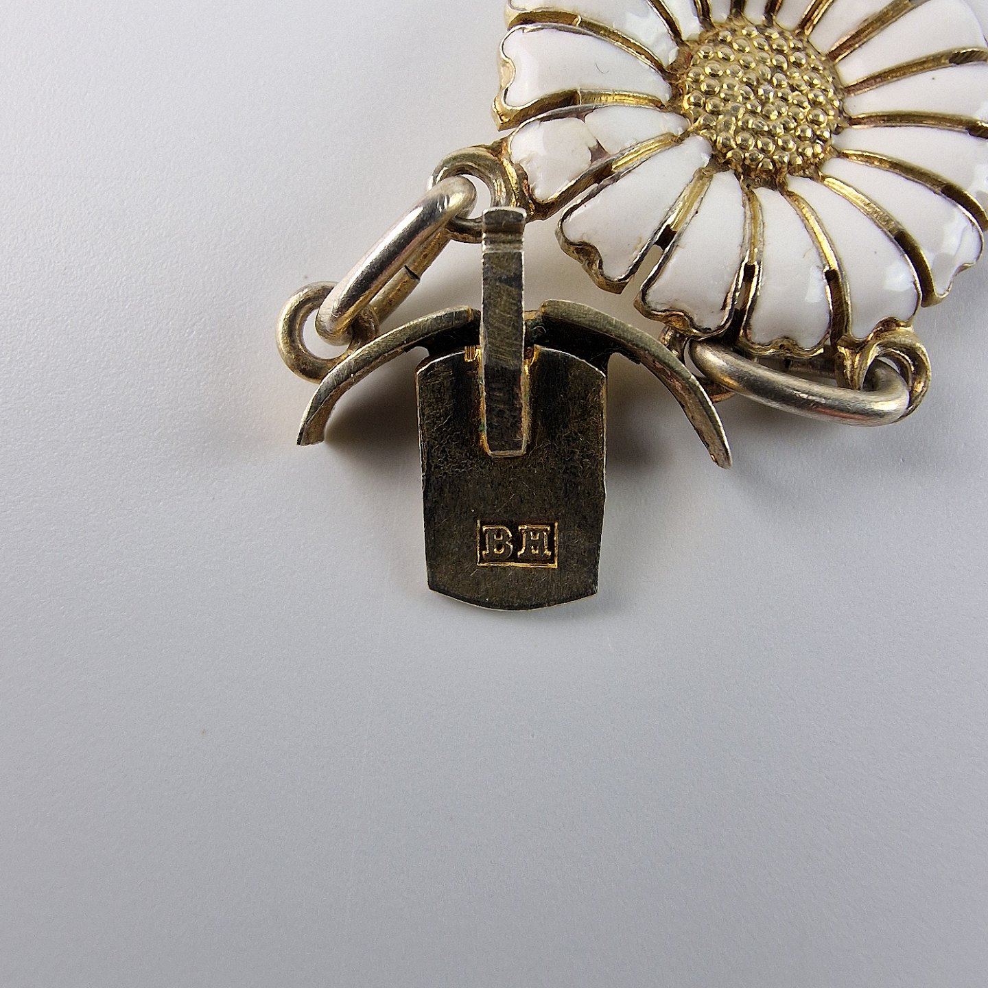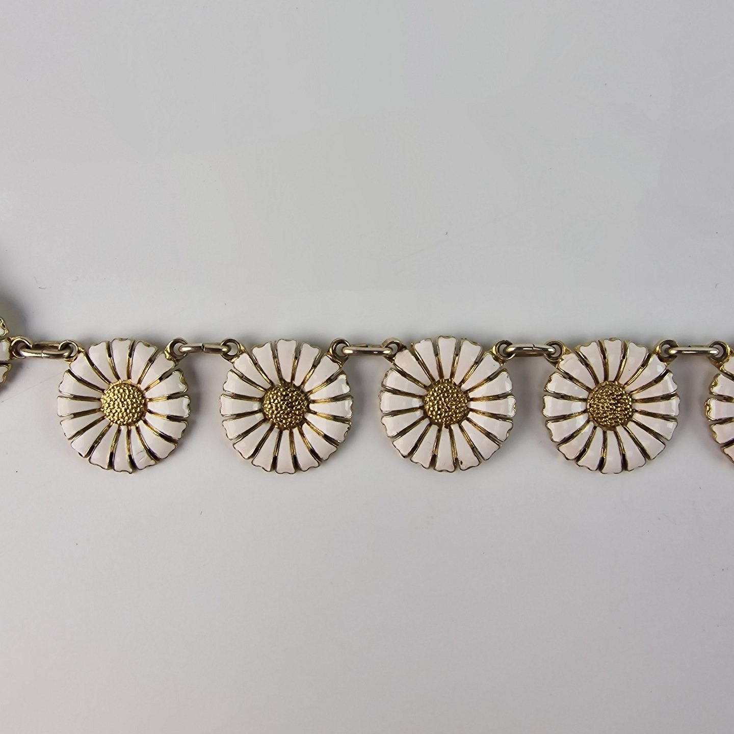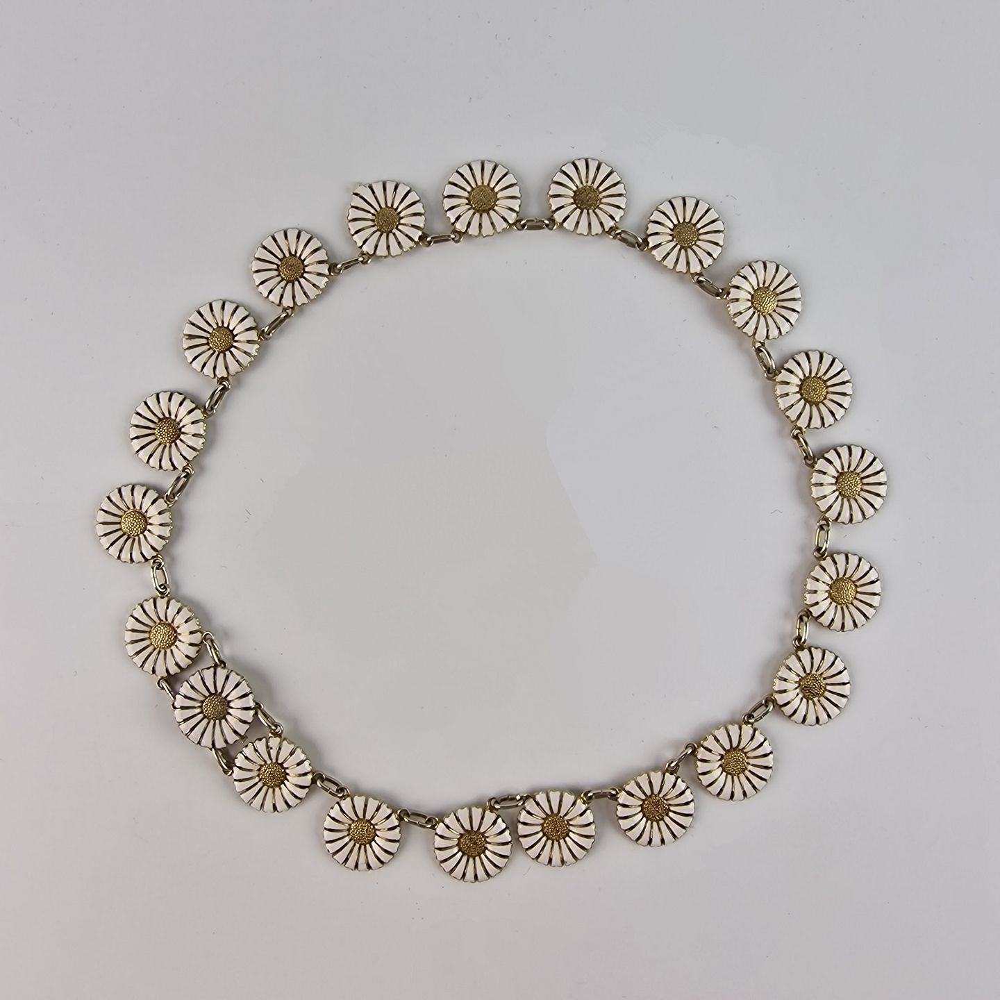 Marguerit halskæde i sterlingsølv med hvid emalje. 21 styk margueritter.