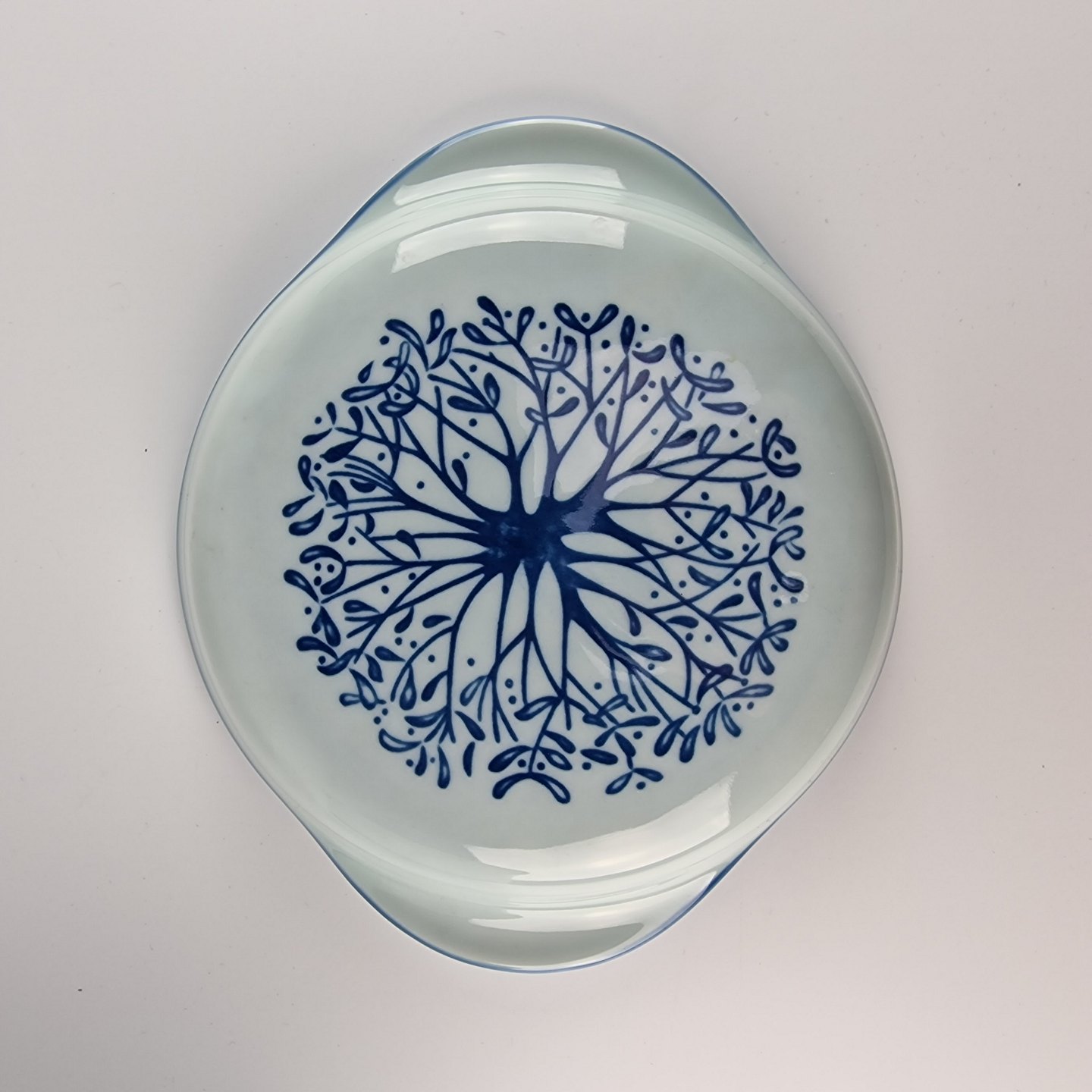Stellets runde former er dækket med en silkeblød glasur og håndmalet med er lys almueblå farve lagt under glasuren. Stellet er ovnfast