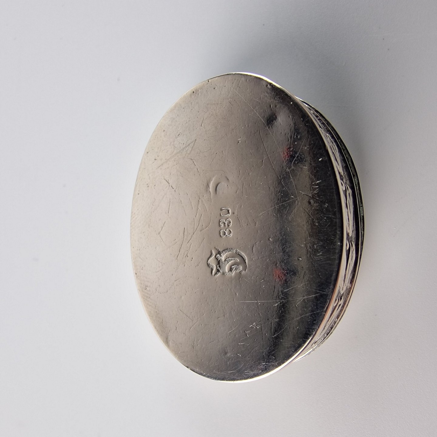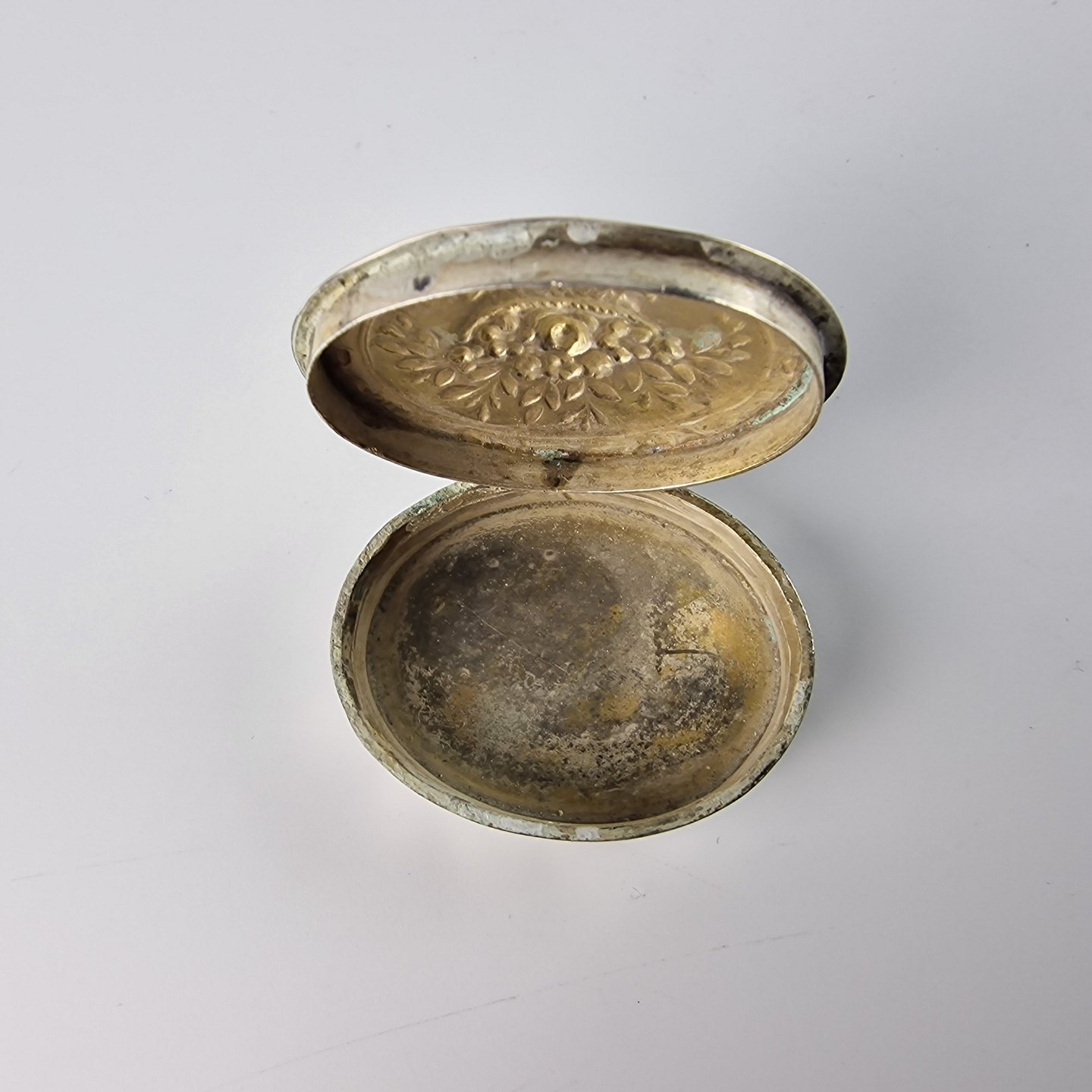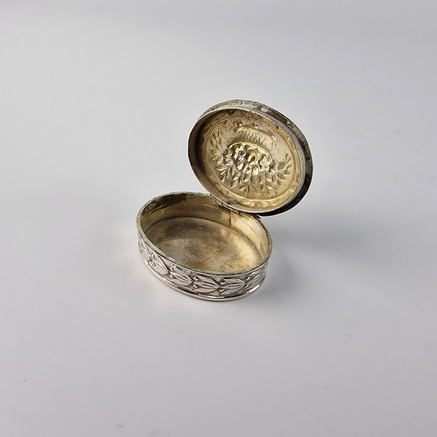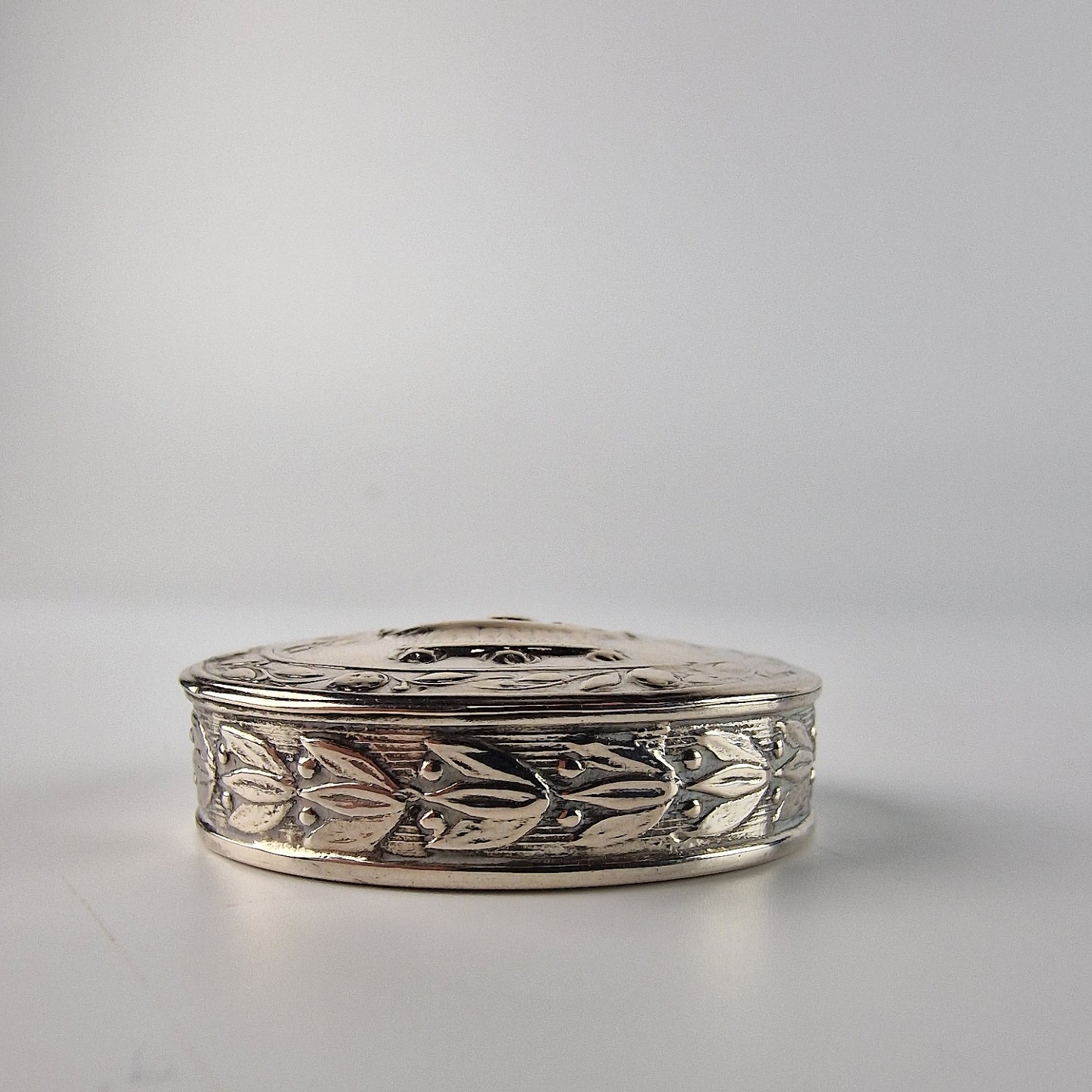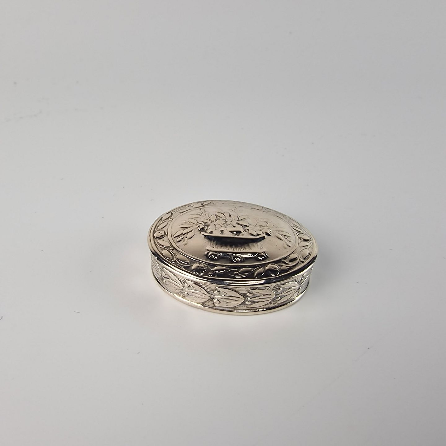 Oval sølvæske med motiv af en buket blomster og blomsterbort på siden