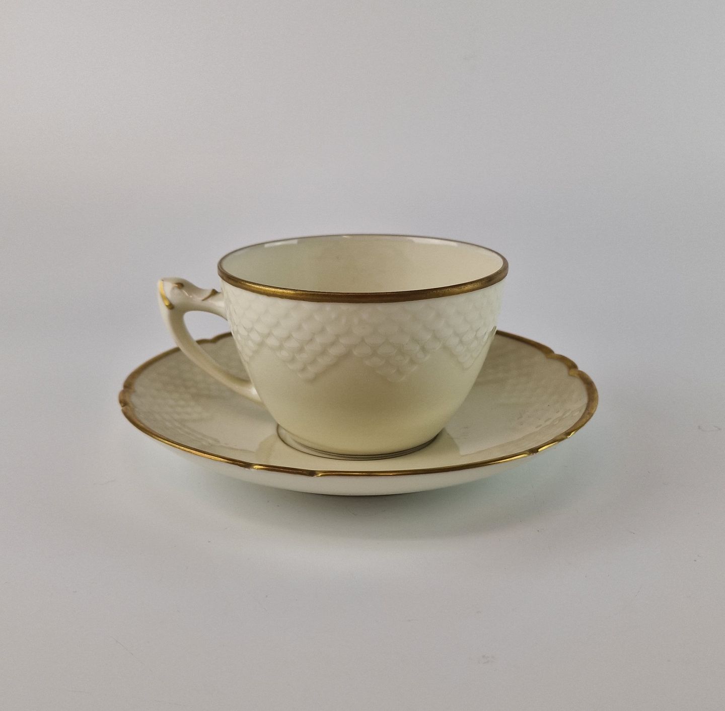 Åkjær er cremefarvet porcelæn med guldkant og mønster som ligner skæl