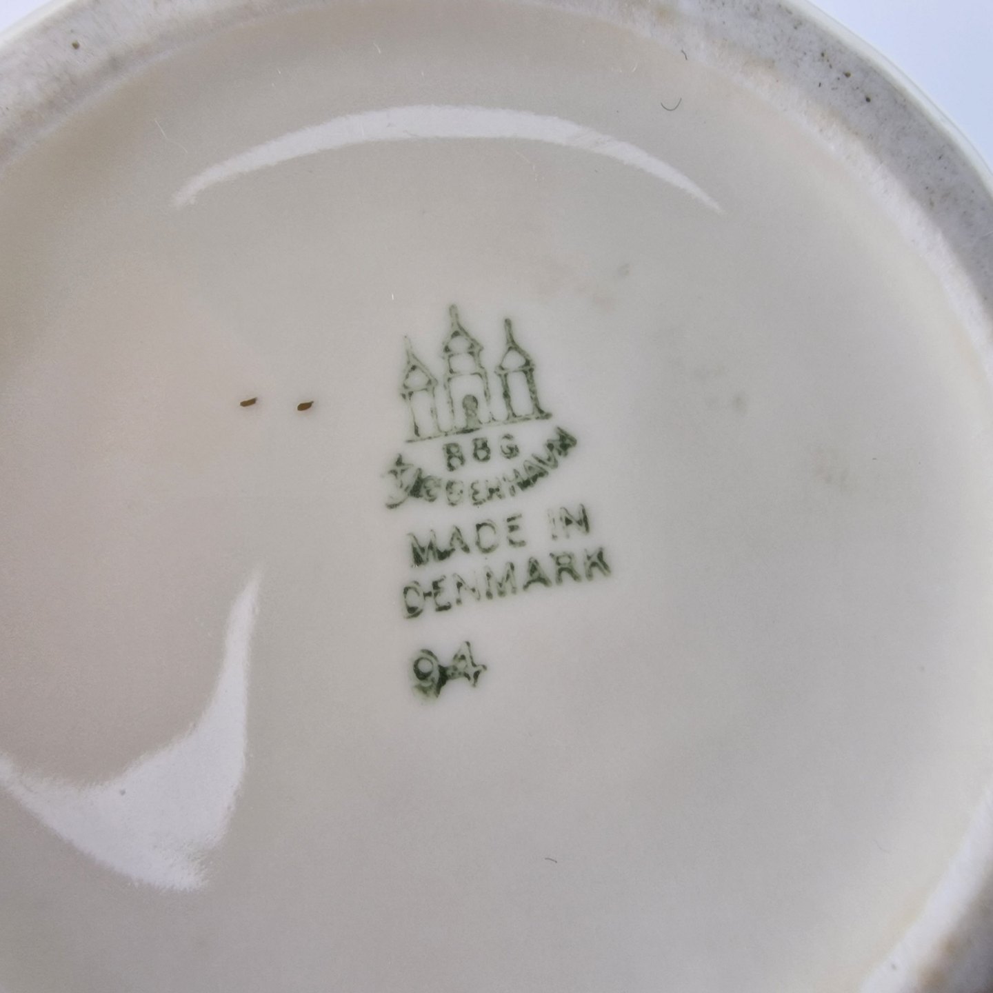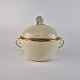 Åkjær er cremefarvet porcelæn med guldkant og mønster som ligner skæl