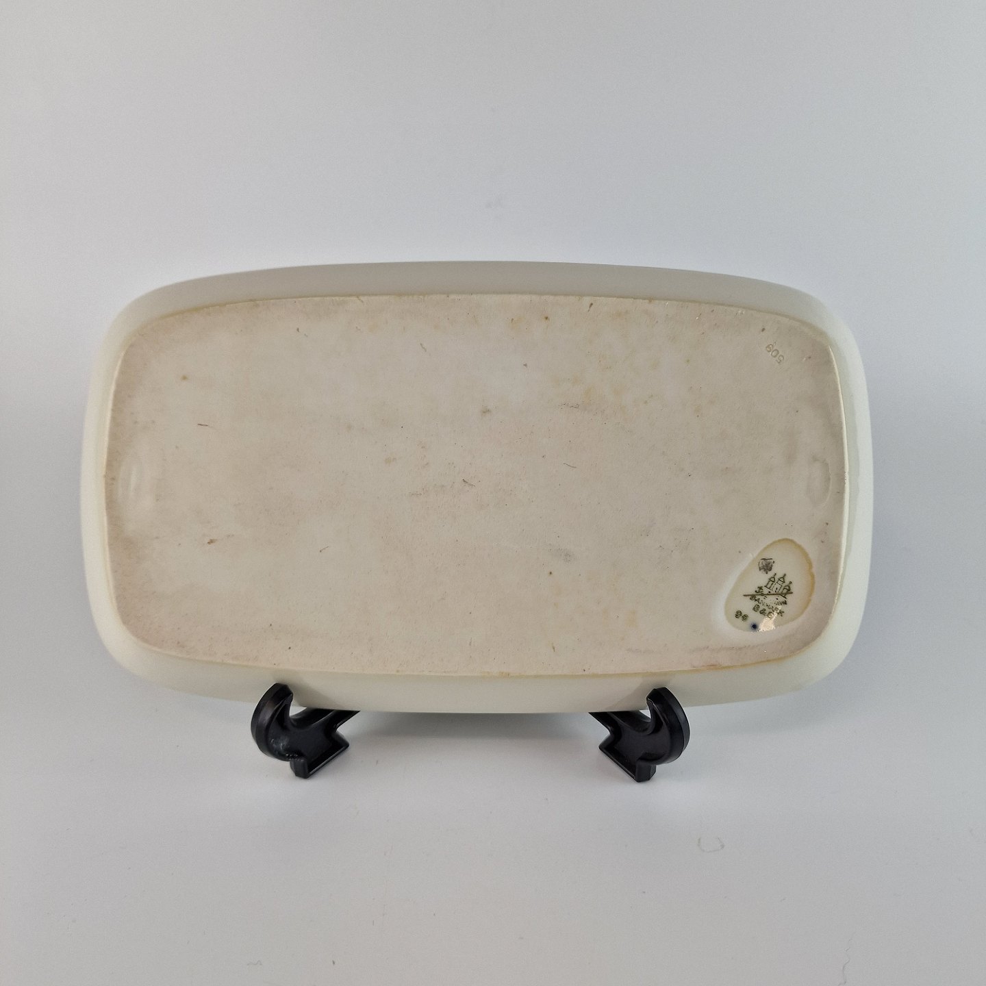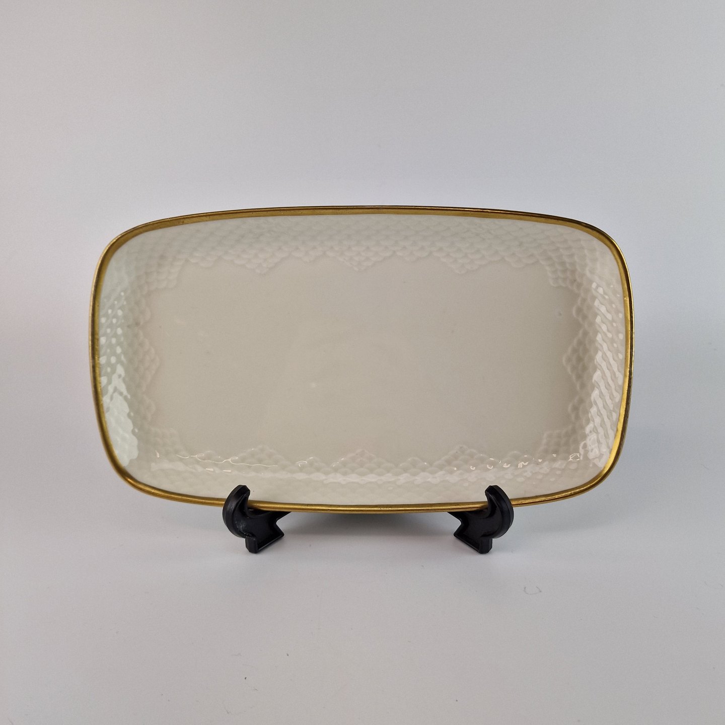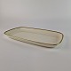 Åkjær er cremefarvet porcelæn med guldkant og mønster som ligner skæl