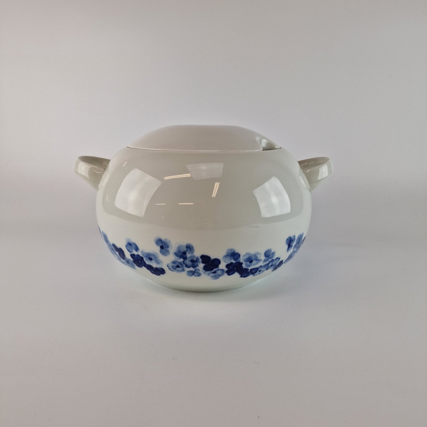 Troja er af kraftigt hvidt porcelæn med mønster af blå blomster