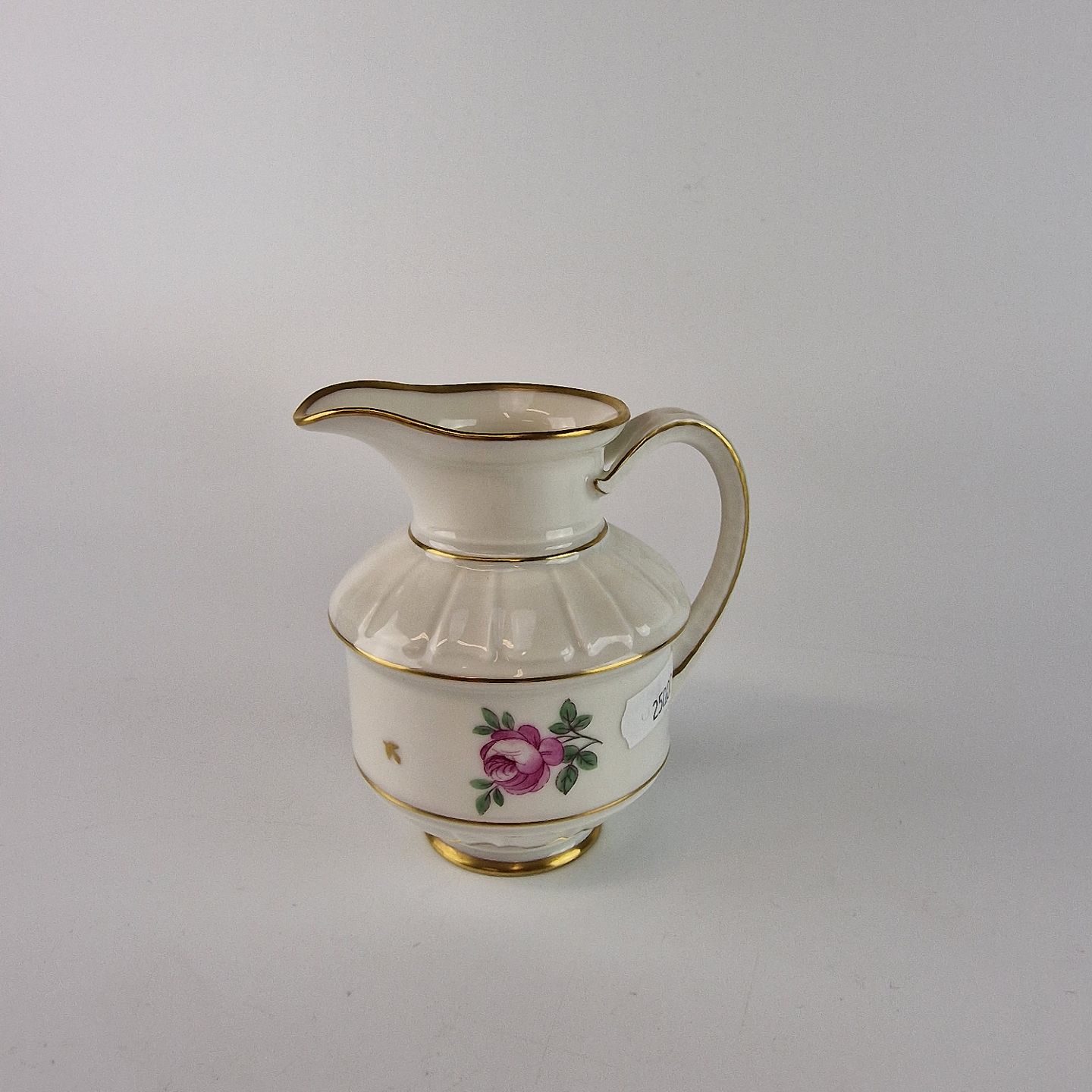 Roselil er kantet hvidt porcelæn med bred guldkant og er dekoreret med roser og blade