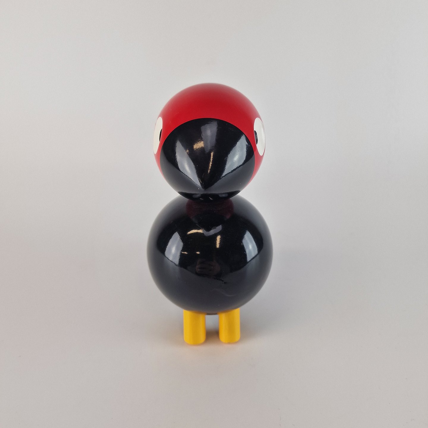 Figur af malet bøgetræ fra serien Sangfugl. Peter har sort krop, rødt hoved, sort næb og gule ben.