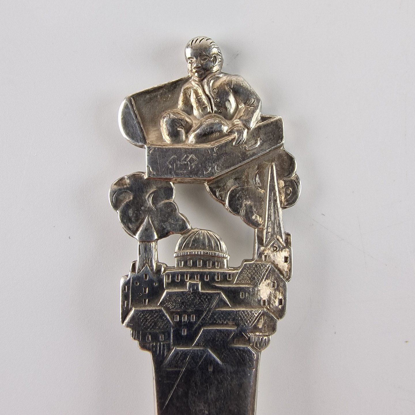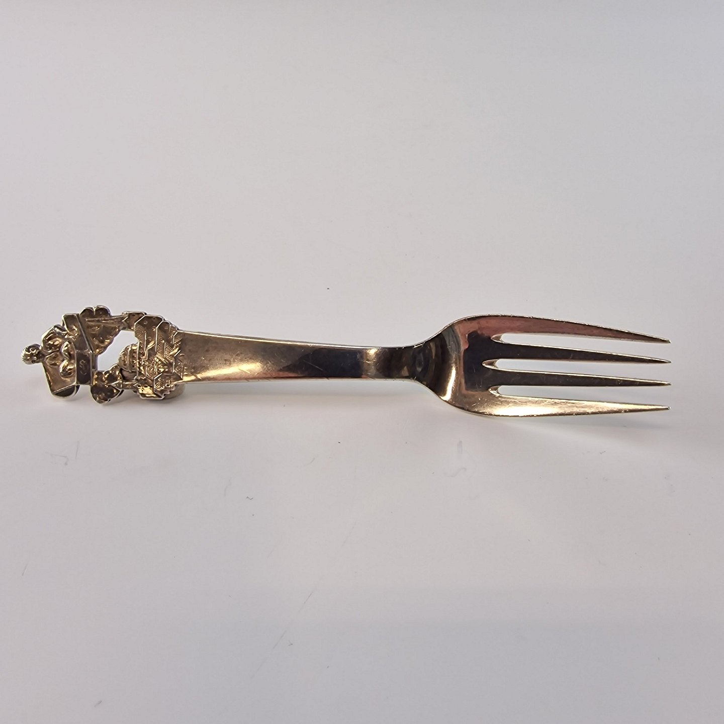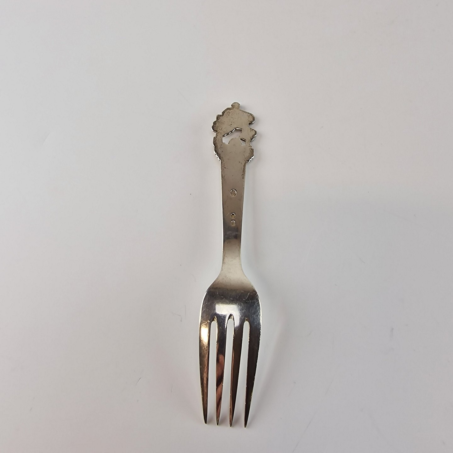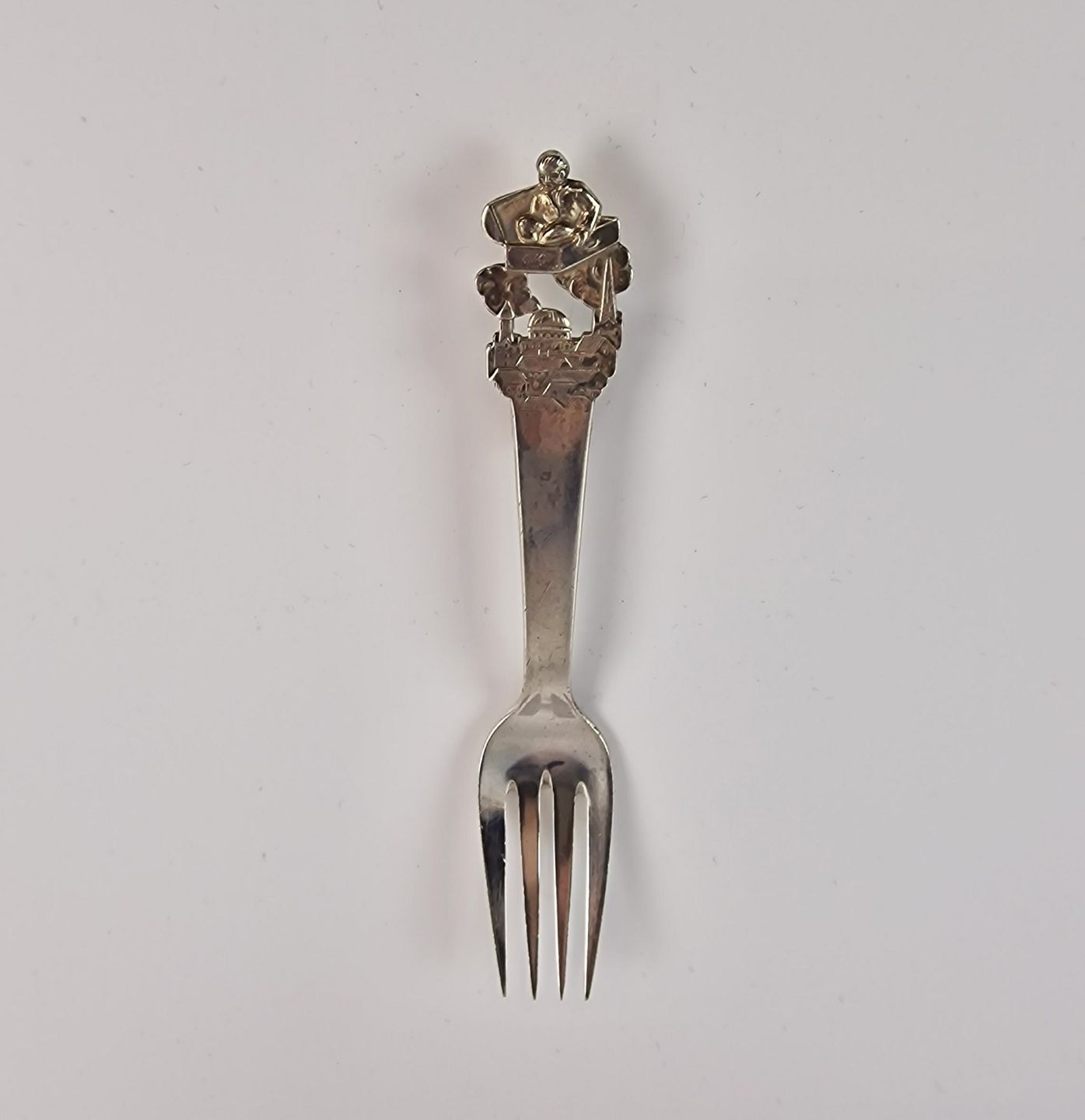 H.C. Andersen barnegaffel i sølv. Med motiv fra eventyret Den flyvende kuffert. År 1950