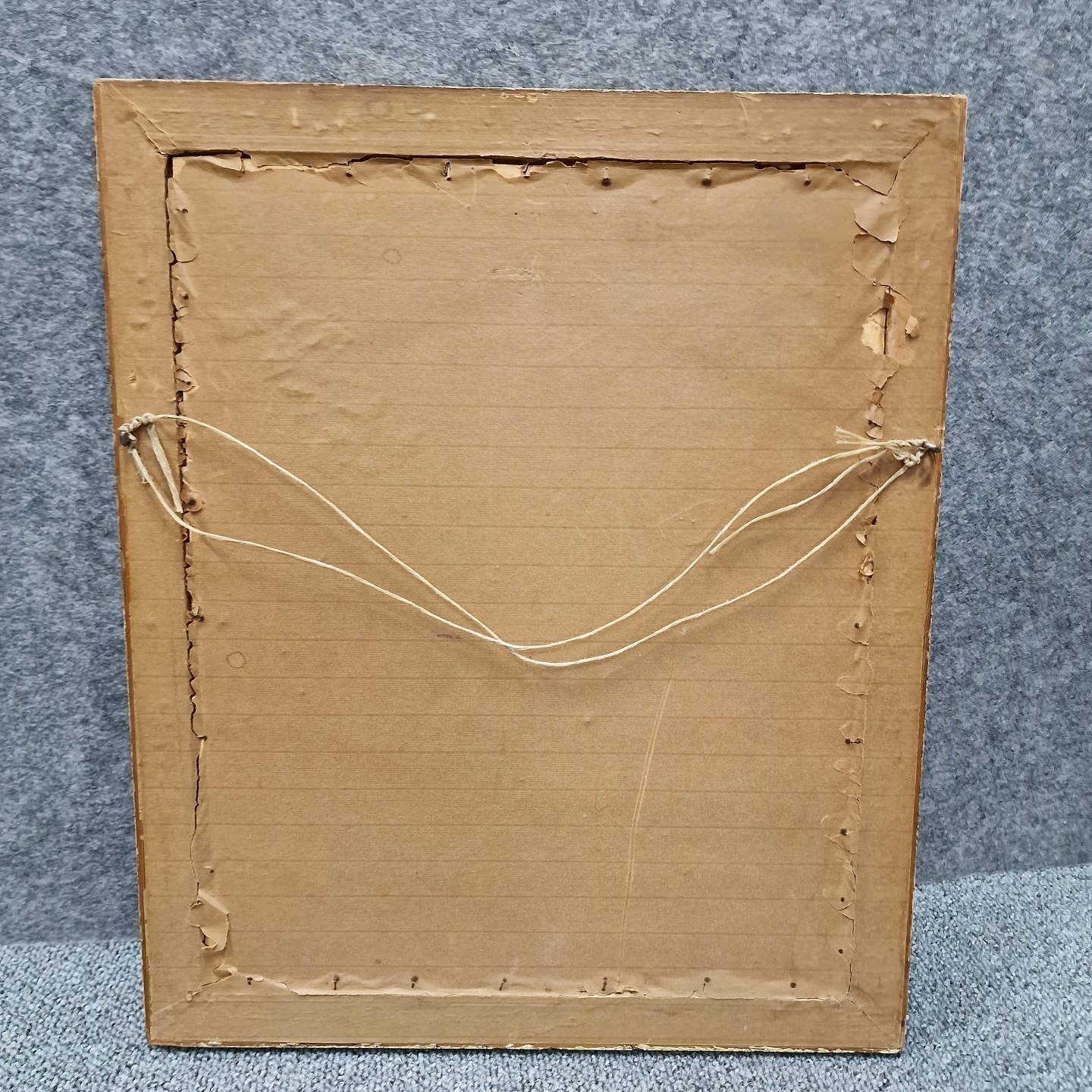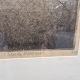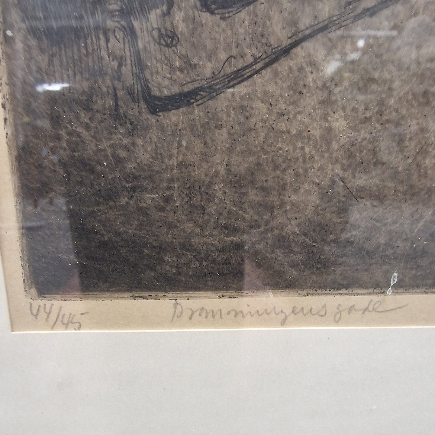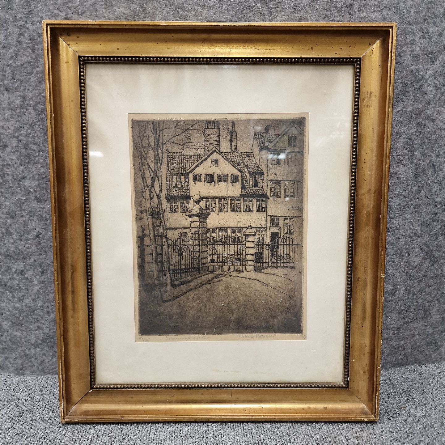 Indrammet radering med gylden træramme. Raderingen no. 44/45 med titlen Dronningensgade er et byskabsmotiv af et ældre hus bag jerngitter