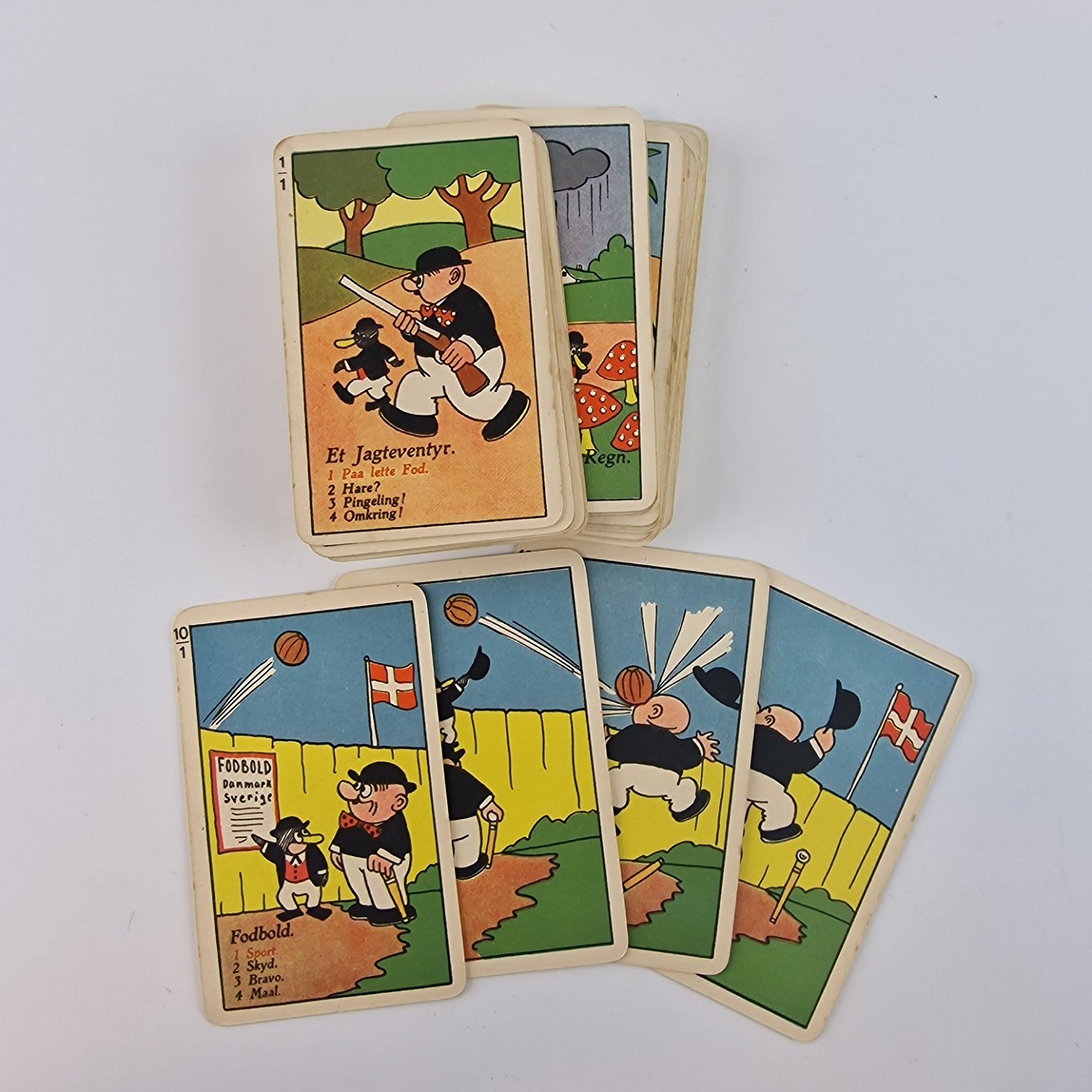 Et sæt kort med tegninger af Peter og Ping i forskellige situationer.