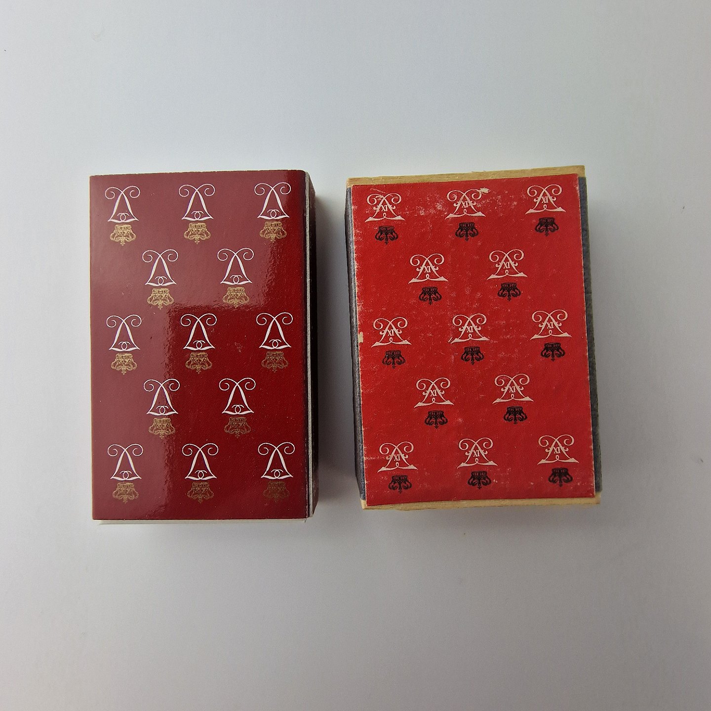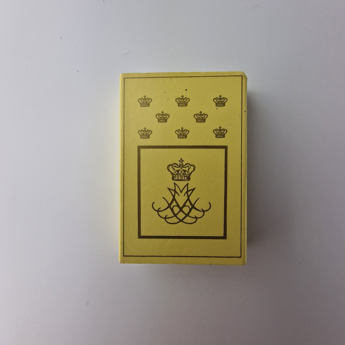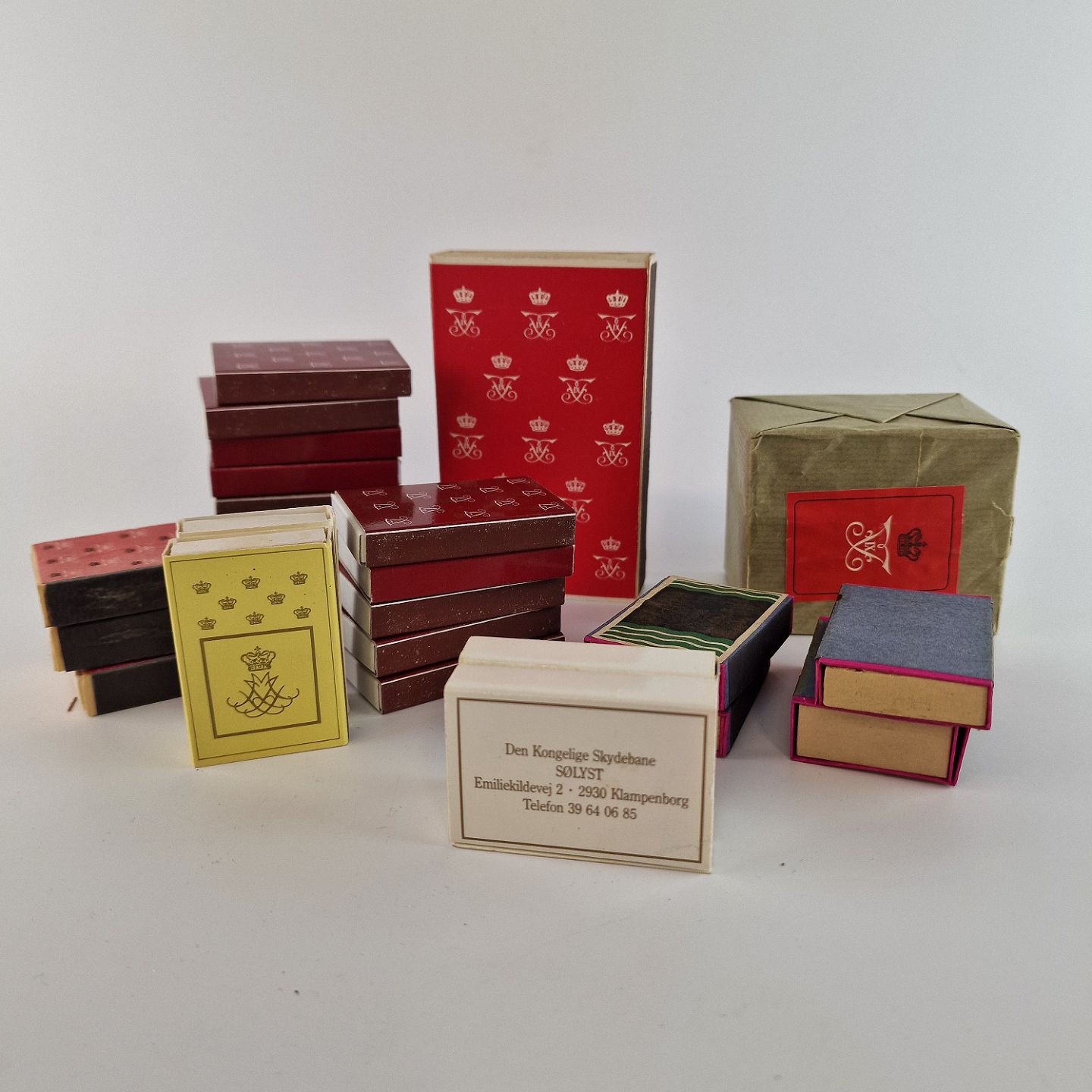26 stk tændstikæsker med kongelig monogram. De er brugt ved det Danske Kongelige Hof ved festlige lejligheder.
