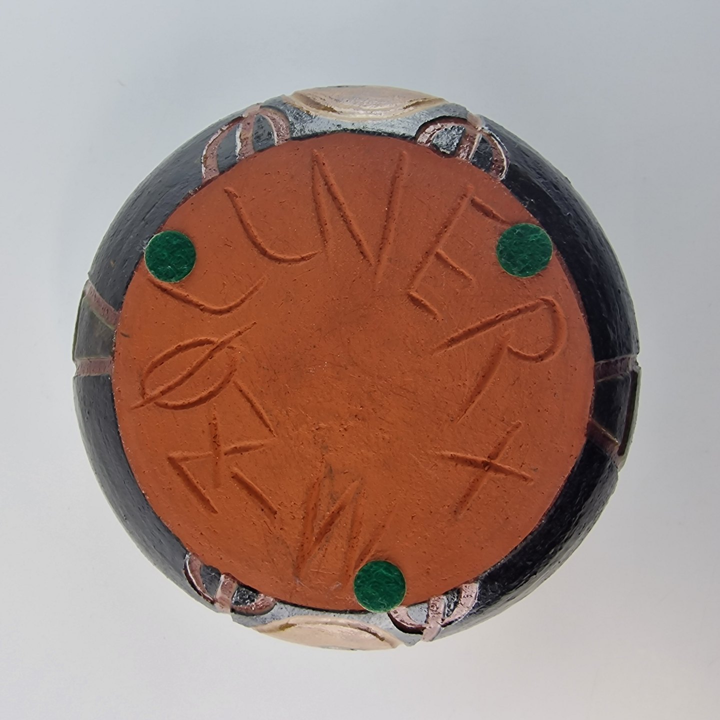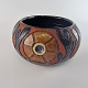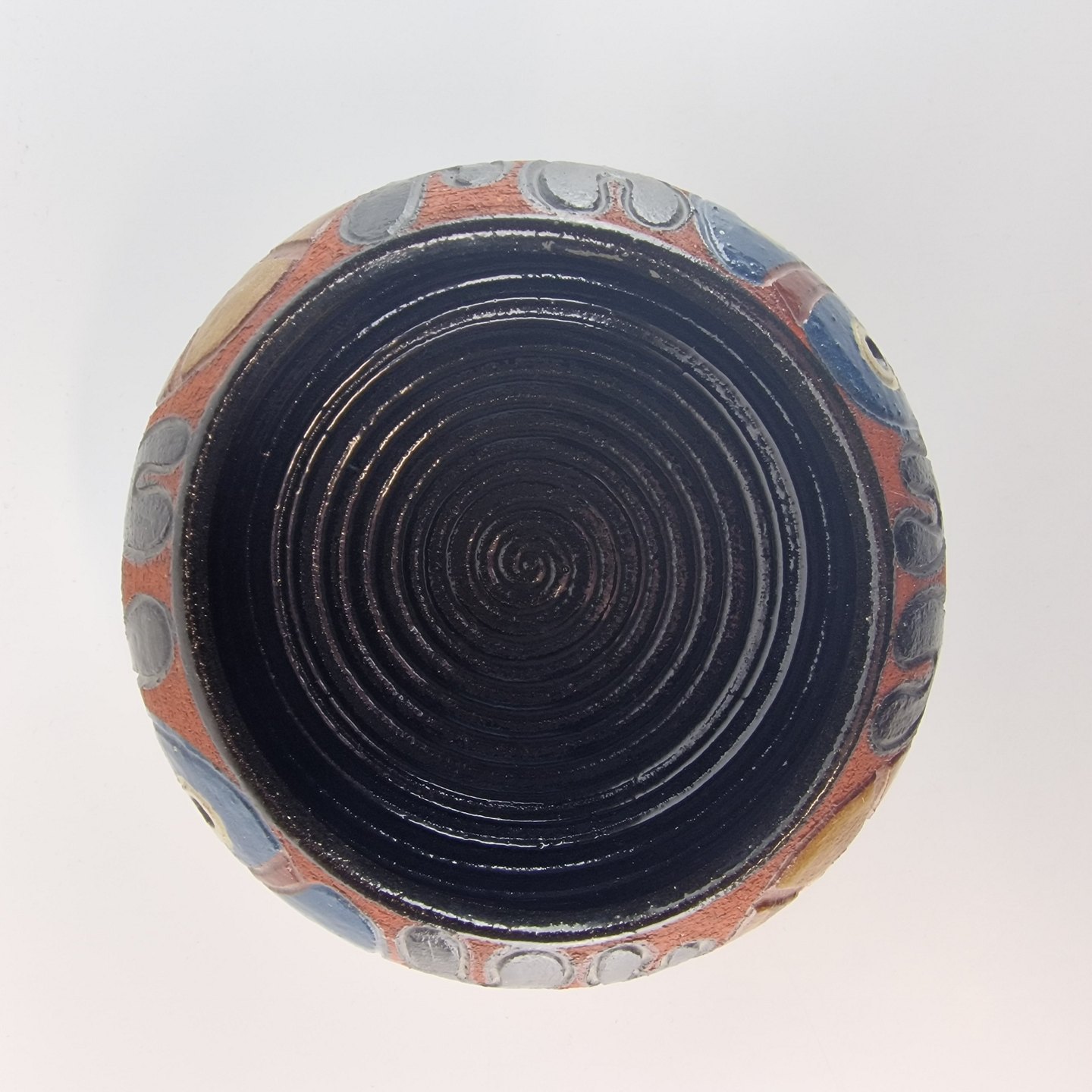 Skål af stentøj, dekoreret med forskellige former og farver. Glaseret sort indvendigt