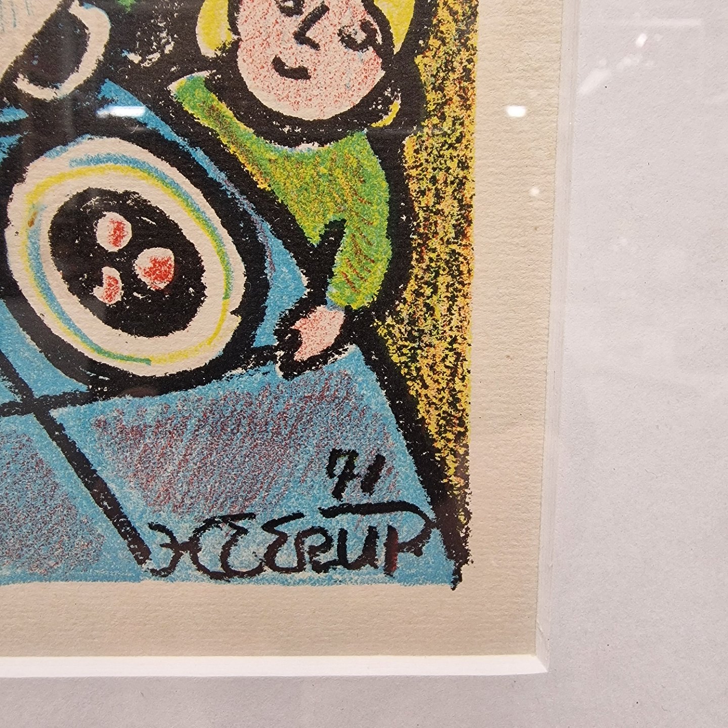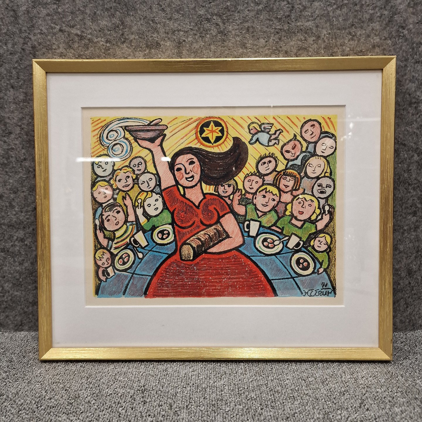 Indrammet litografi i passepartout med gylden træramme. Litografiet med motiv af brødfødende kvinde omgivet af mennesker i alle aldre er fra nytårsserien år 1972 med titlen Vær velkommen Herrens år.