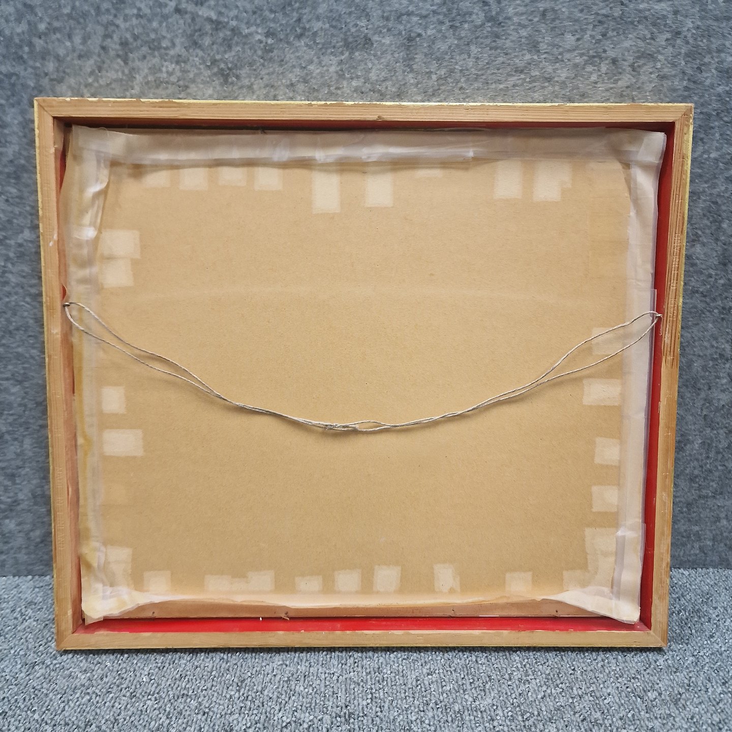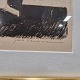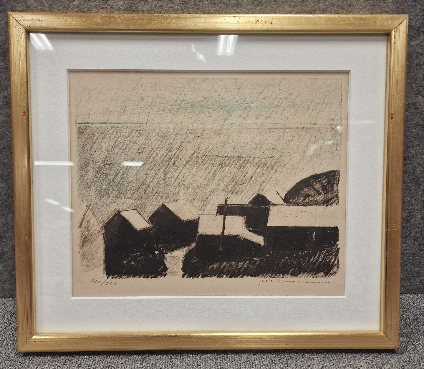 Indrammet litografi i passepartout med gylden træramme. Grafisk tryk i kubistisk stil med landskabskabsmotiv fra Færøerne med huse ved havet no 200/300.