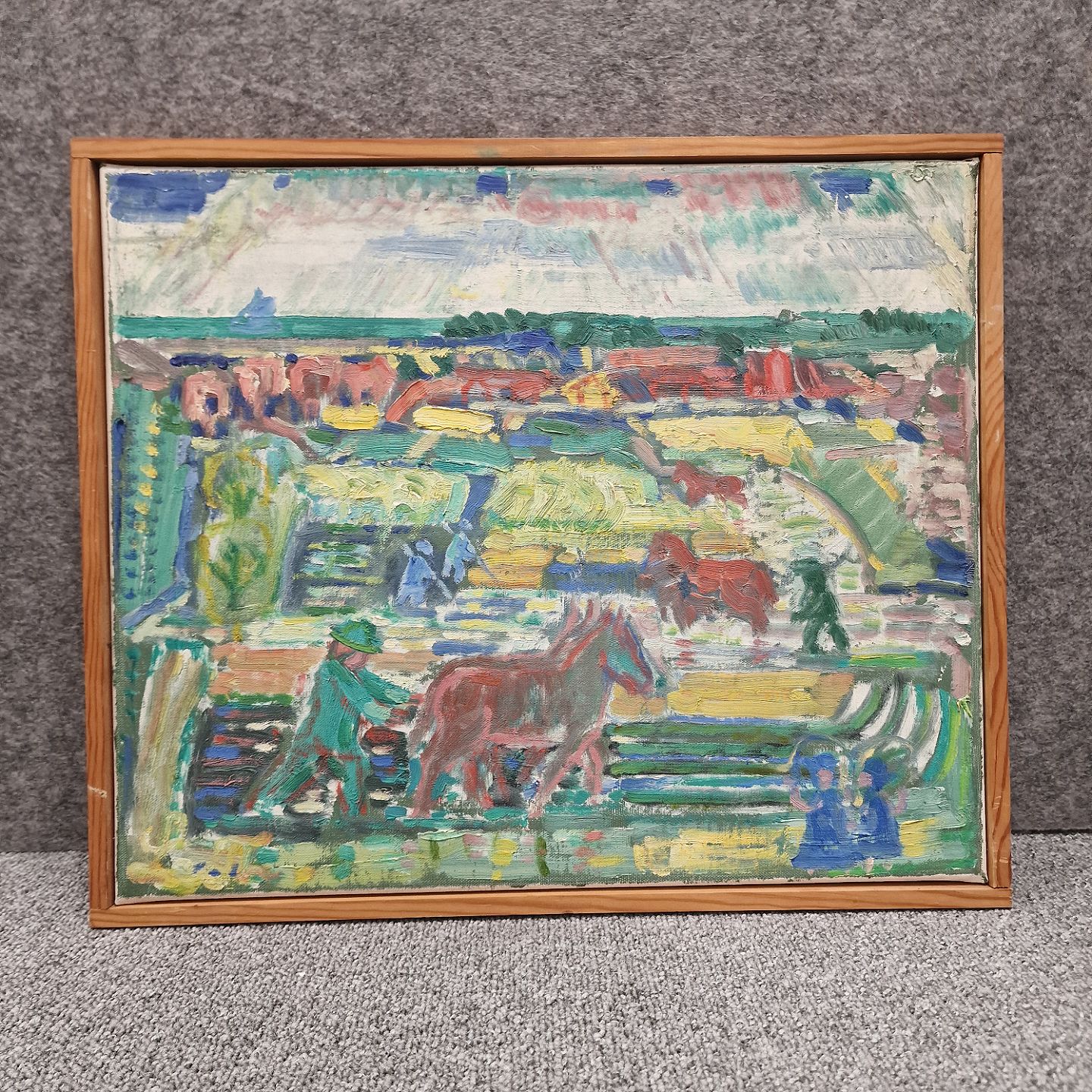 Motiv: Abstrakt mennesker som arbejder i marken. Hestetrukket landrug.