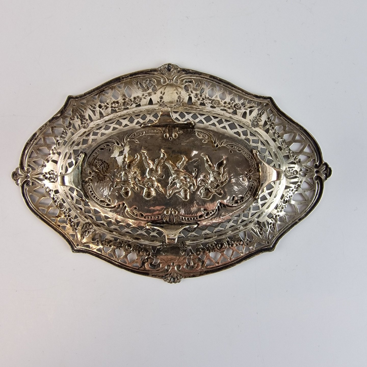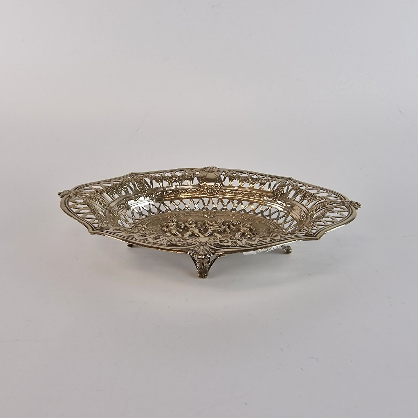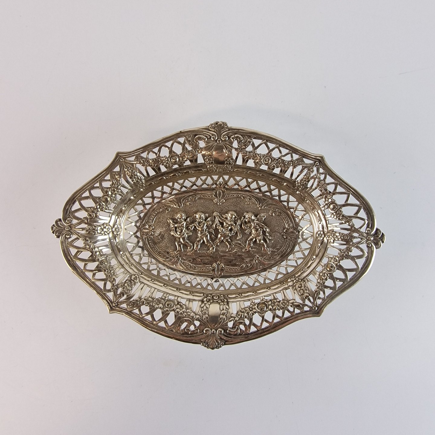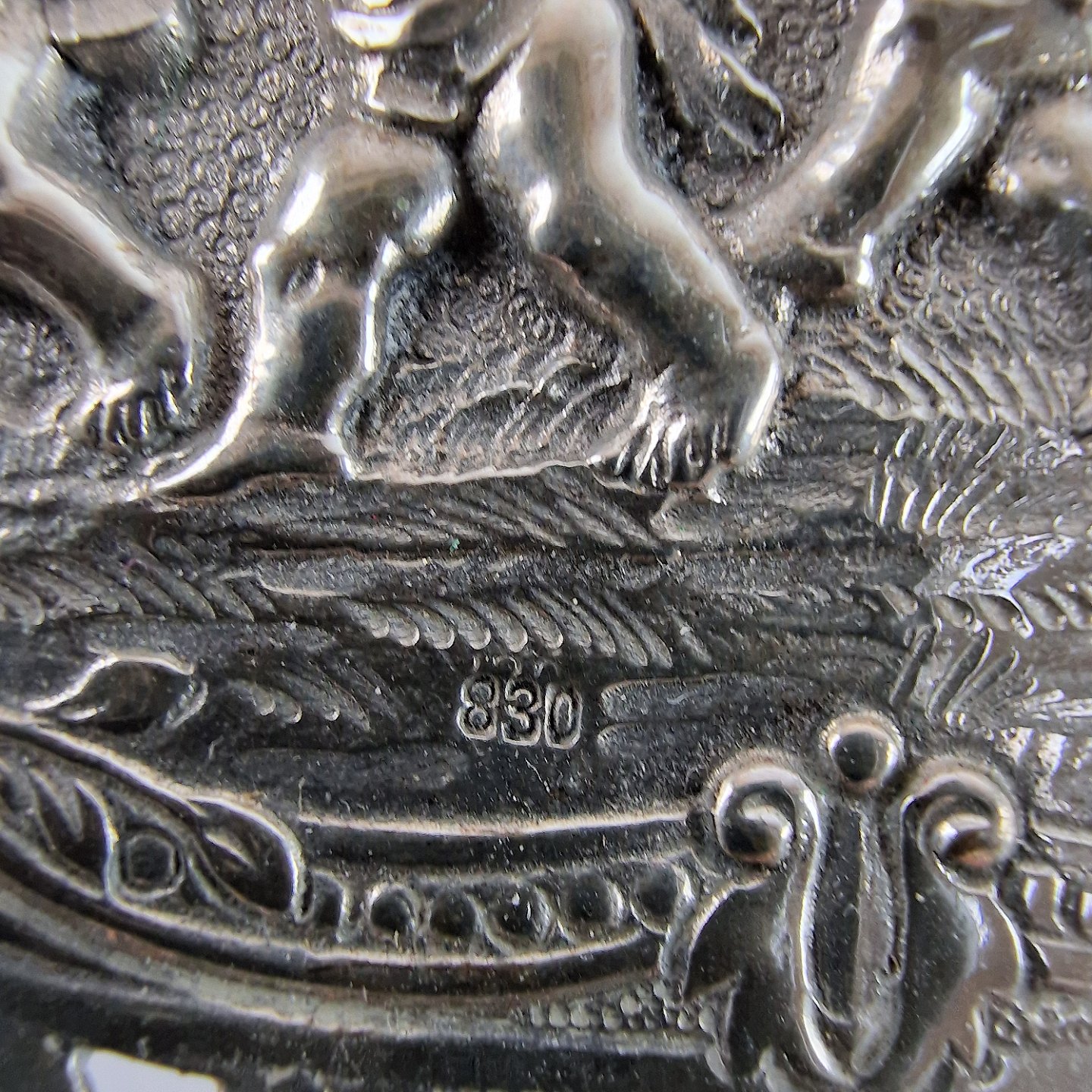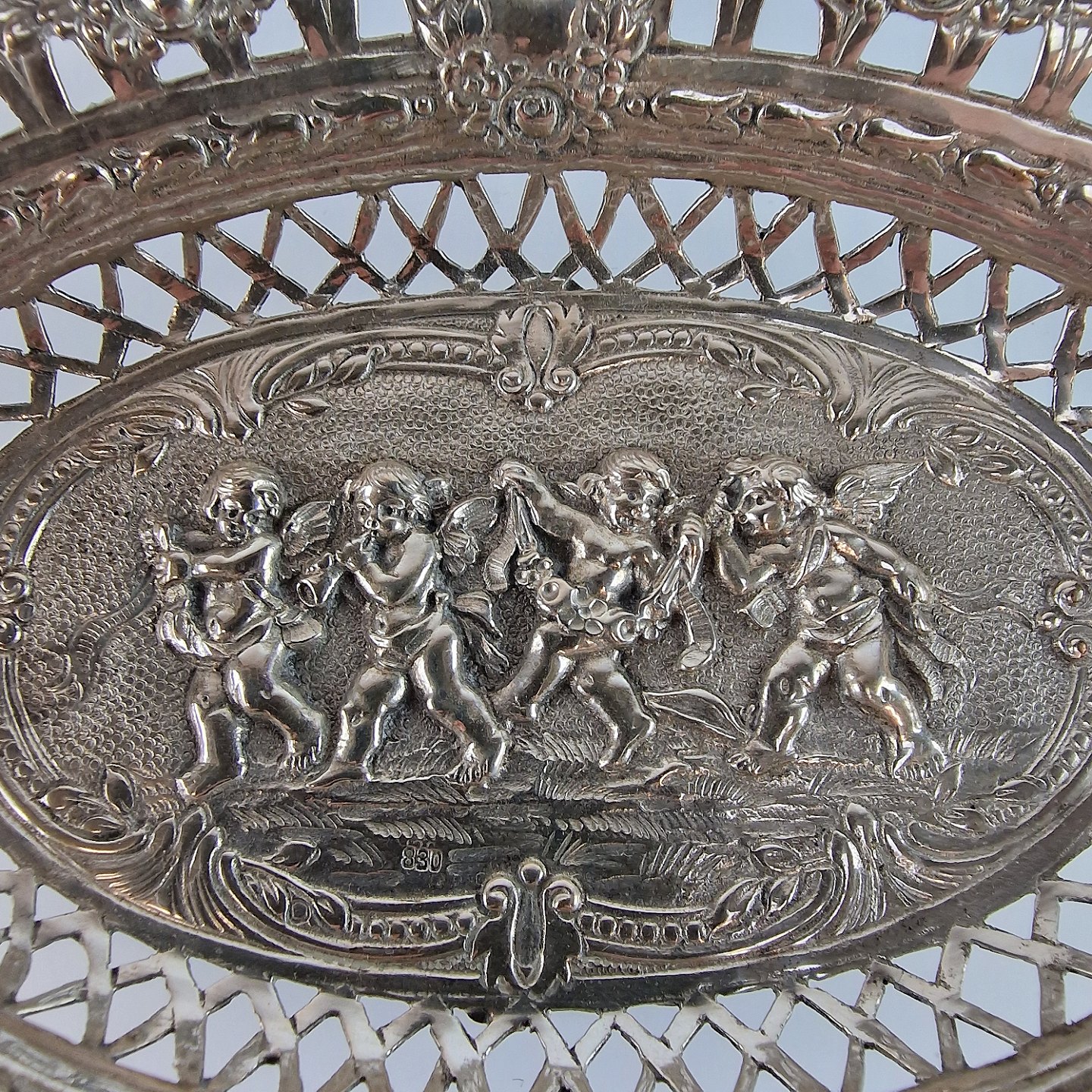 Ovalt fad dekoreret med engle med musikinstrumenter. Fadet er stemplet 830 sølv