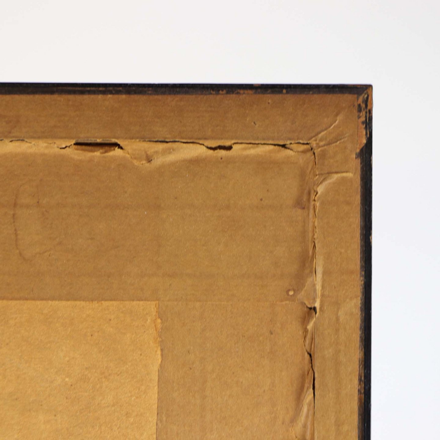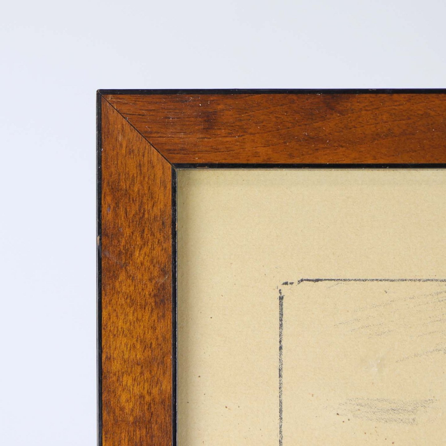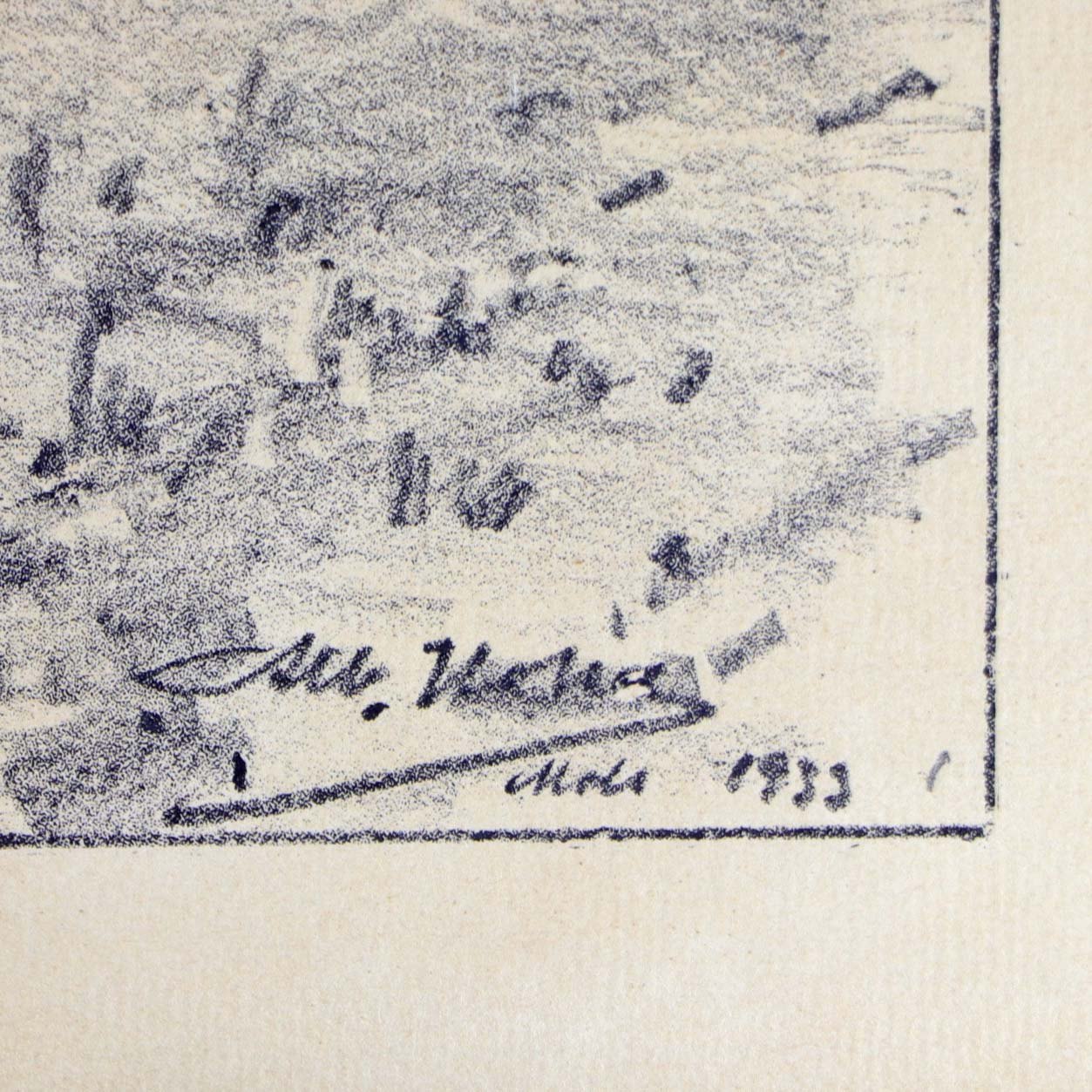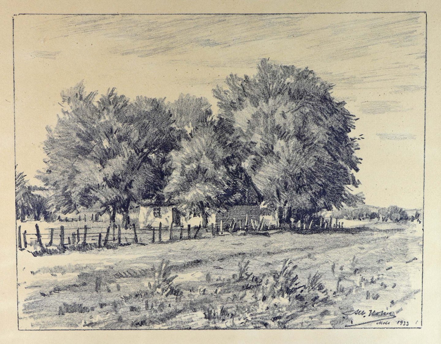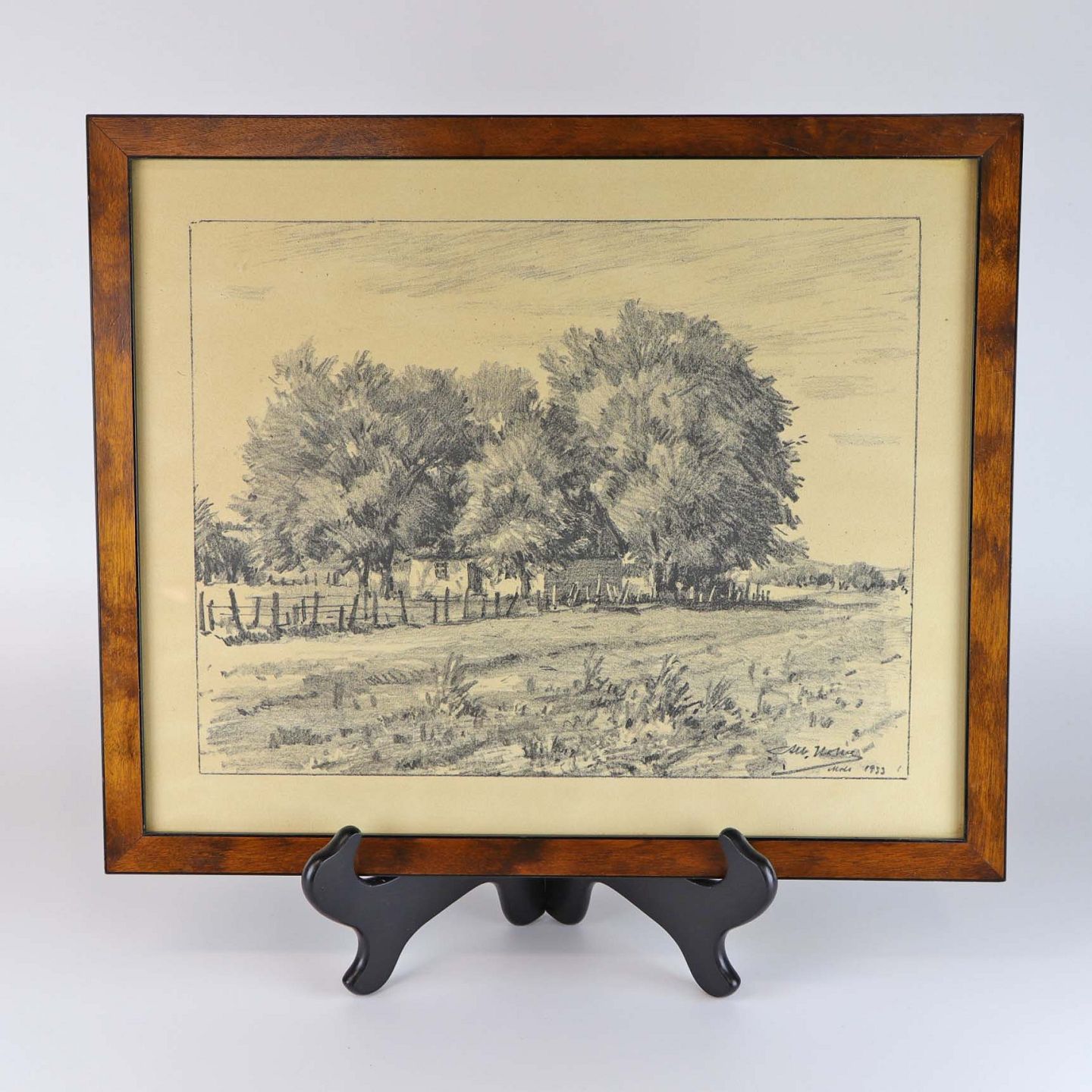 Glasindrammet radering af et stråtækt hus omkranset af træer. Dateret Mols 1933. Billedet er i en mørklakeret træramme.