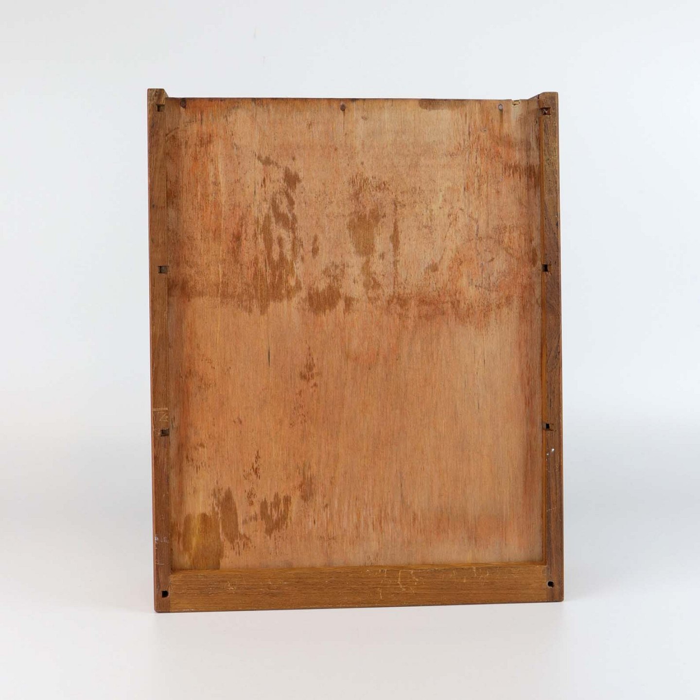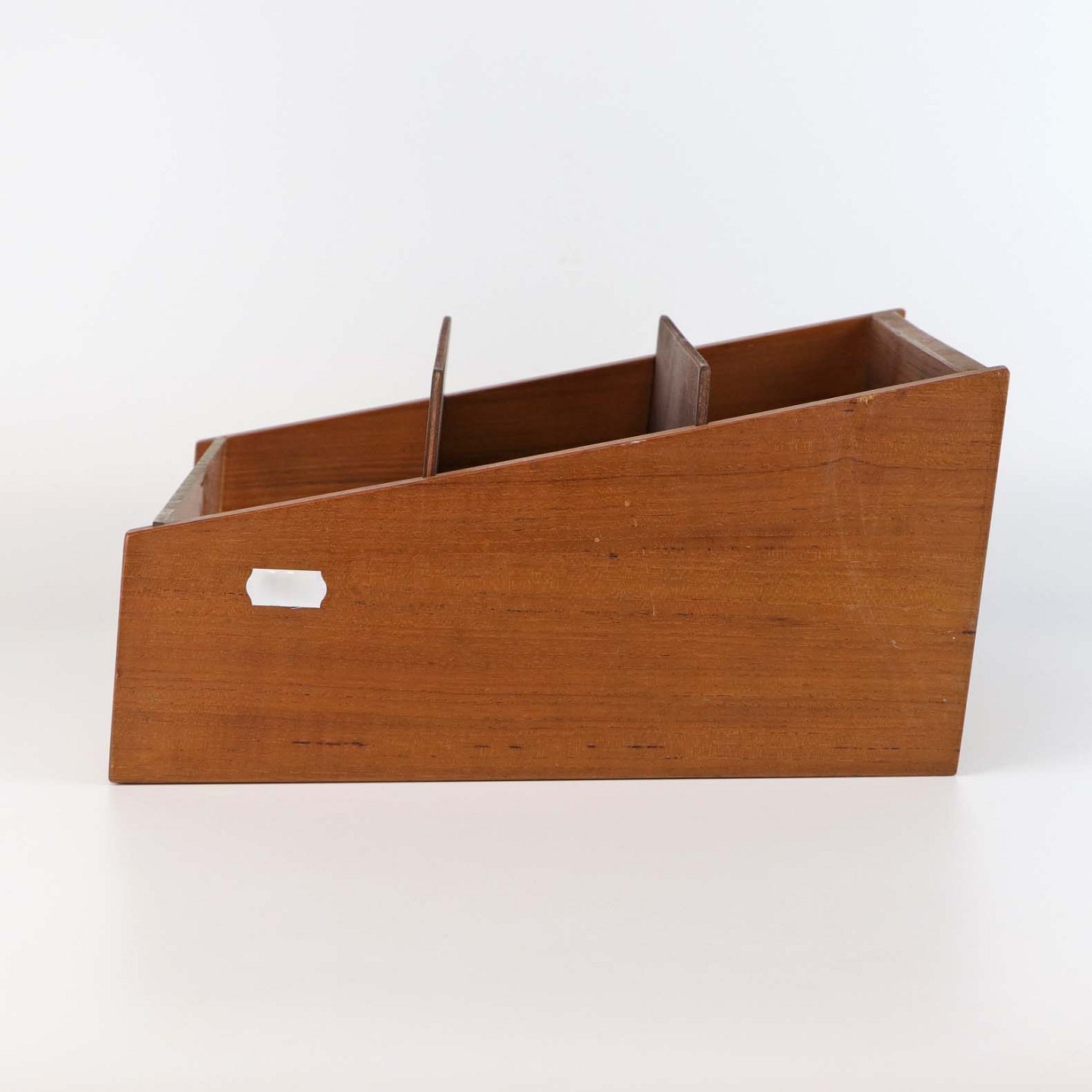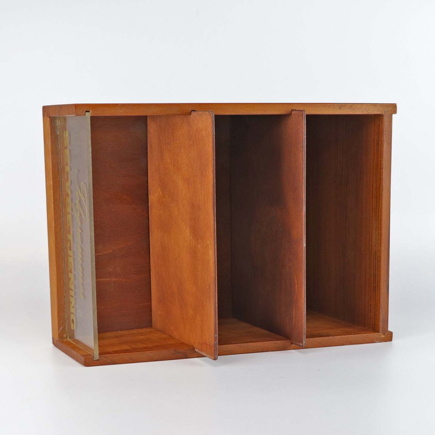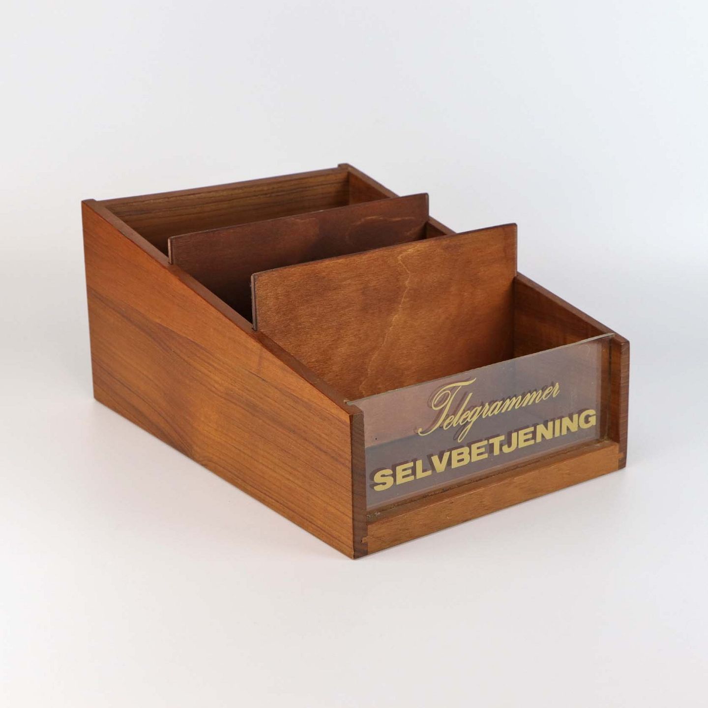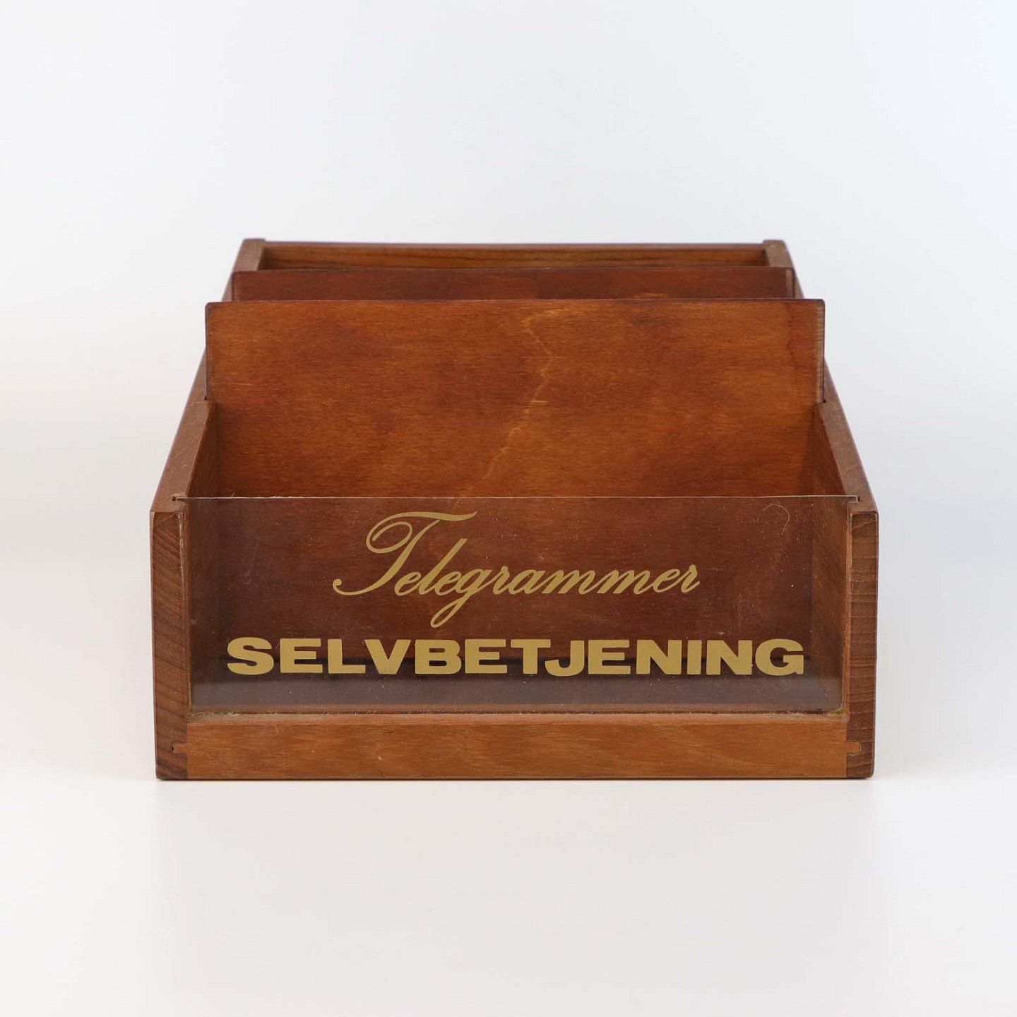 Ældre rumindelt kasse i træ med frontparti i plast med teksten Telegrammer selvbetjening