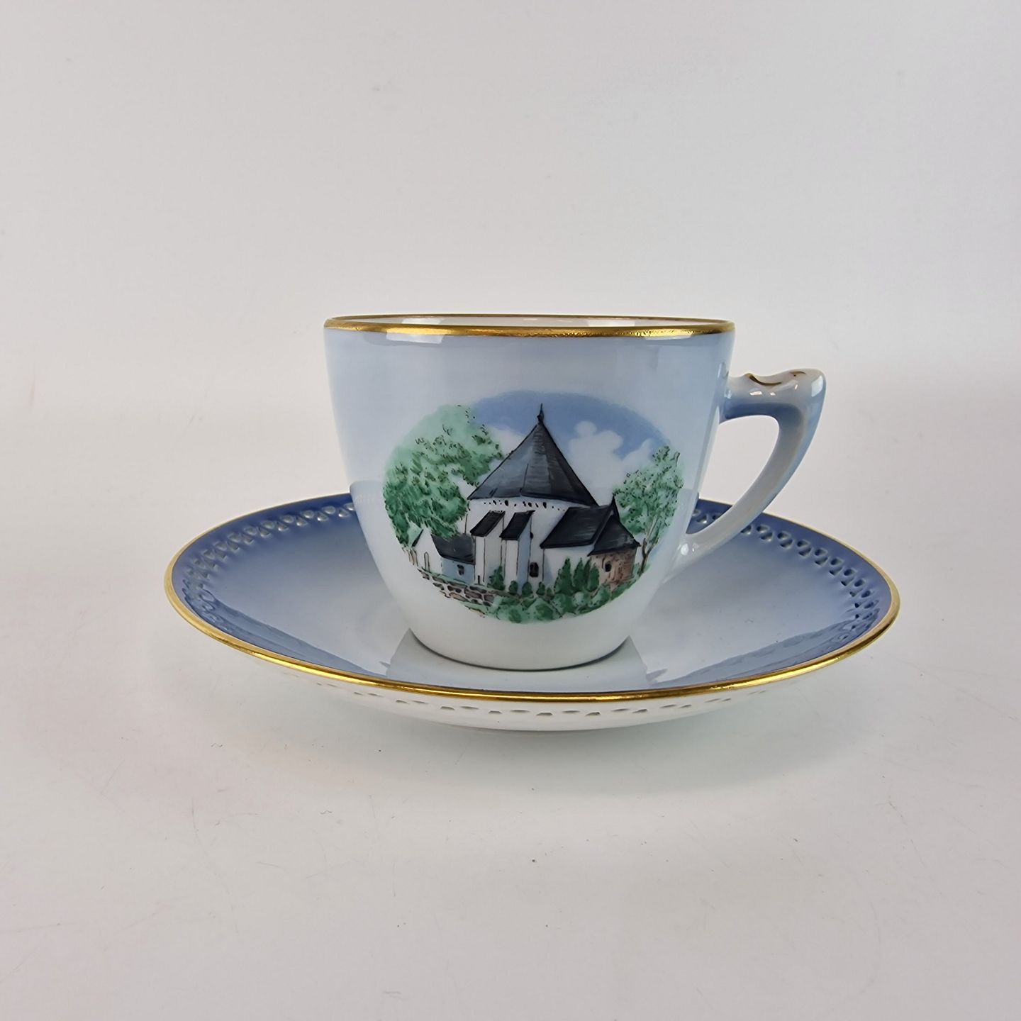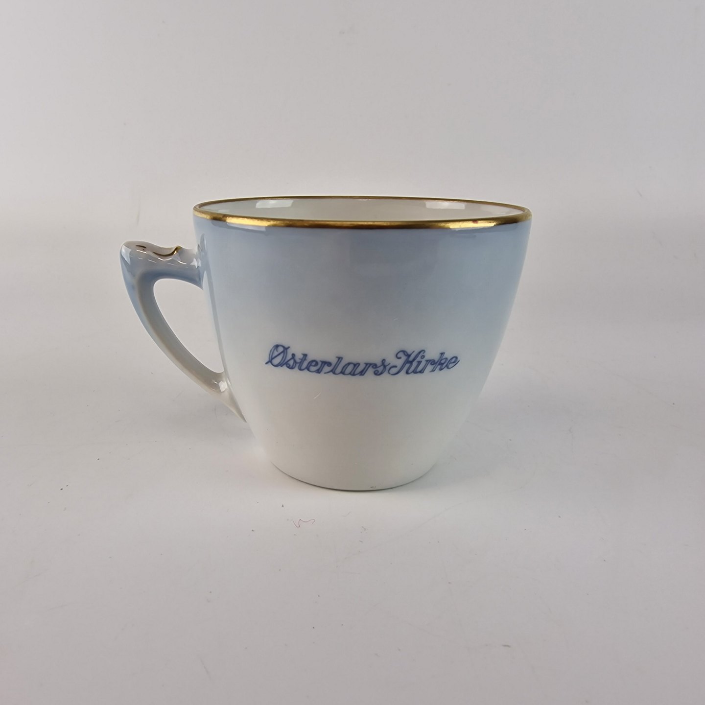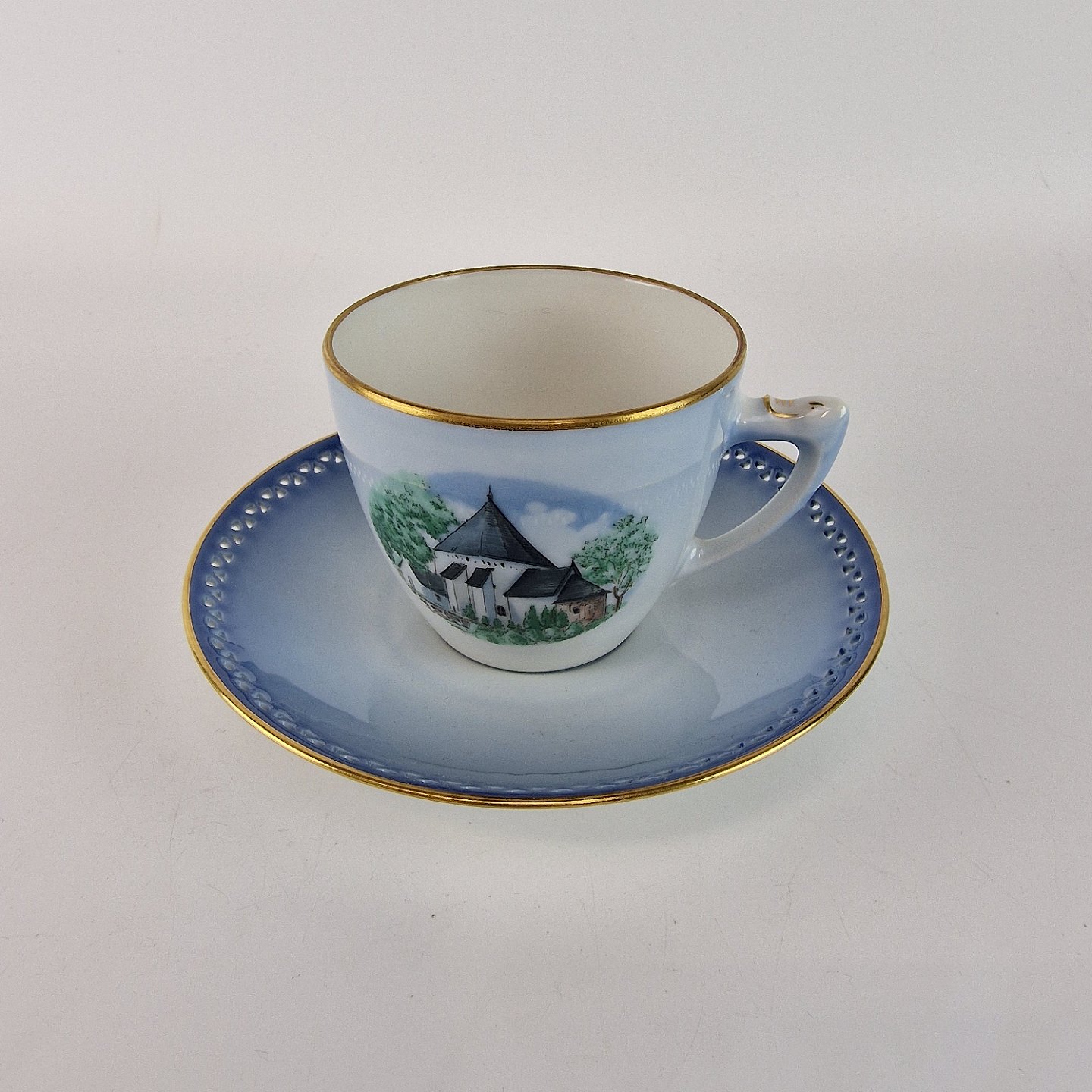 Porcelænskop og underkop i porcelæn fra serien Danmarksstellet. Sættet er dekoreret med Østerlars Kirke. Kop nr. 305. Underkop nr. 305,5
