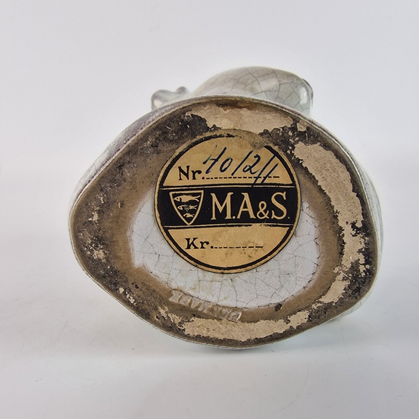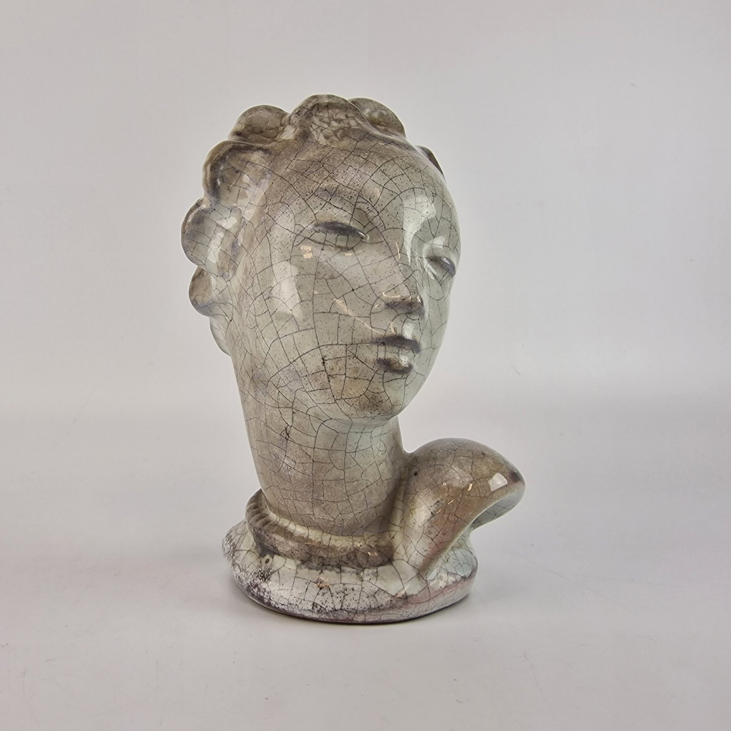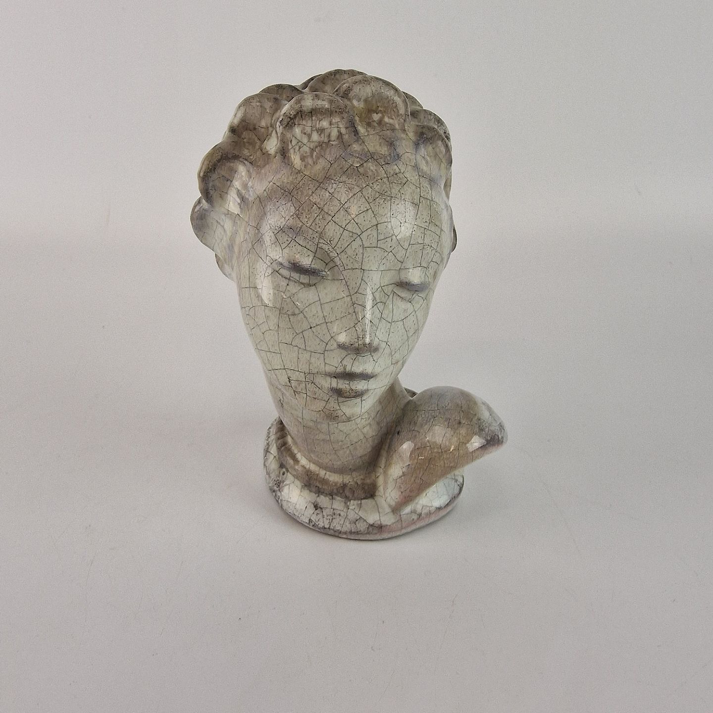Buste af keramik formet som et kvindehoved. Glaseringen er krakeleret