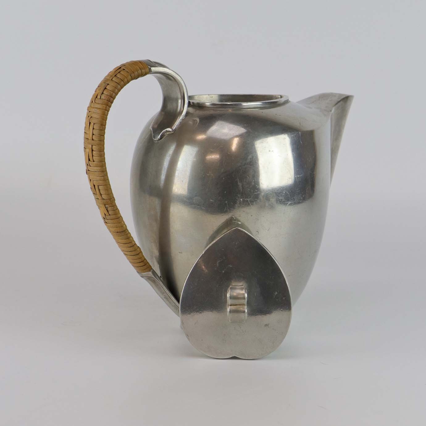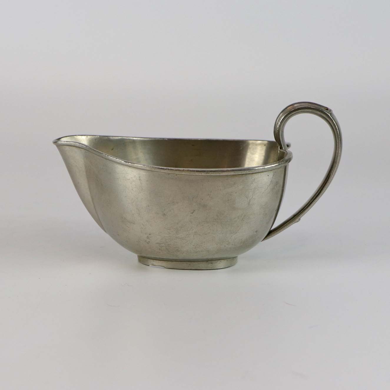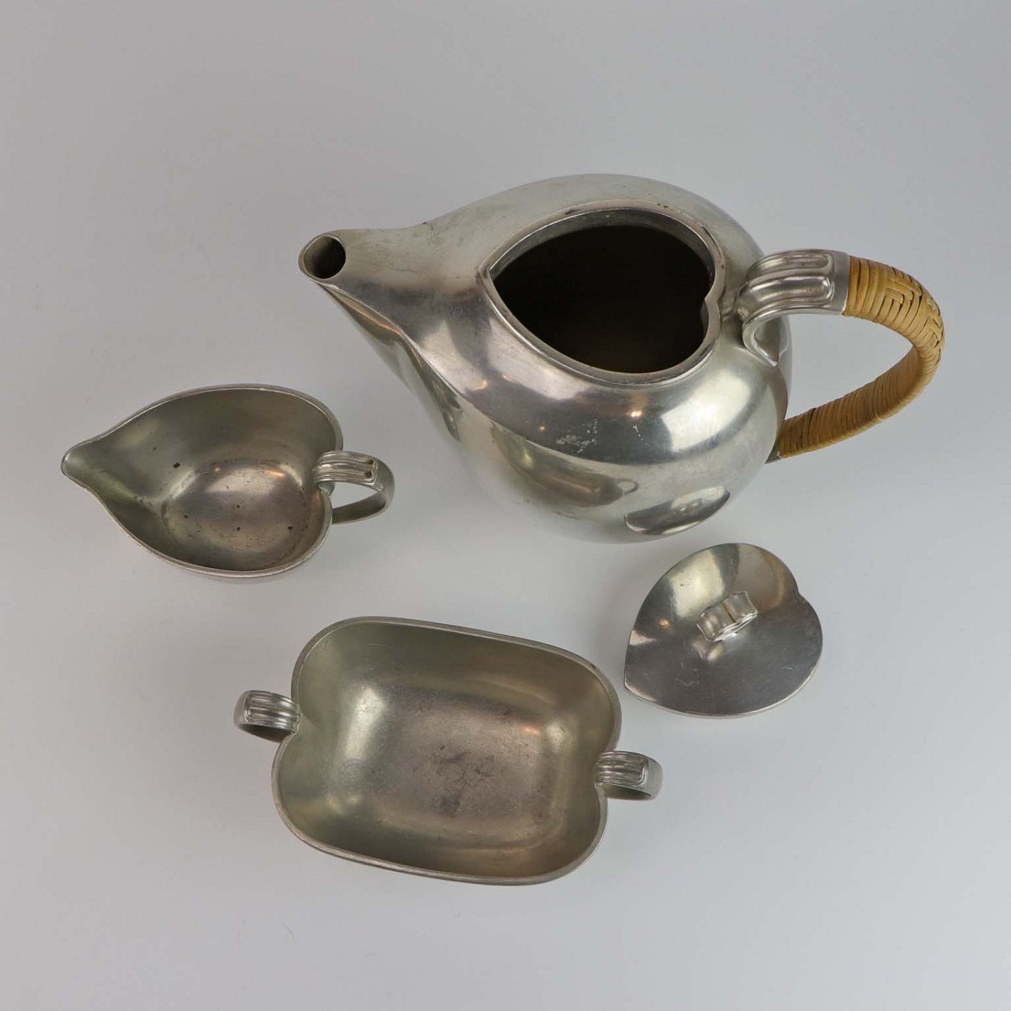 Sæt med tre dele fremstillet i tin. Tekande med flettet hank, flødekande og sukkerskål nr 2272