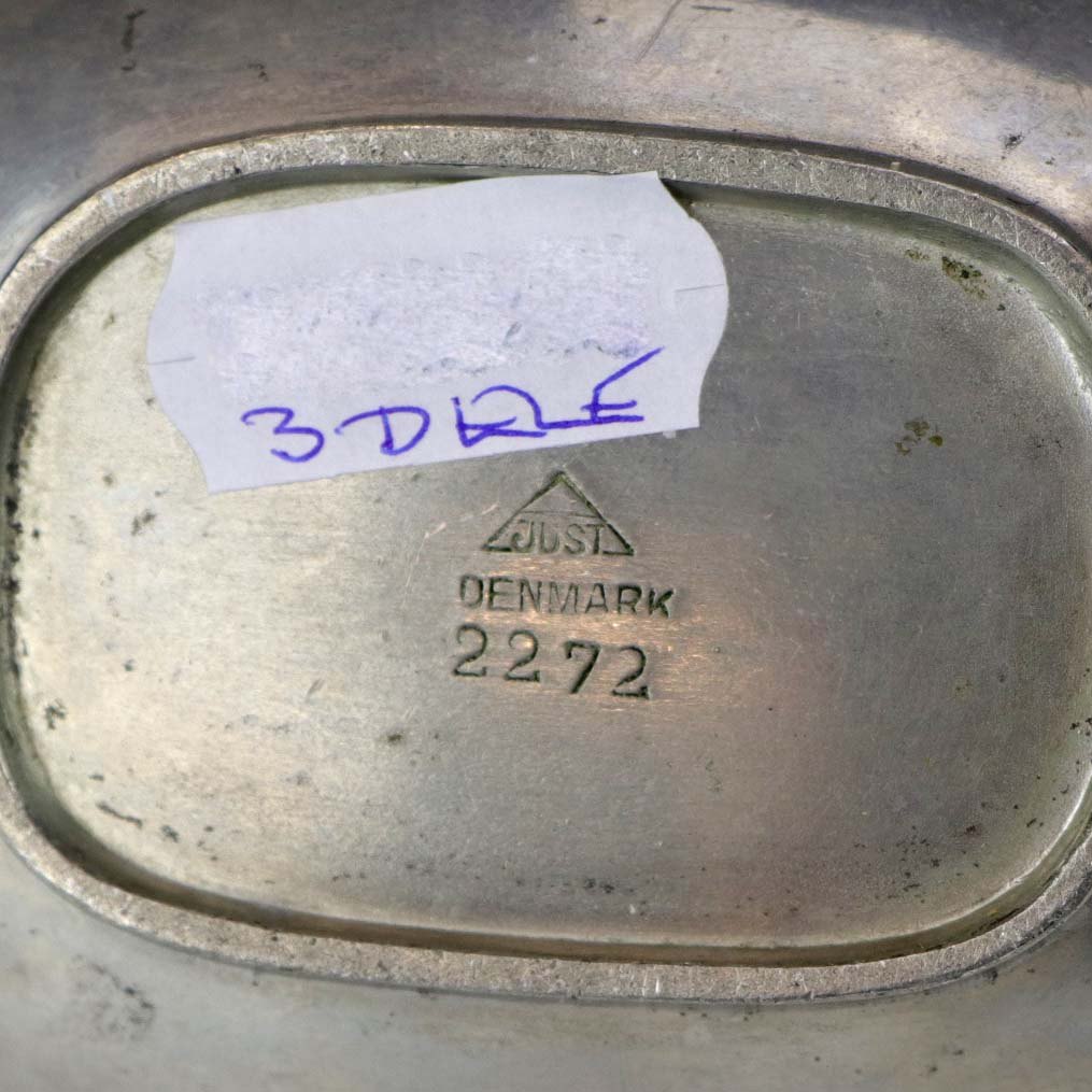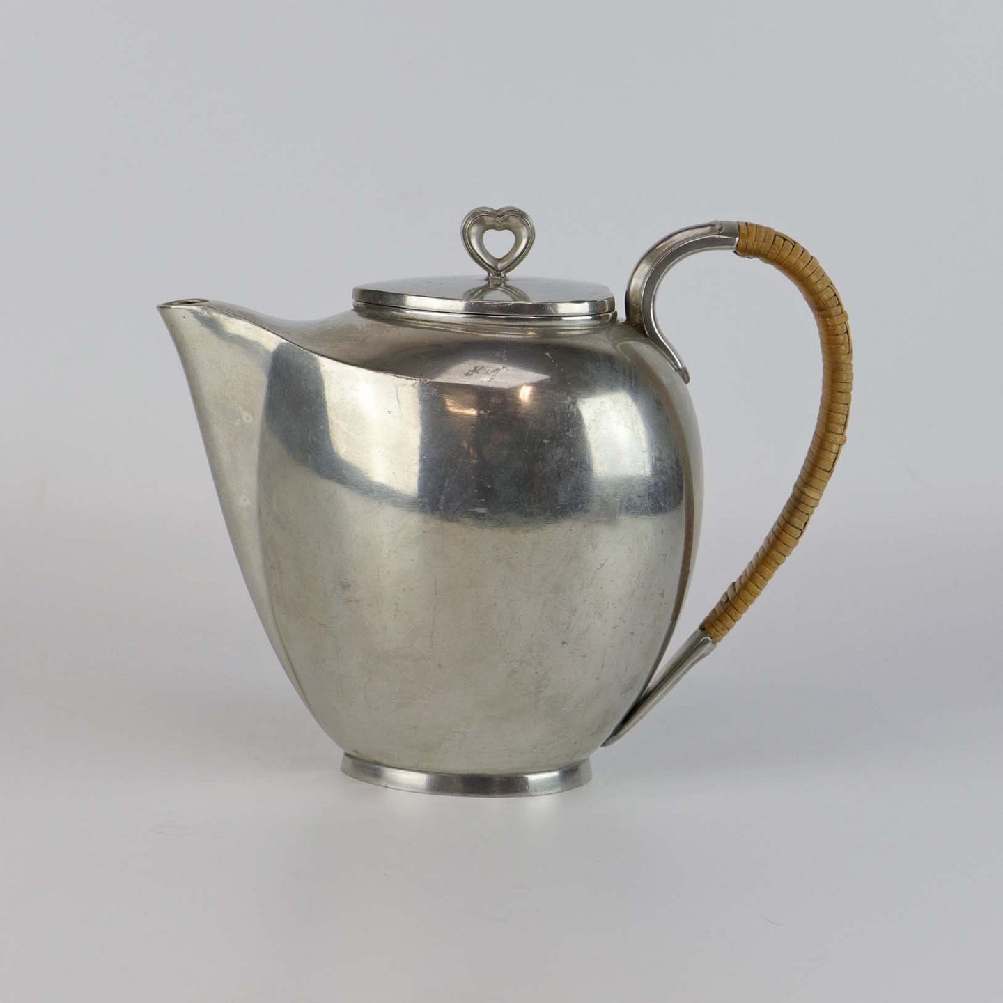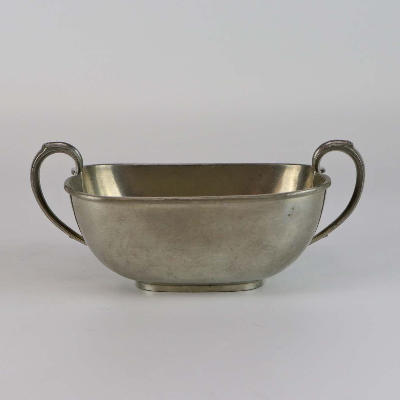 Sæt med tre dele fremstillet i tin. Tekande med flettet hank, flødekande og sukkerskål nr 2272