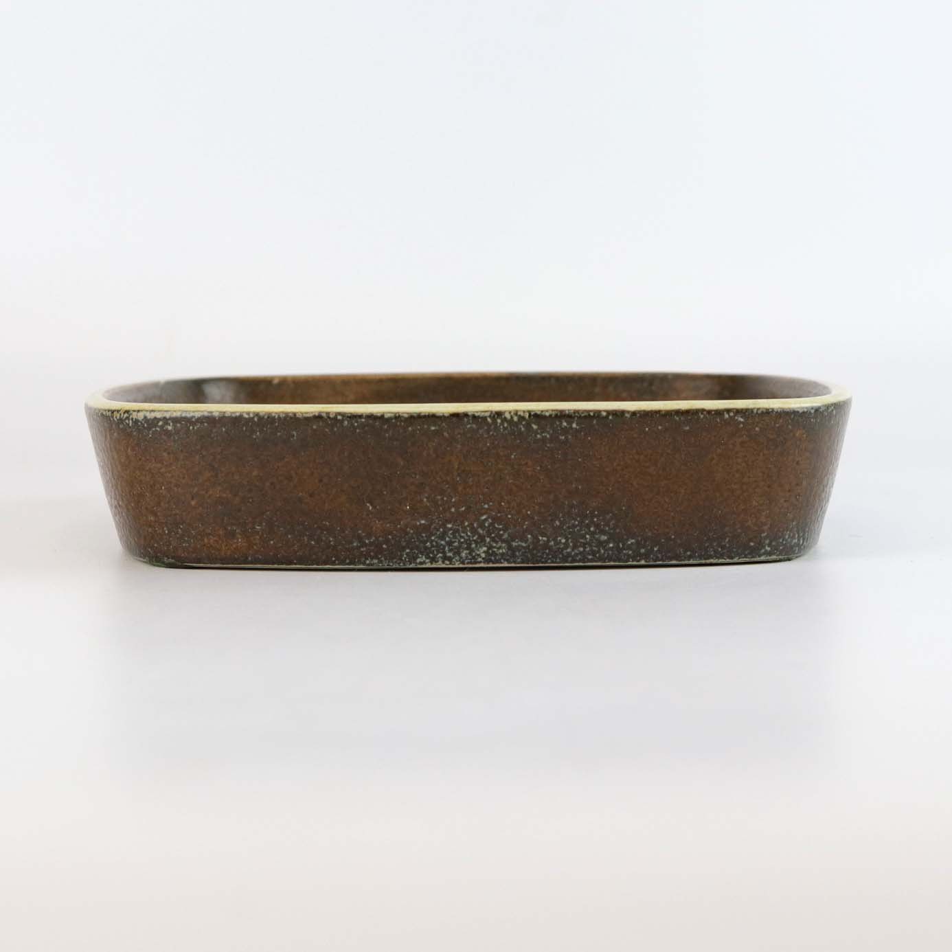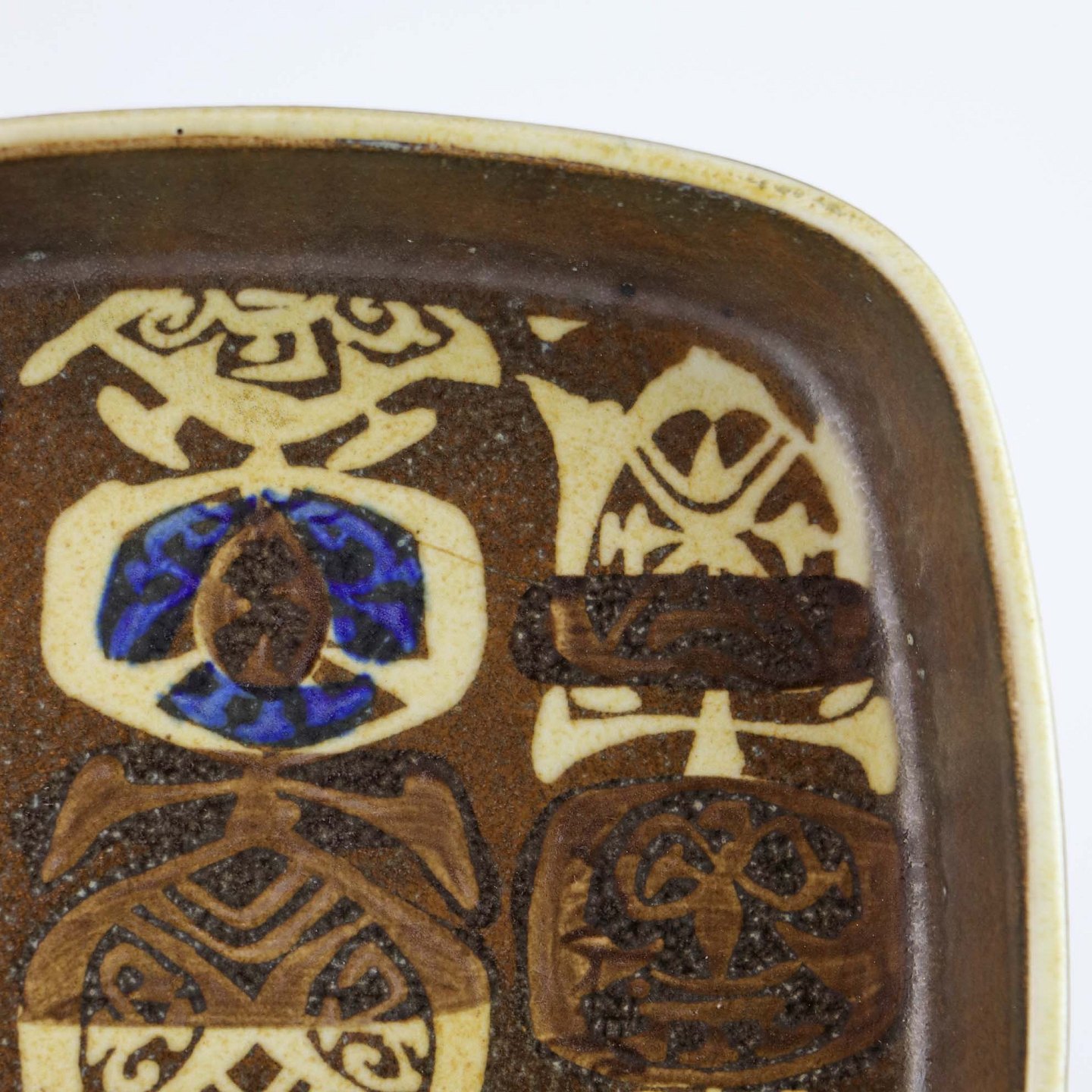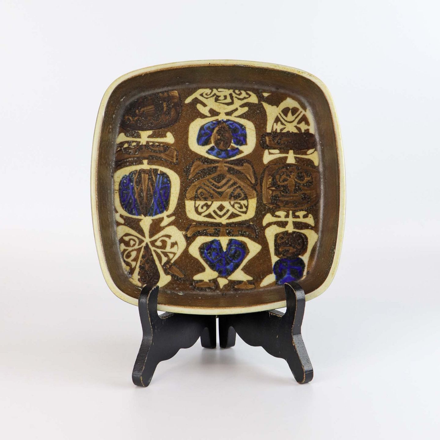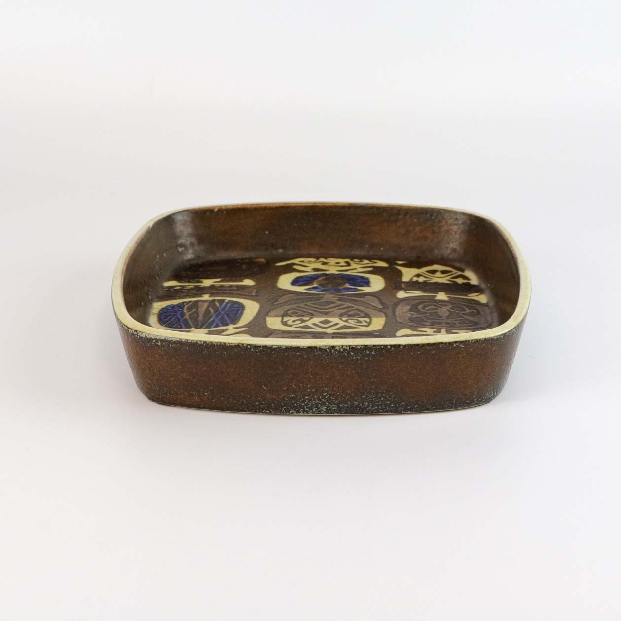 Lille firkantet Baca fad i fajance nr 734/2283 med abstrakt mønster i brune, gule og blå farver