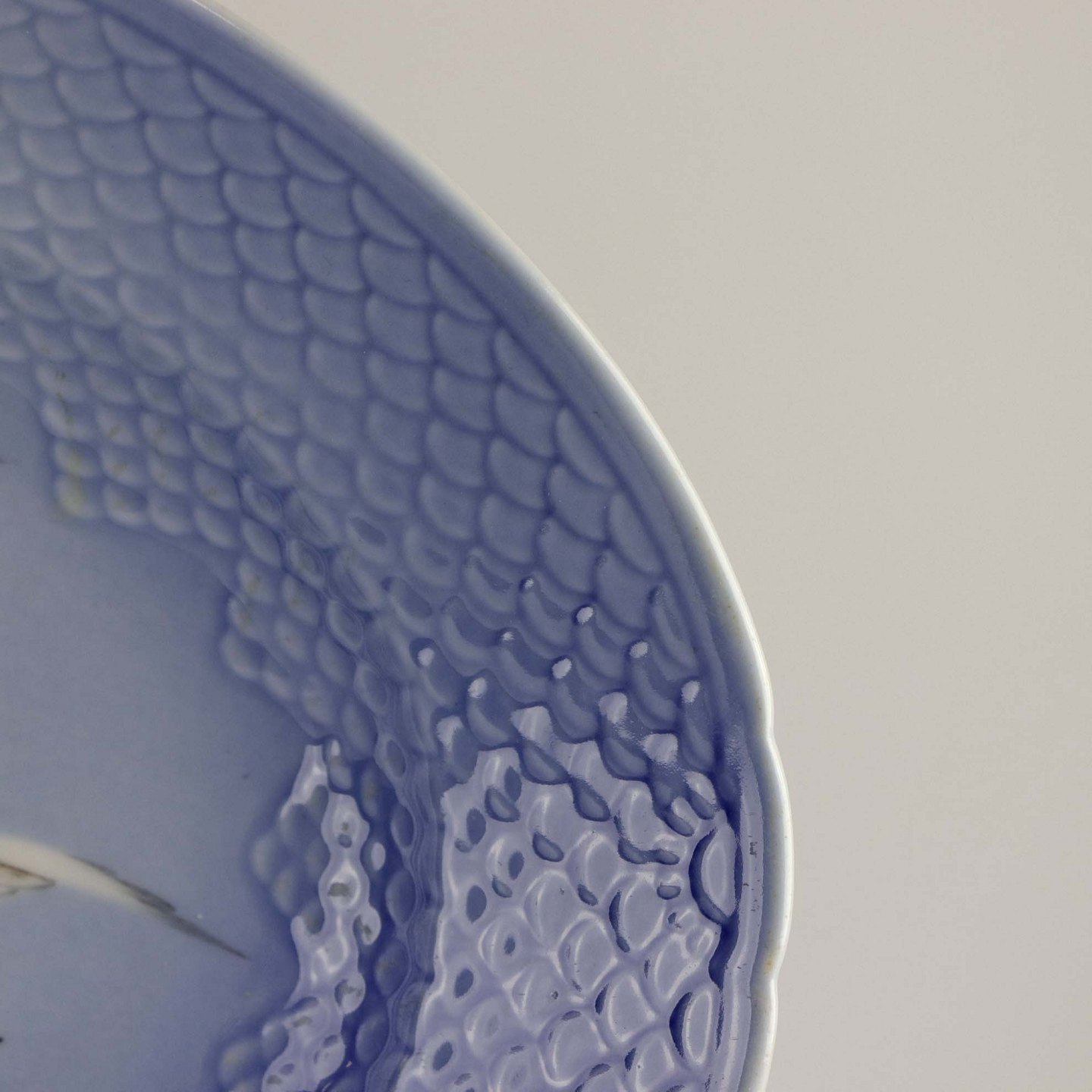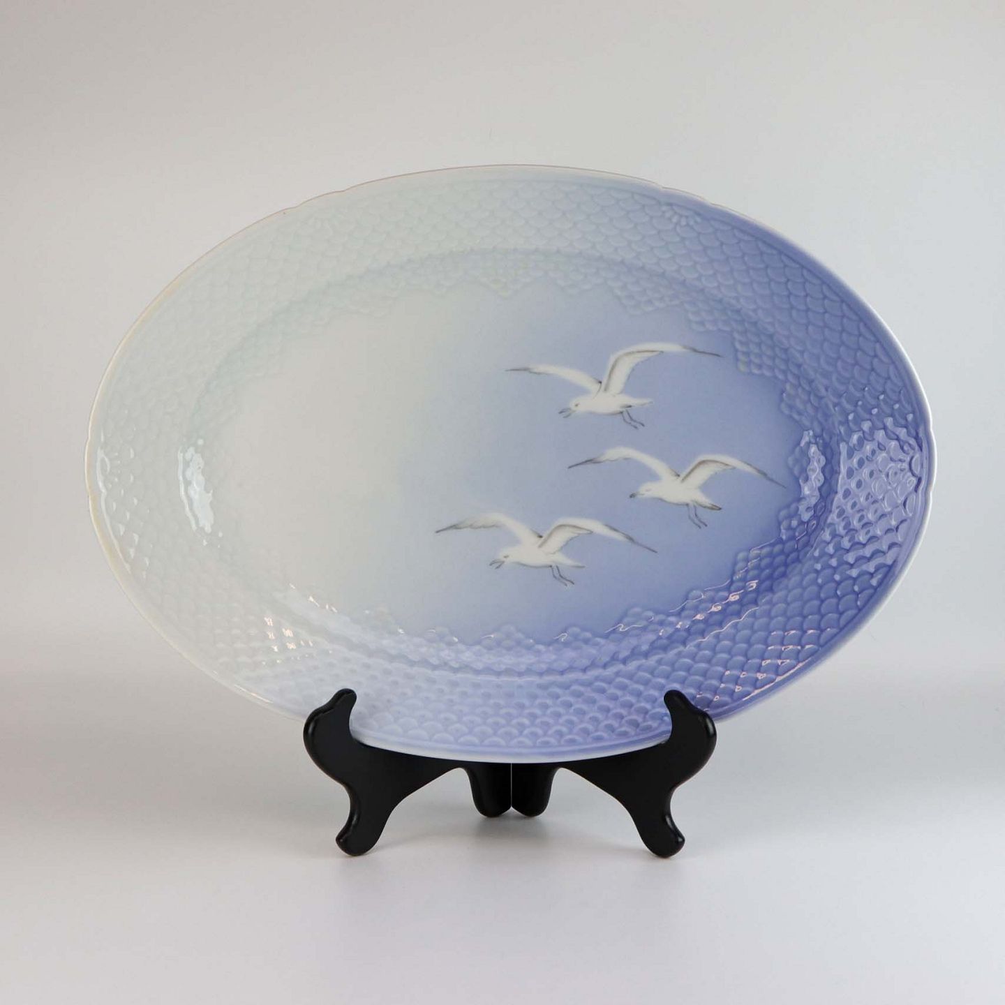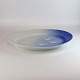 Serveringsfadet er i skelform fremstillet af porcelæn med blålige farver og motiv af måger