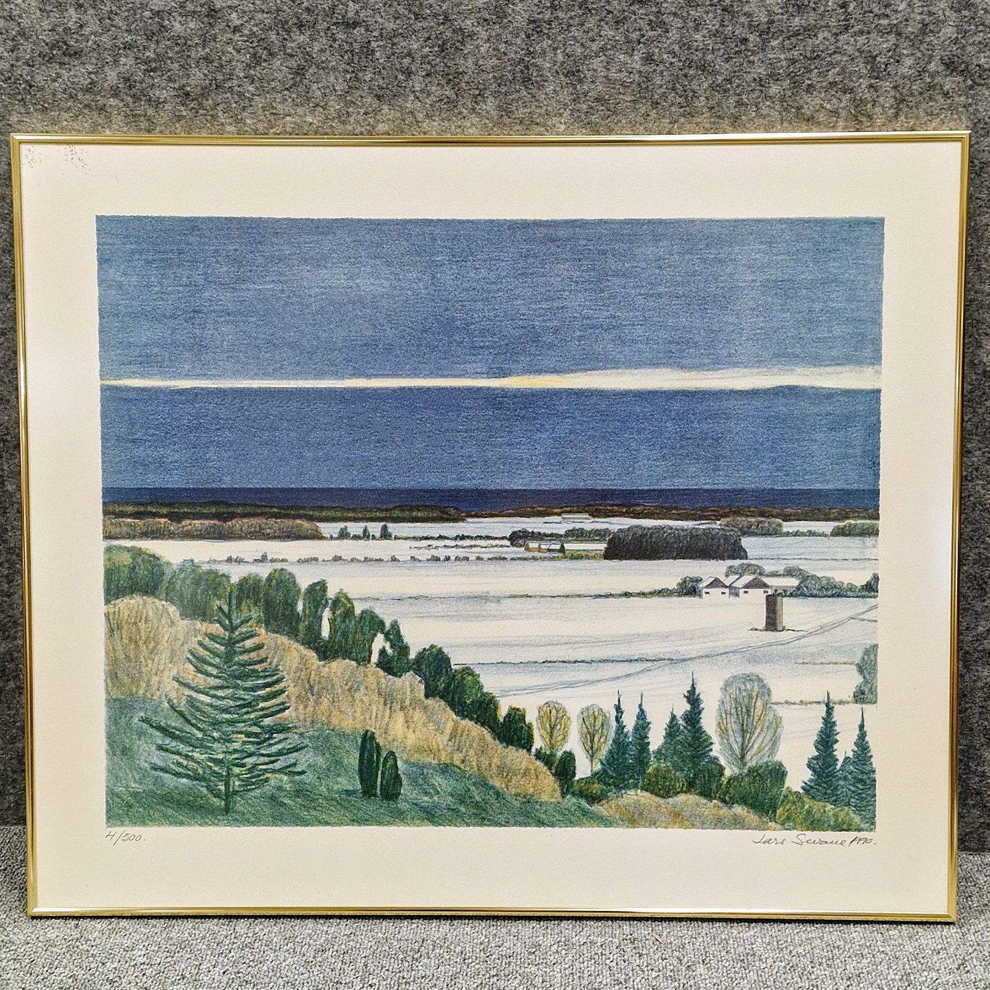 Indrammet litografisk tryk i gylden ramme med Landskabsmotiv af sneklædt marker omkranset af træer med udsigt til havet nr 4/500