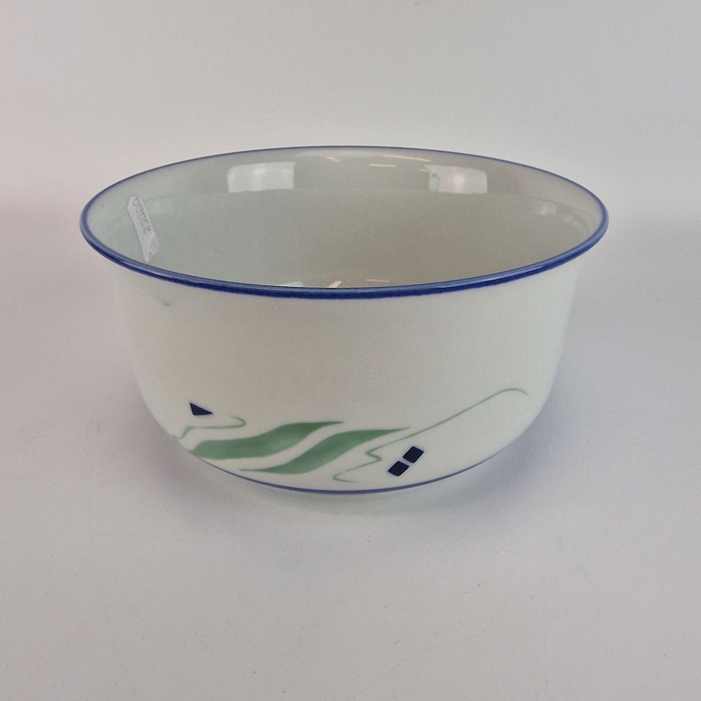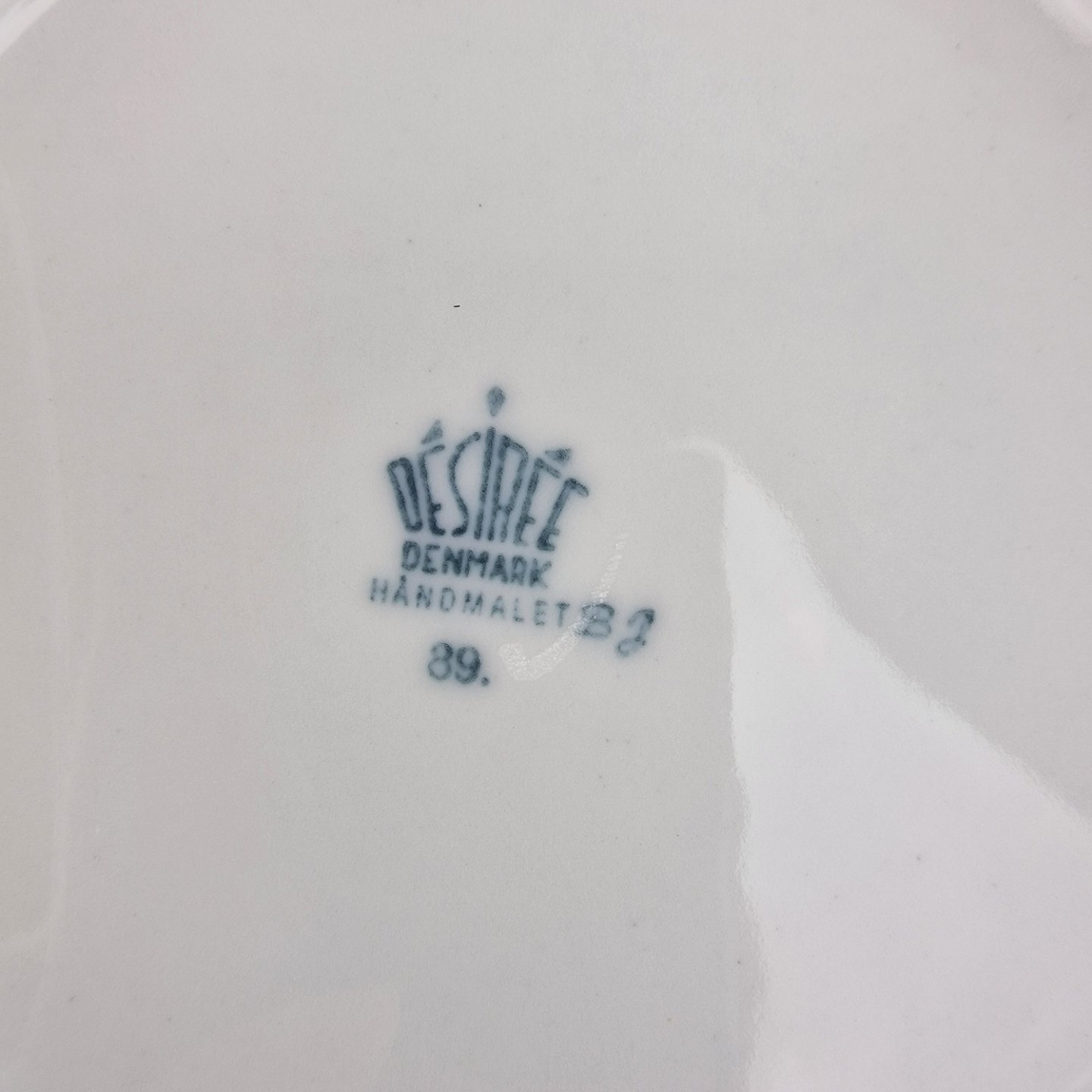 Springtime er af porcelæn, som er glaseret hvidt, malet med blå striber og abstrakt mønster i en lys grøn og blå farve.