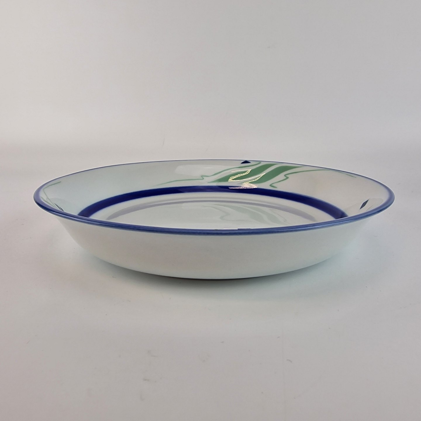 Springtime er af porcelæn, som er glaseret hvidt, malet med blå striber og abstrakt mønster i en lys grøn og blå farve.