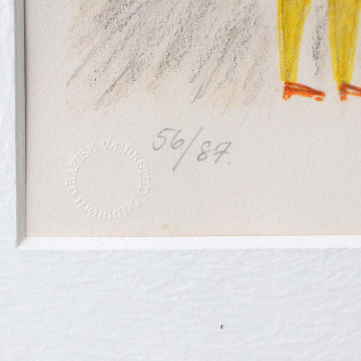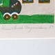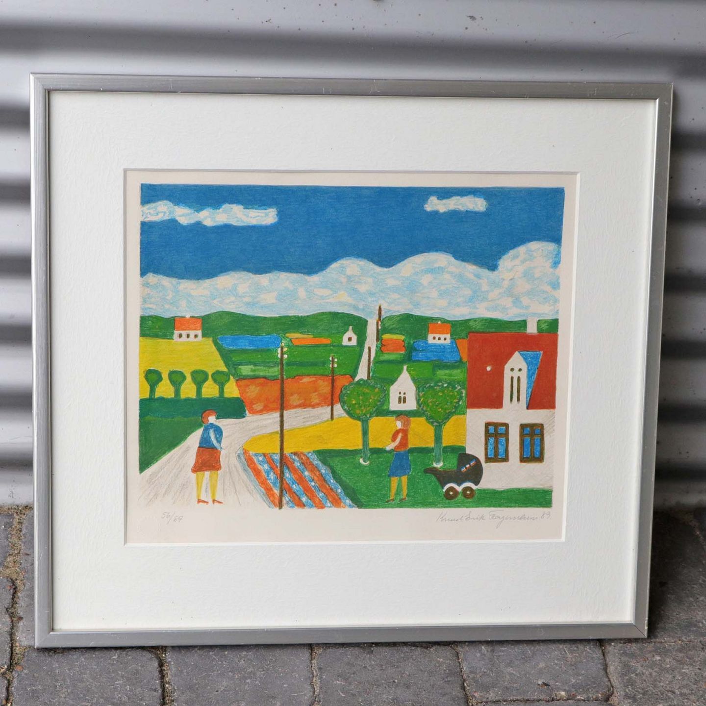 Indrammet litografi i passepartout med sølvmalet ramme. Litografisk tryk nr. 56/87 fra år 1989 med titlen Landskab med barnevogn, hvor motivet viser to kvinder i landsbyområde.