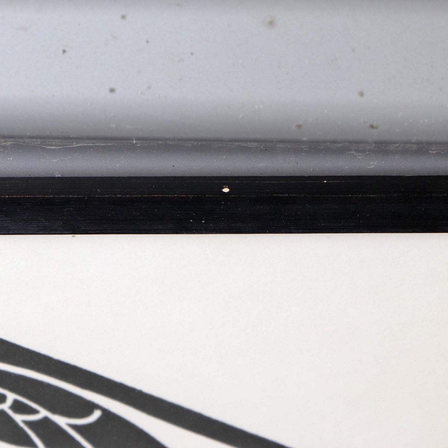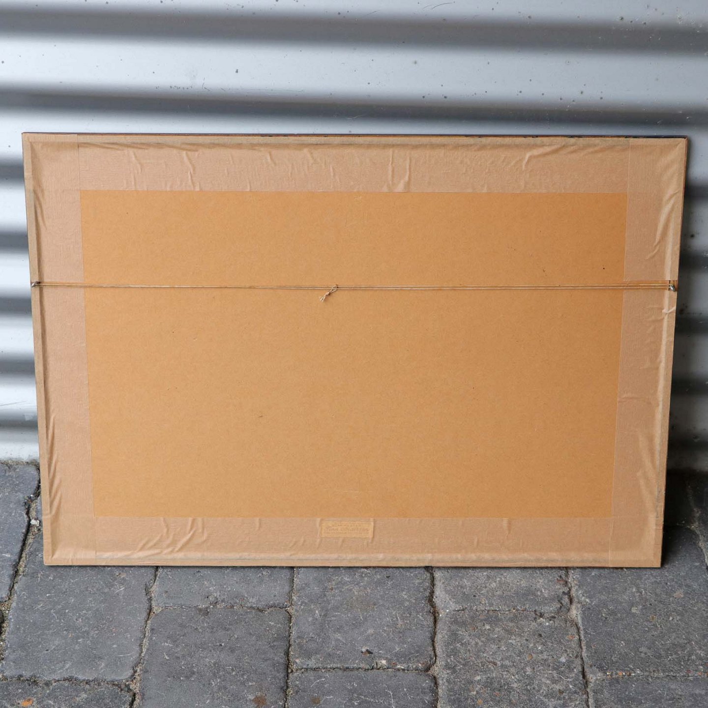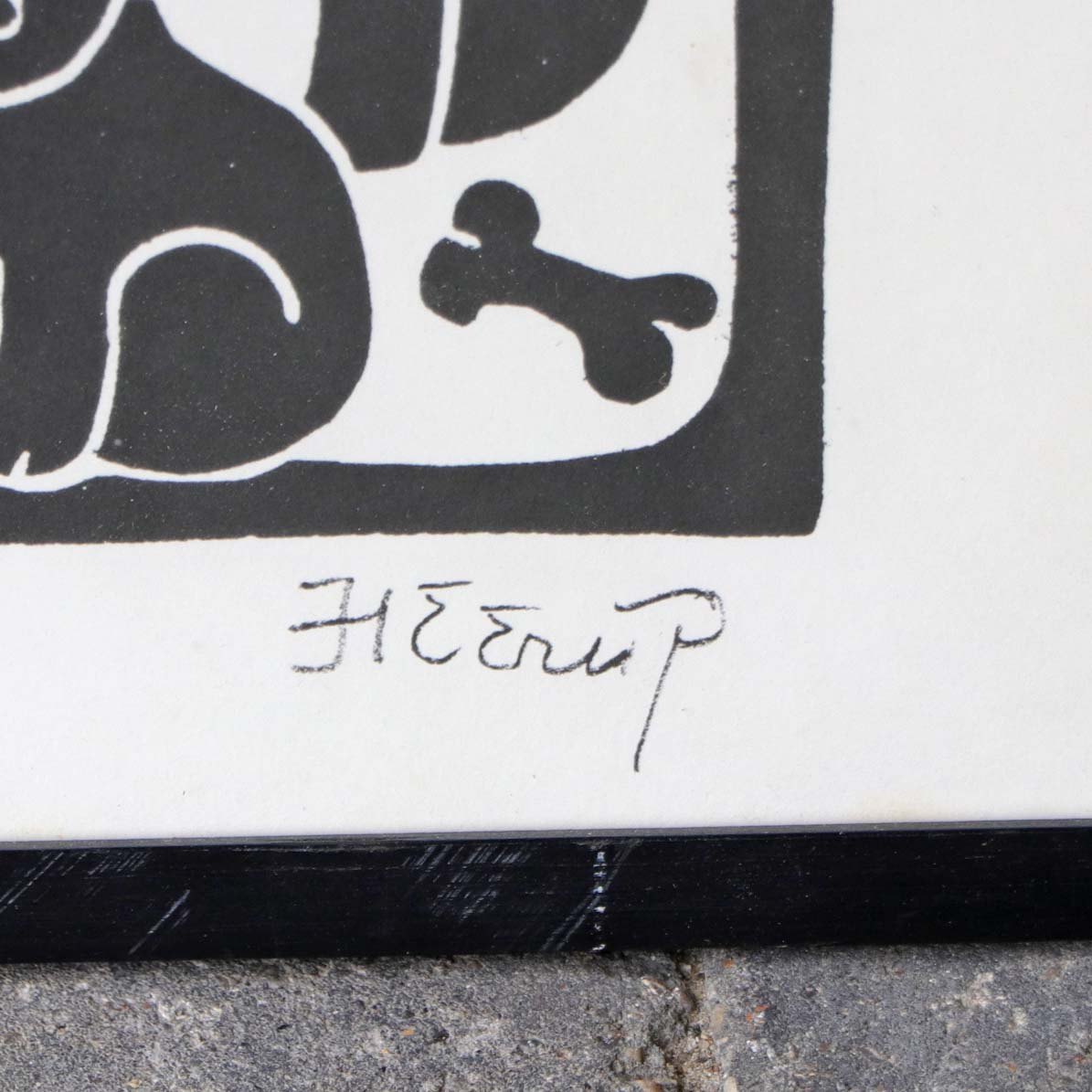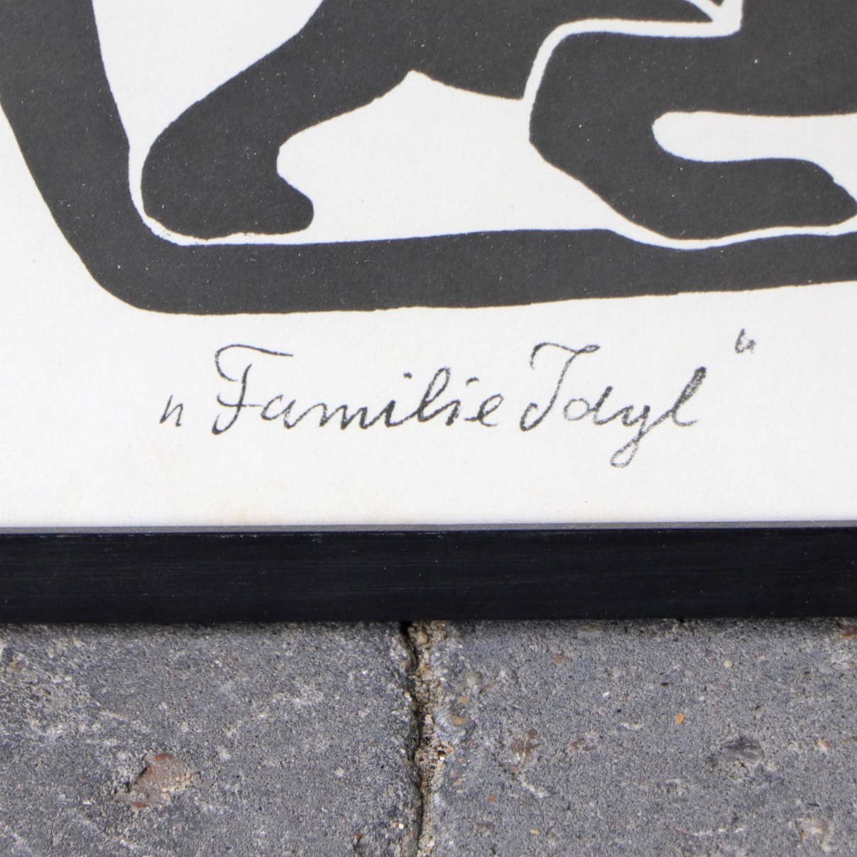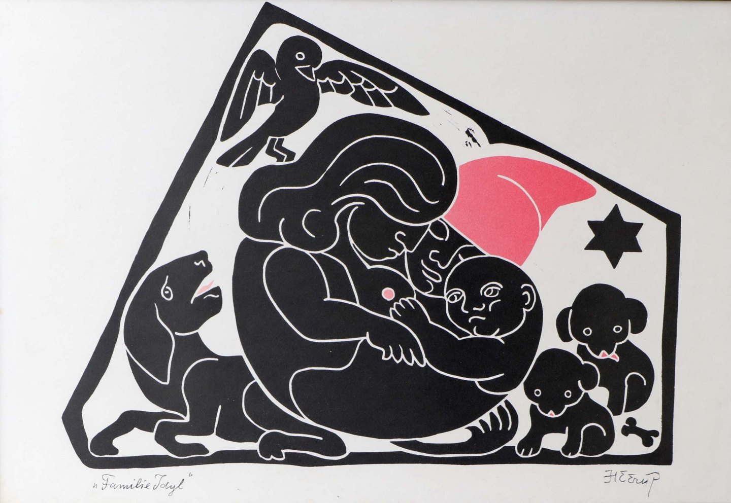 Indrammet litografi i sort ramme. Grafisk tryk i sort, hvidt og rødt under titlen Familieidyl. Motivet viser mor med barn og hund med hvalpe under en svævende fugl og et rødt hjerte