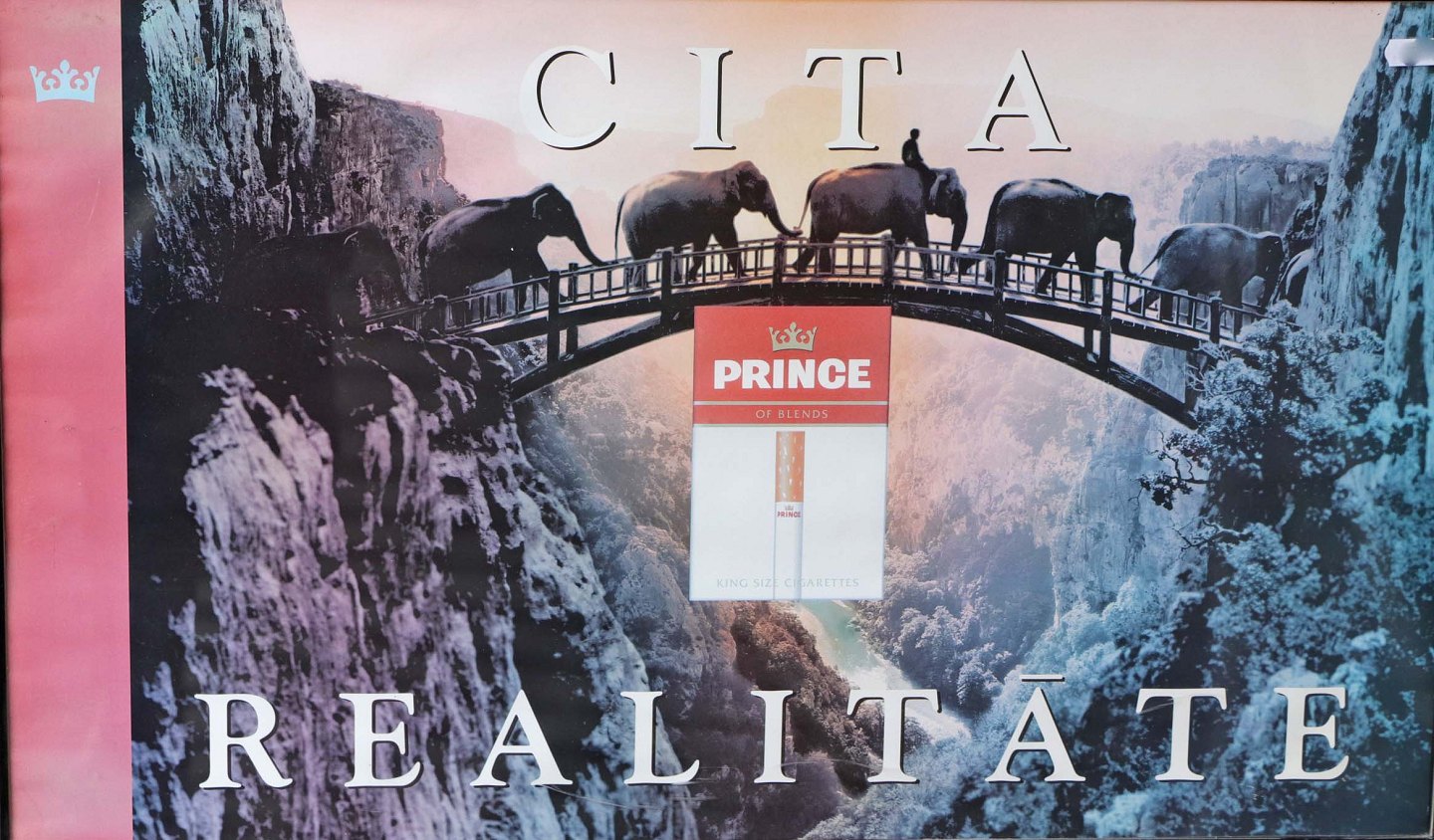 Indrammet tryk i sort ramme. Udenlandsk reklametryk for Prince cigaretter med titlen Cita Realitâte (Rumænsk og betyder: Citat Virkeligheden) med motiv af en cigaretpakke, hvor baggrunden viser elefanter på vej over en bro, som forbinder kløften.