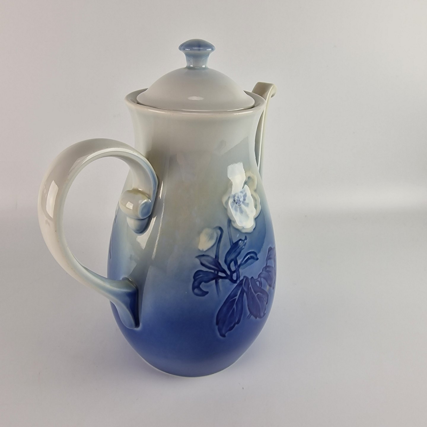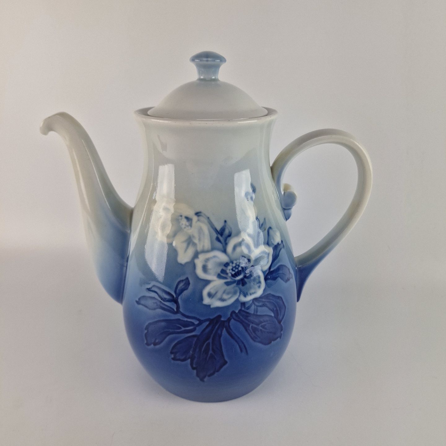 Julerose er hvidt porcelæn med gradueret blå farver, dekoreret med et motiv af en hvid julerose