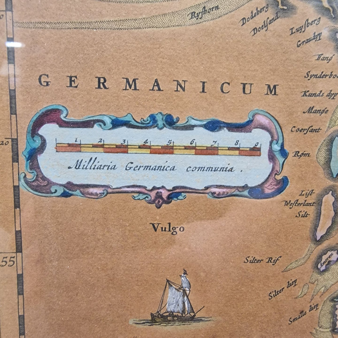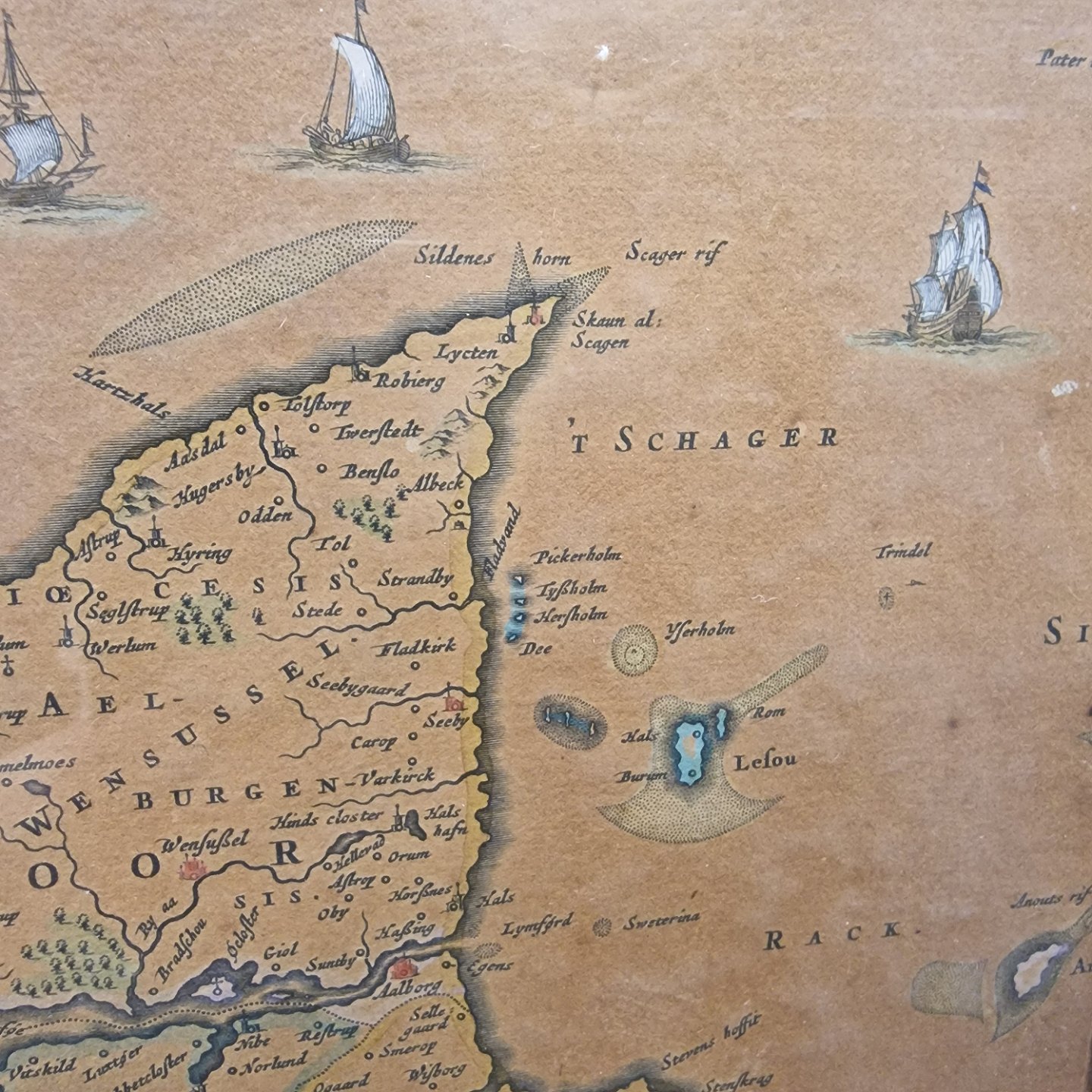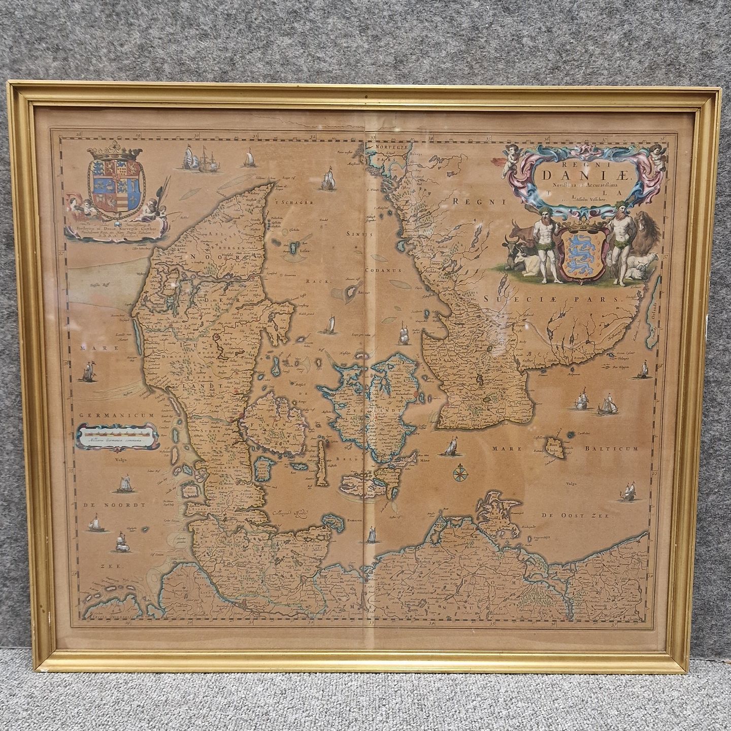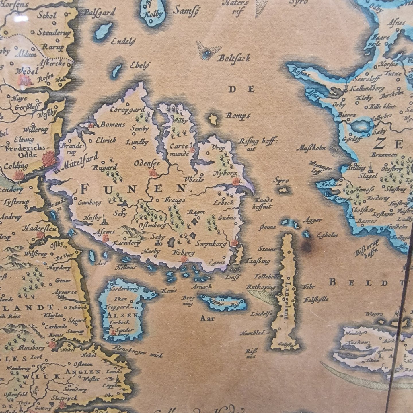 Danmarkskort fra før 1900 tallet. Bogtryk som er blevet koloreret. Bogtrykket er i ramme med glas