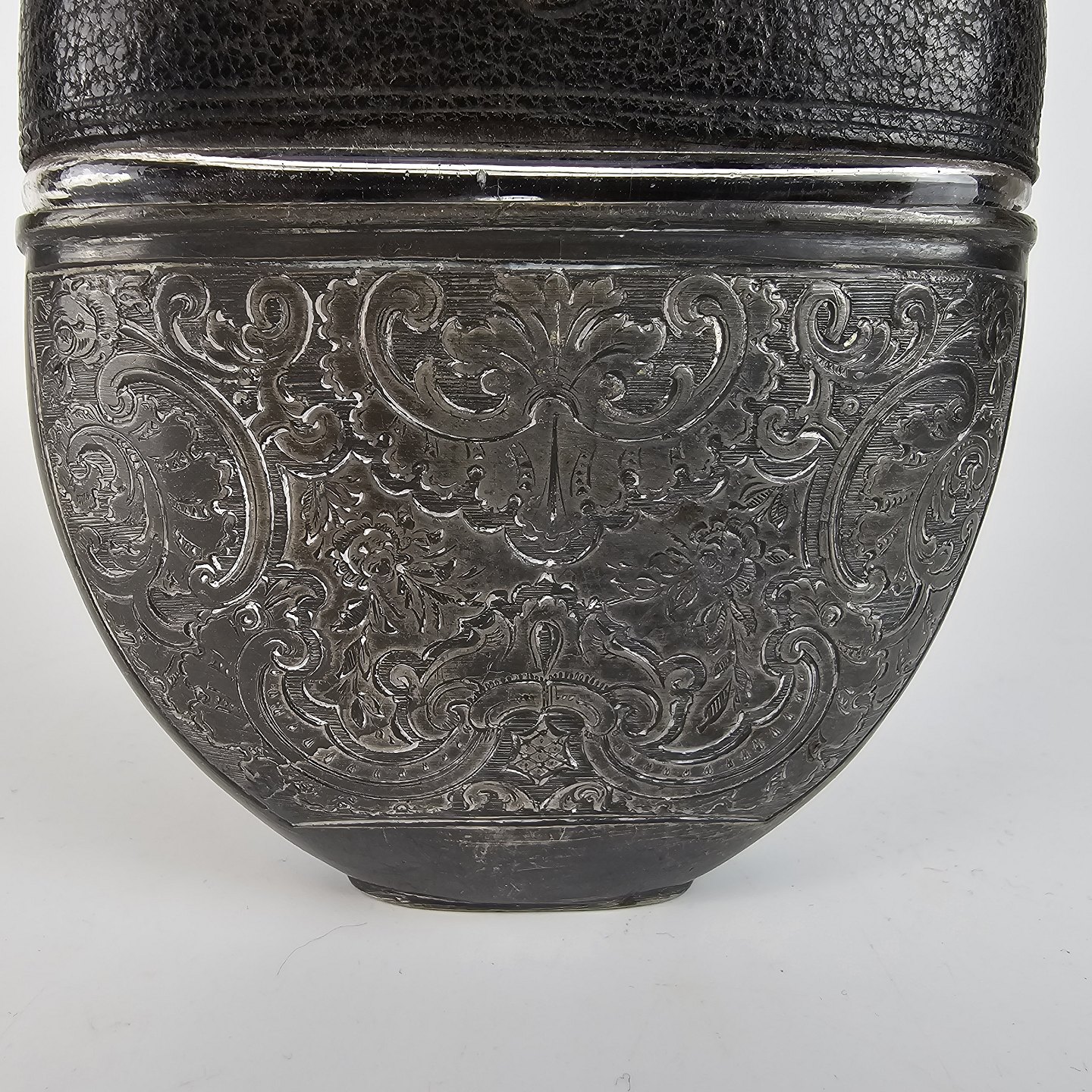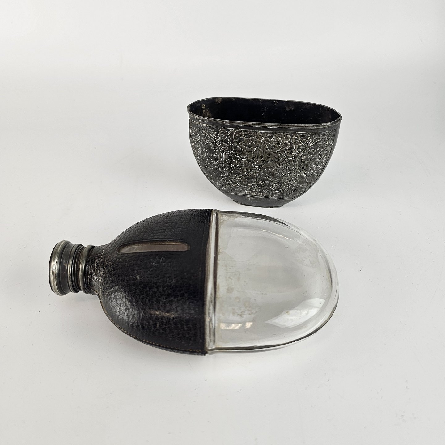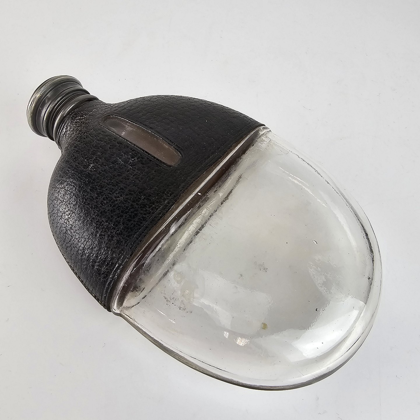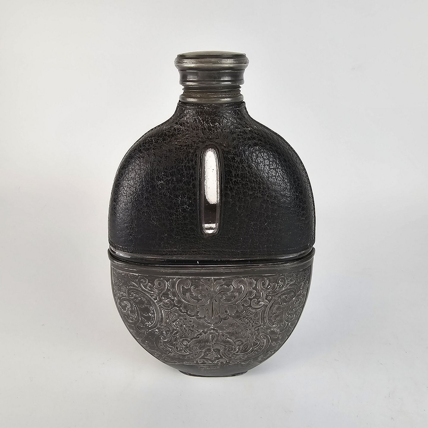 Lommelærke i glas og dekoreret med læder. Over bunden er der et aftaget krus lavet af tin