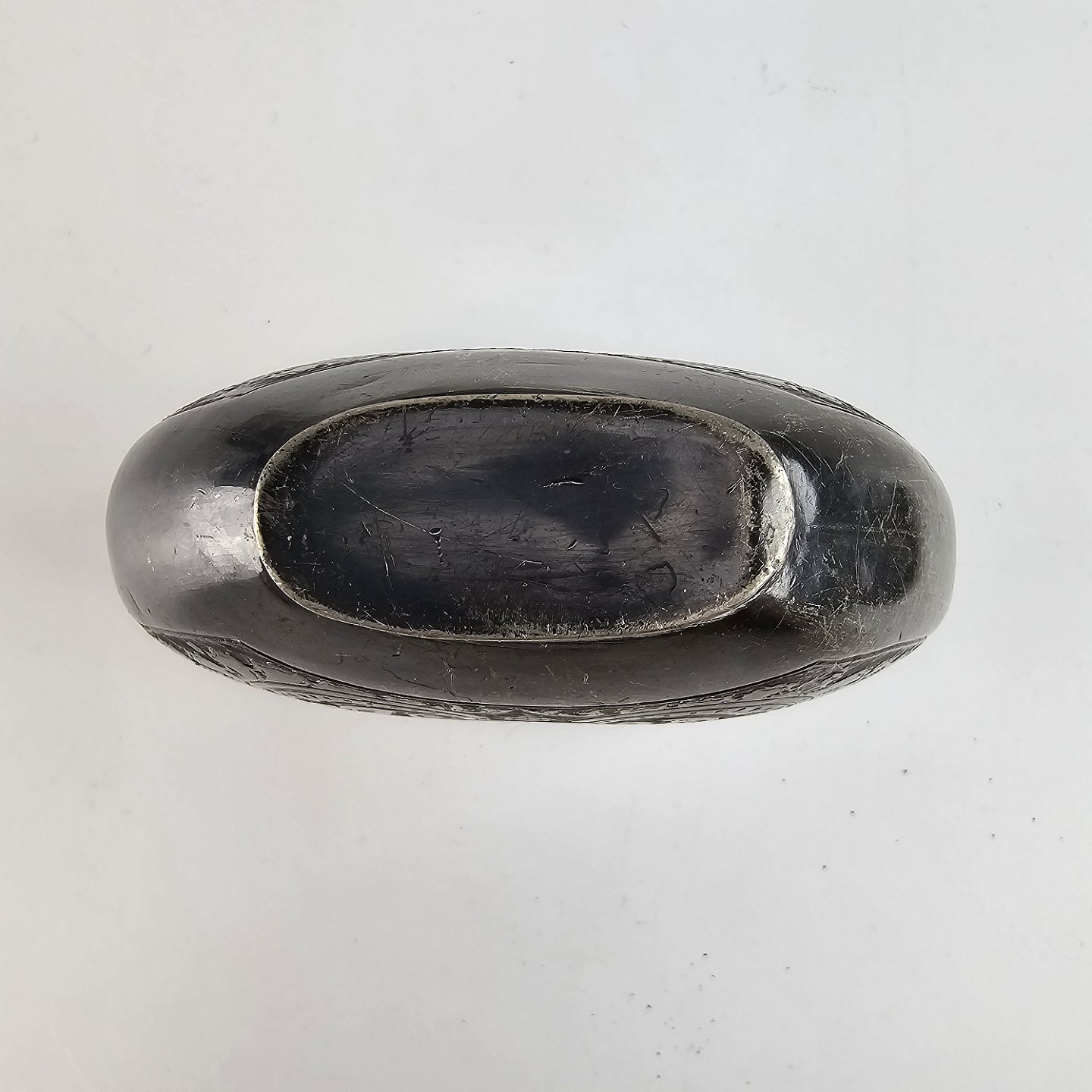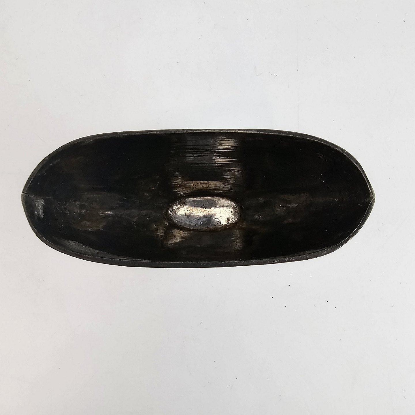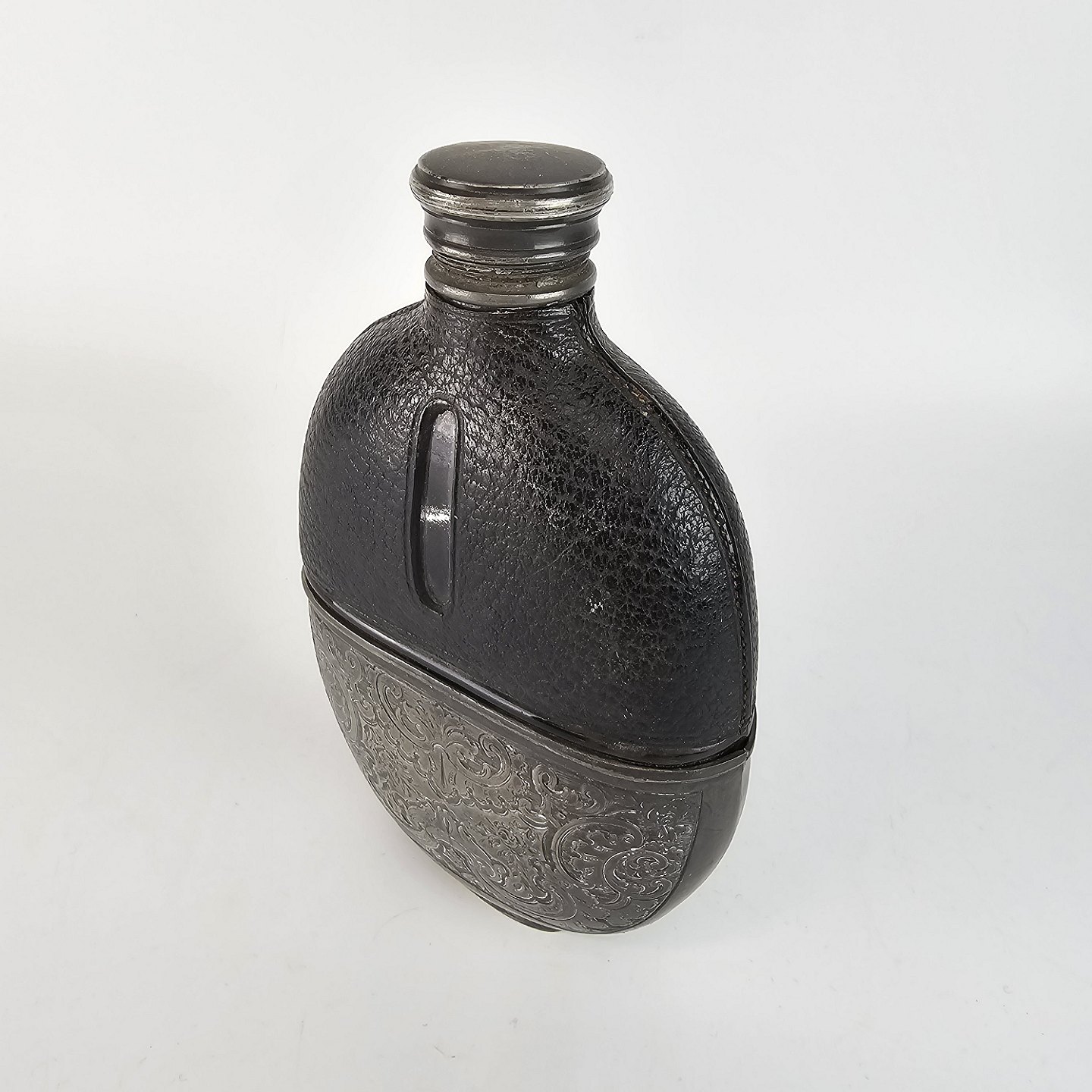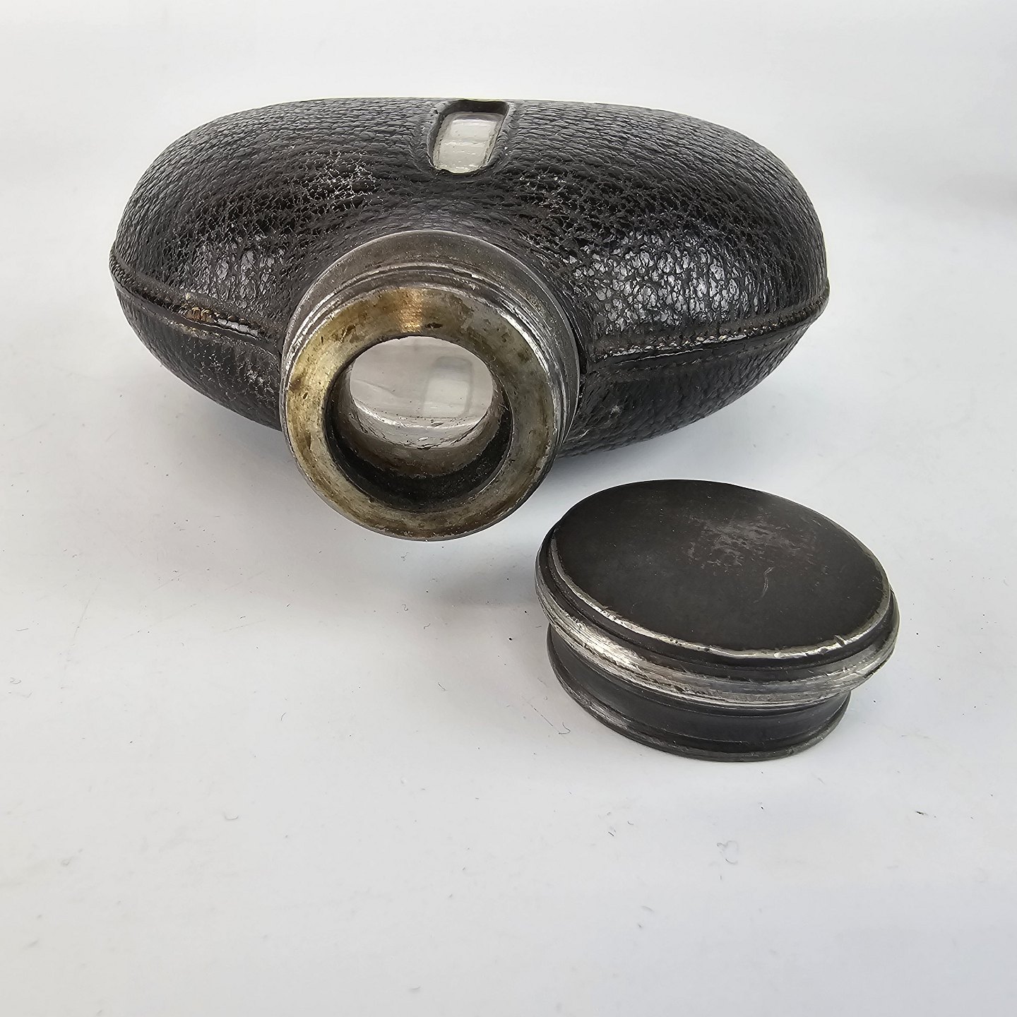 Lommelærke i glas og dekoreret med læder. Over bunden er der et aftaget krus lavet af tin