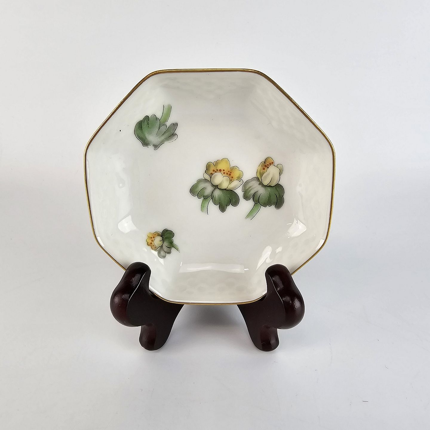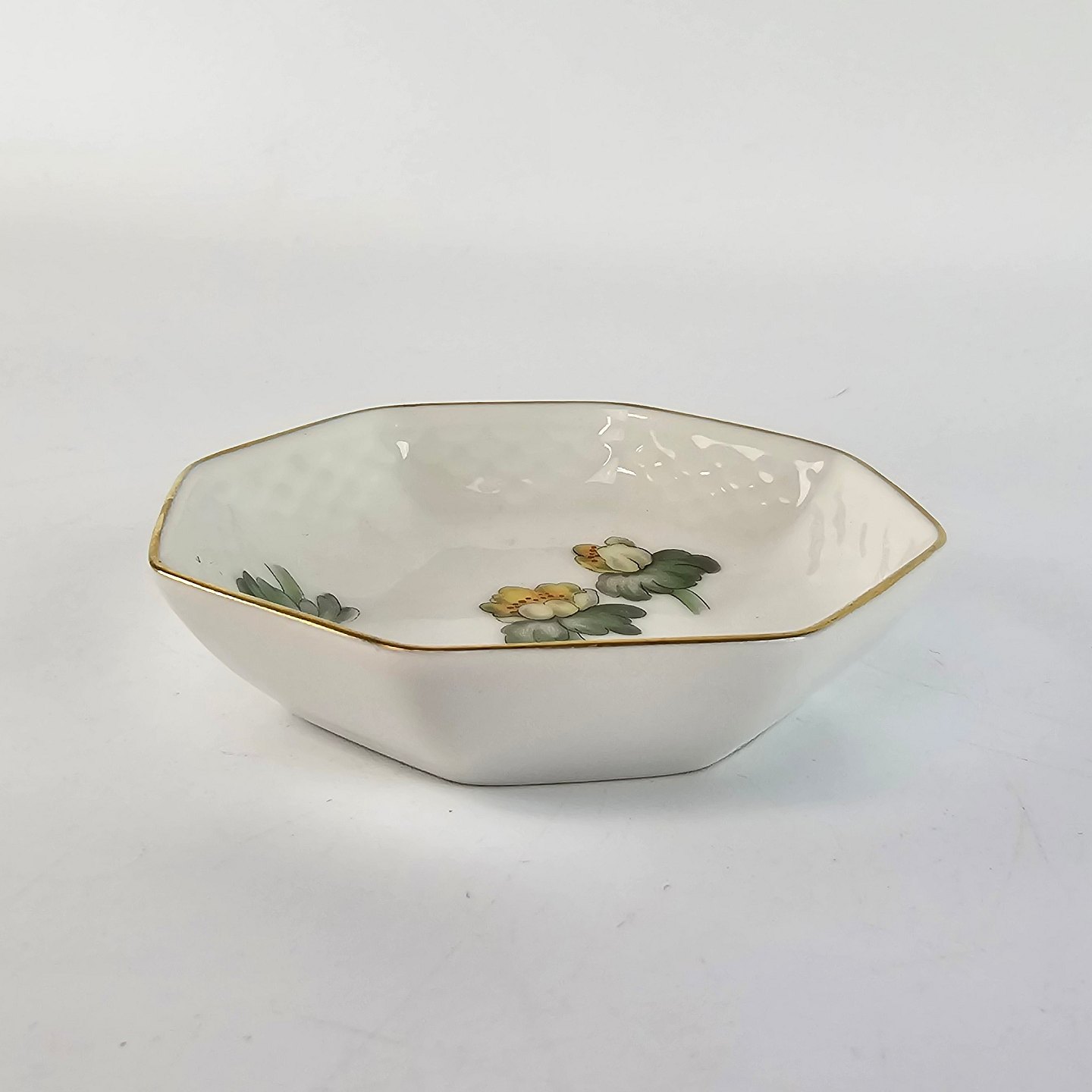 Hvidt porcelæn i skælform med dekoration af gule blomster og guldkant