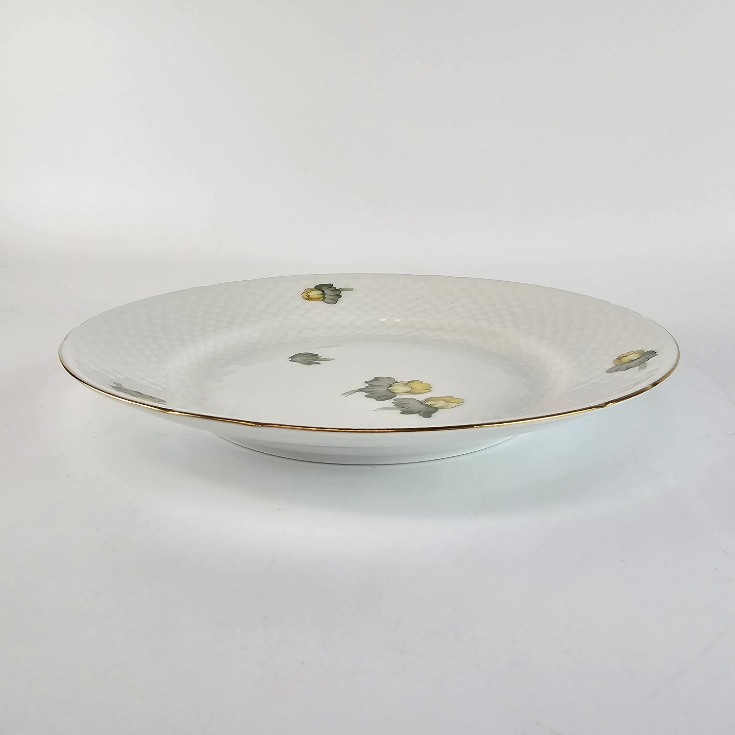 Hvidt porcelæn i skælform med dekoration af gule blomster og guldkant